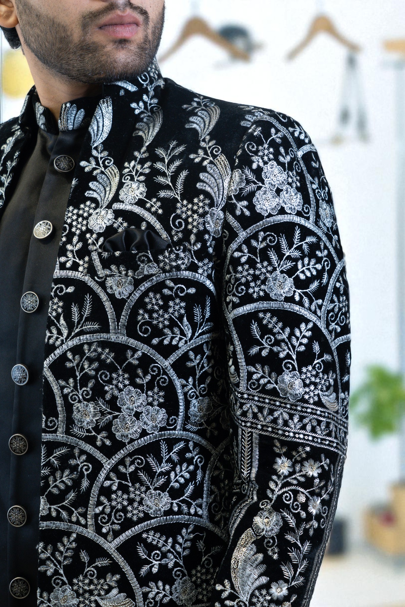 Black Indo Western Suit for Men – Silver Embroidery, Premium Suiting Fabric & Stylish Look