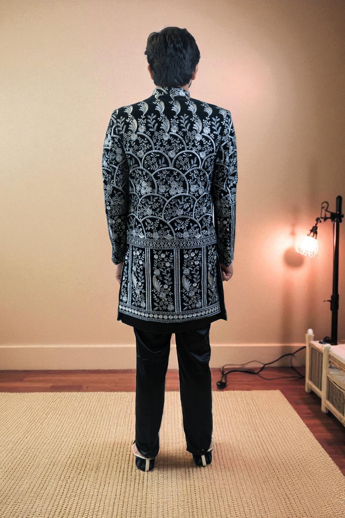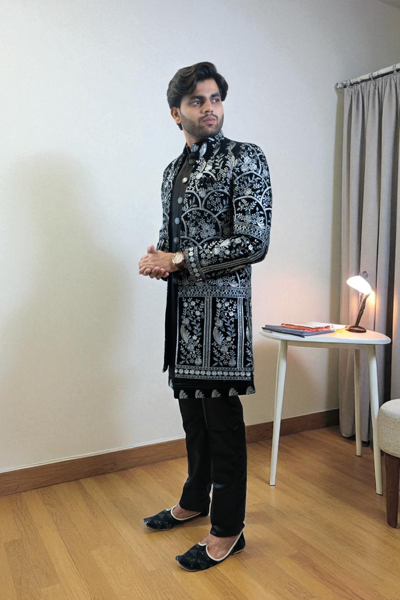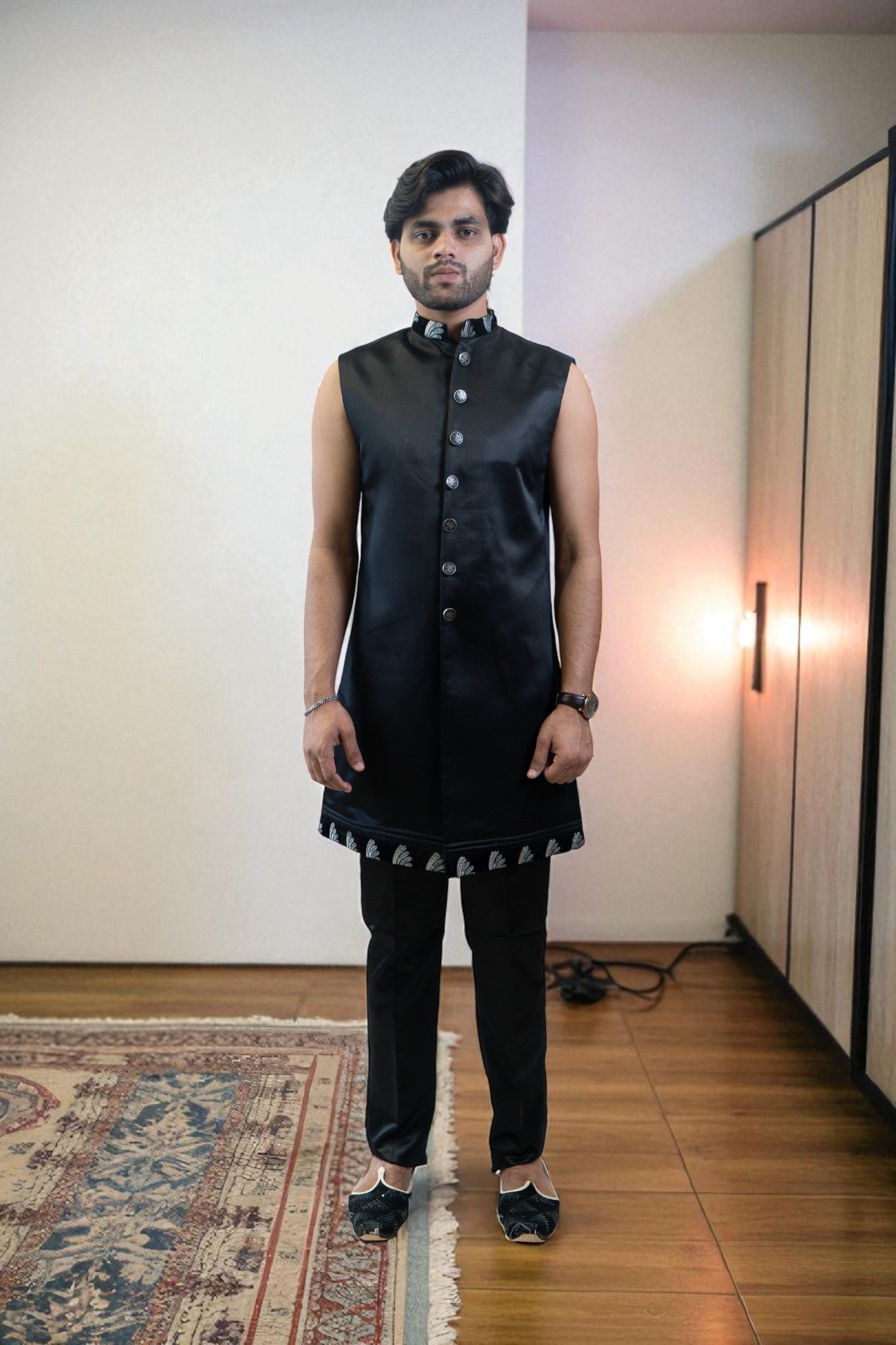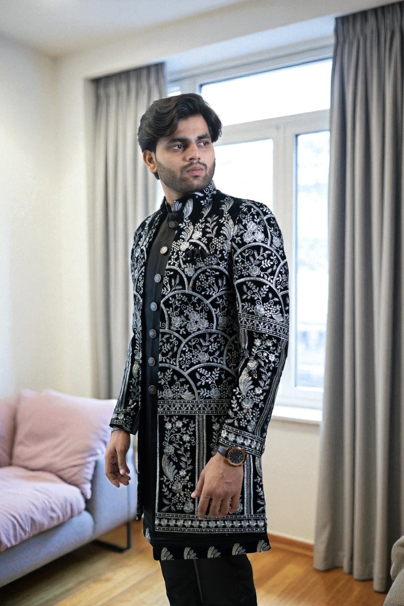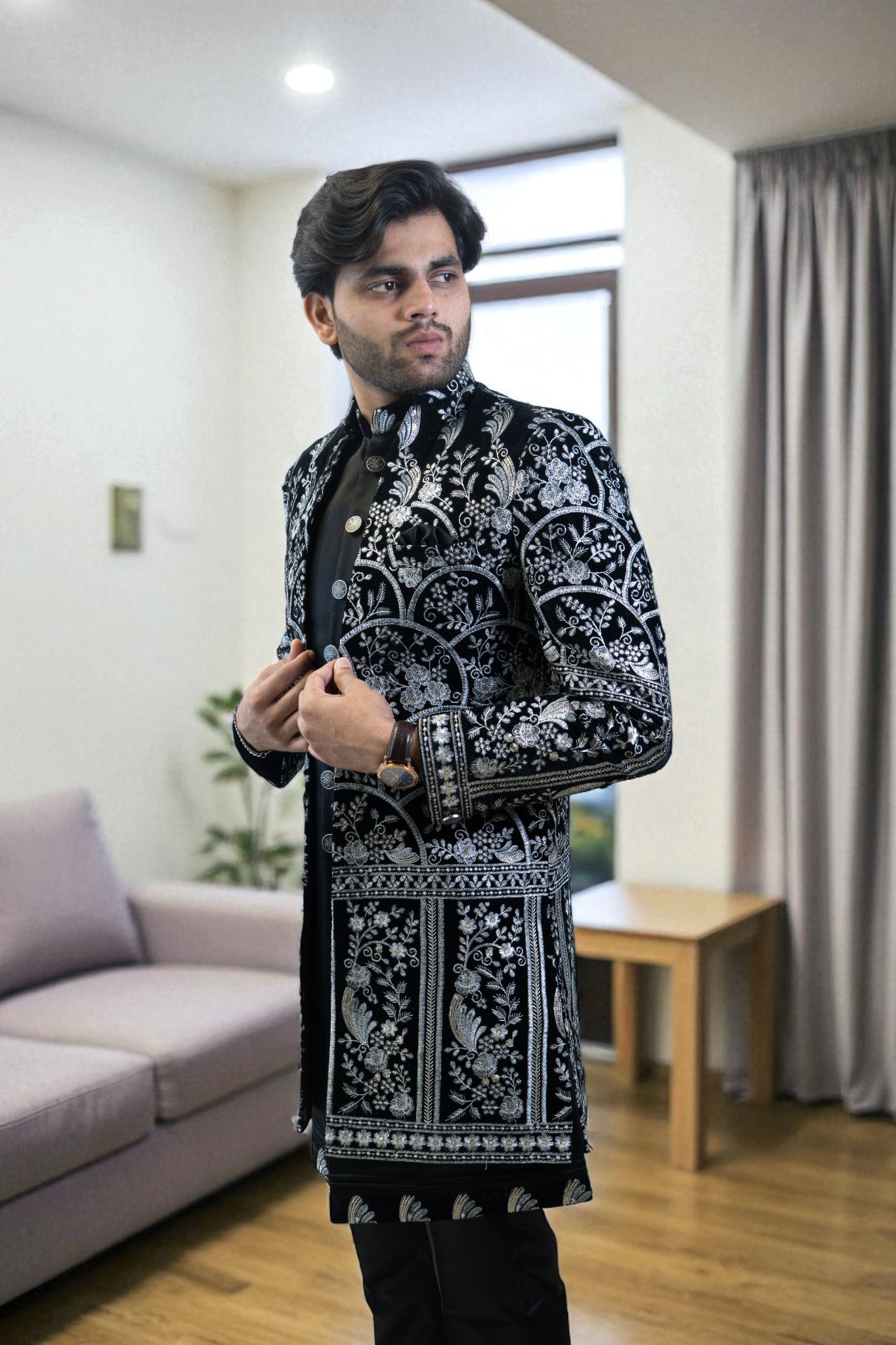 ethnic style with this Black Indo Western Suit for Men, designed using premium suiting fabric for a soft, smooth, and comfortable feel. The silver embroidery design adds a touch of luxury and sophistication, making it perfect for every special moment. Whether you’re dressing for a wedding, reception, engagement, sangeet, festival, or party, this outfit ensures you stand out with confidence and class.