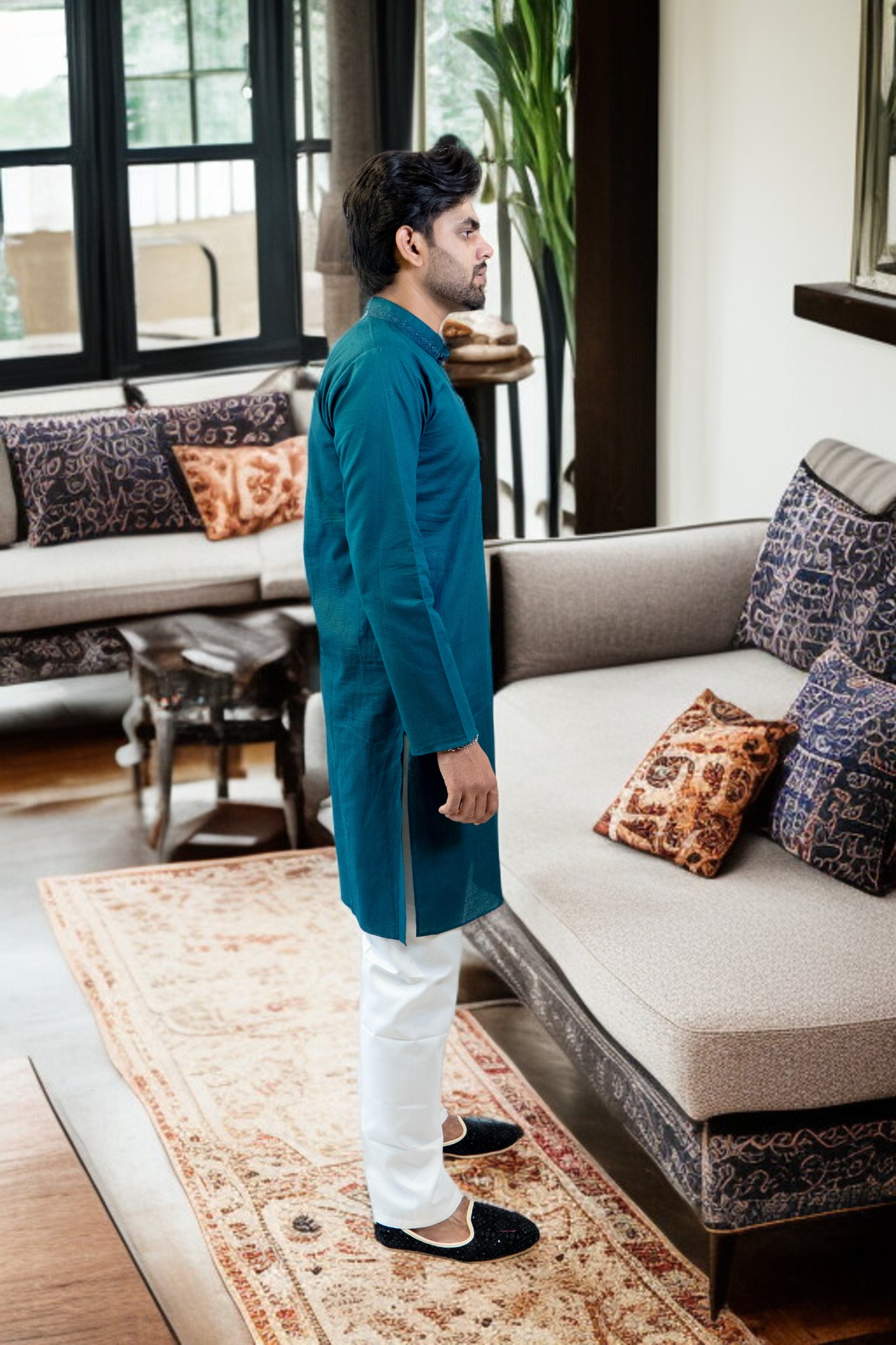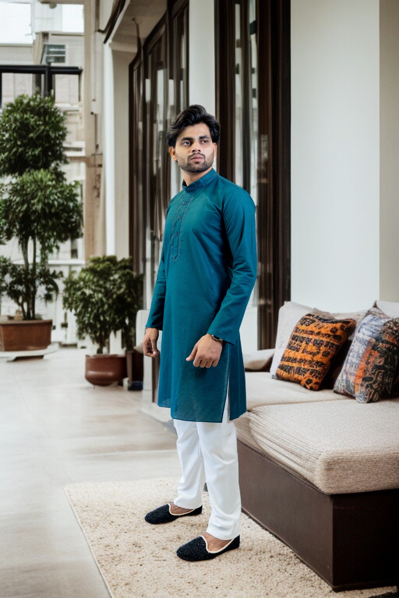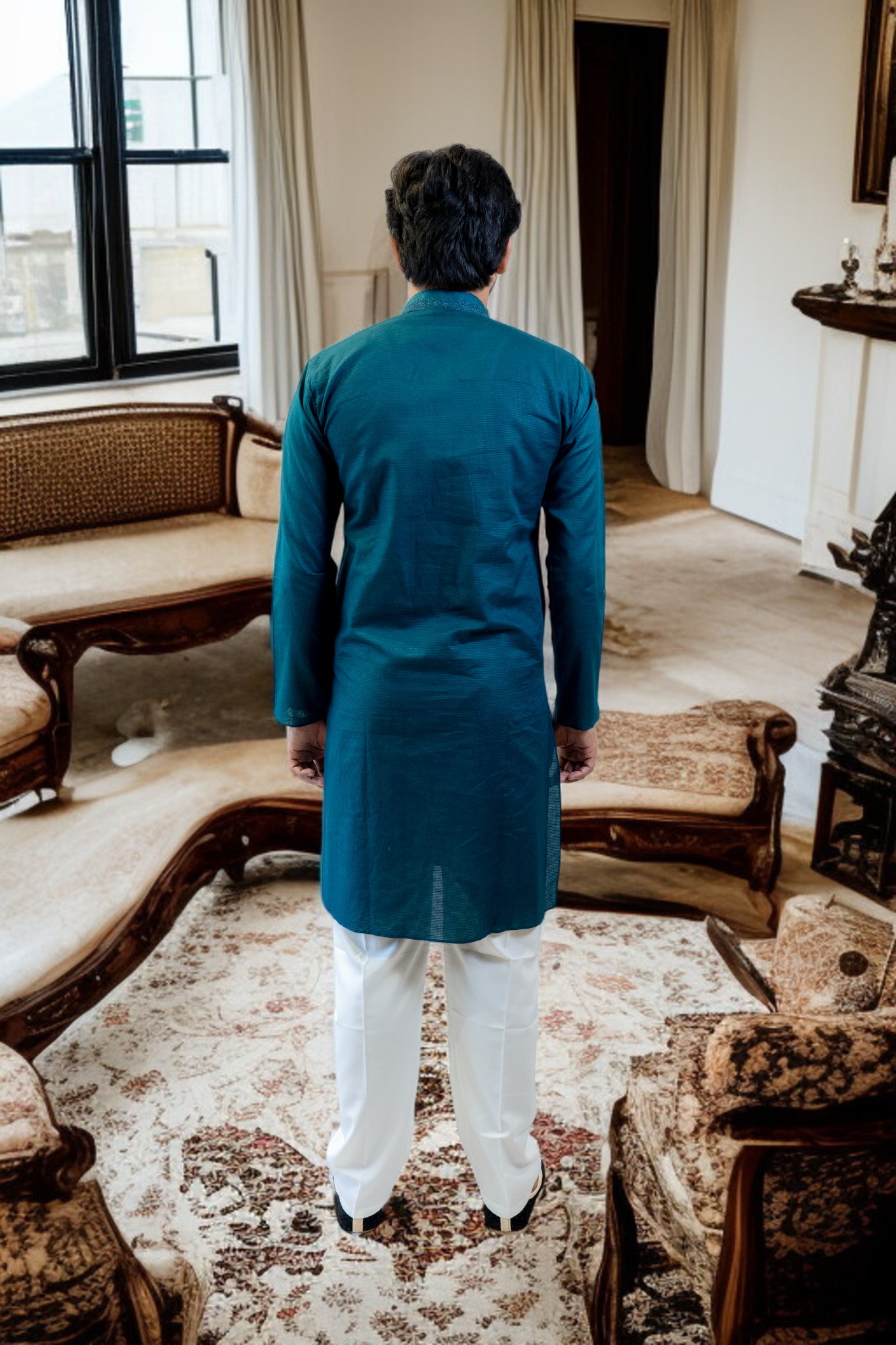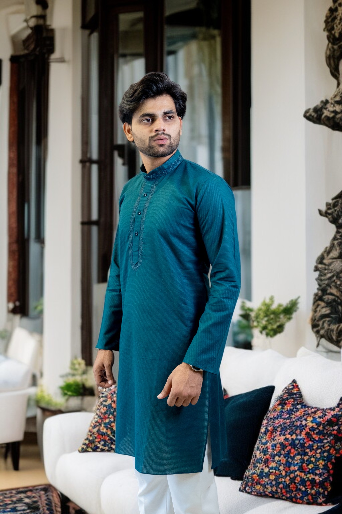blue cotton kadai kurta and white pajama set, designed for men who value both comfort and elegance. Crafted from high-quality cotton fabric, this outfit ensures breathability, softness, and all-day comfort, ideal for any season.