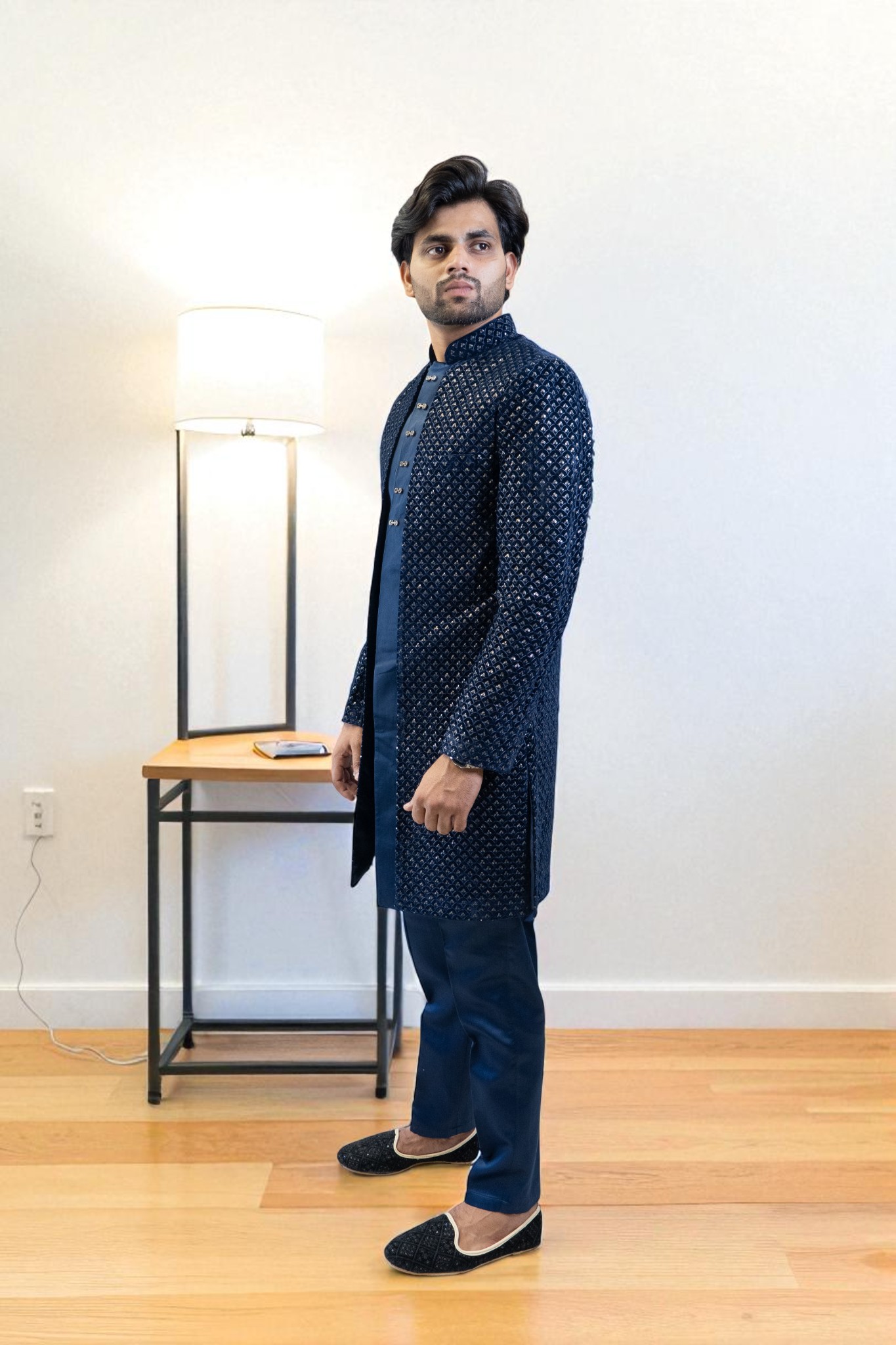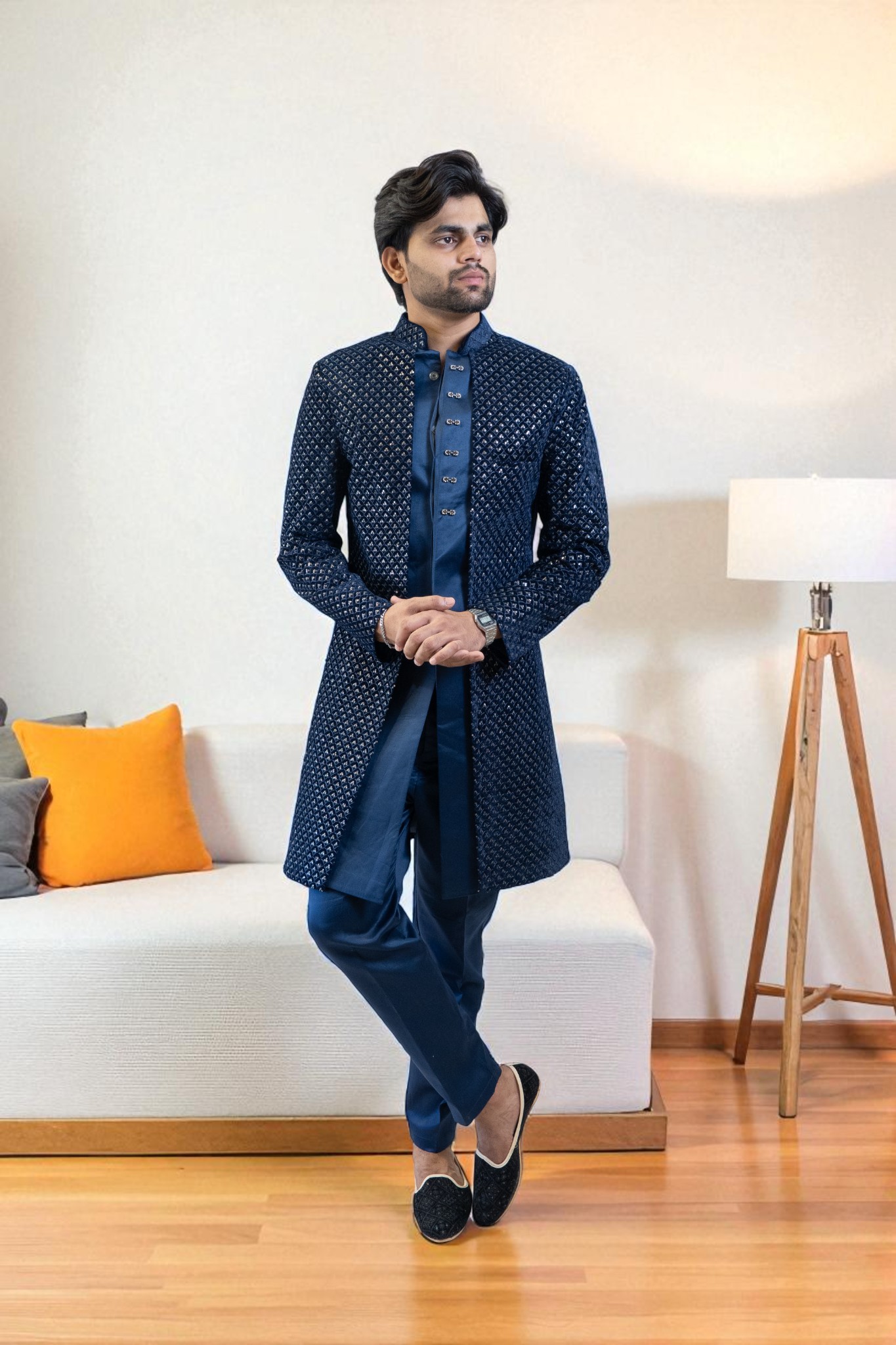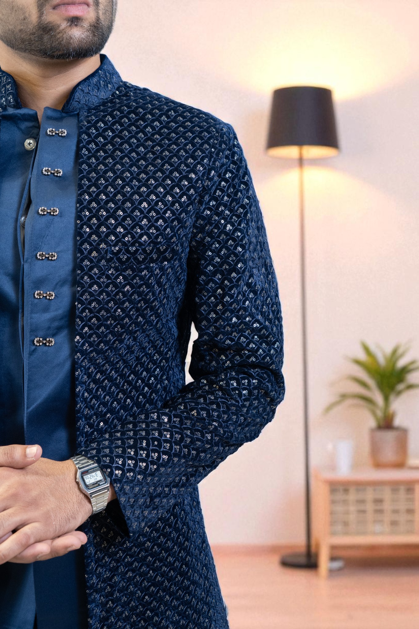 Blue Indo-Western Suit in Sharq style, crafted from premium suiting fabric for a soft and comfortable feel. The same-color pant completes the outfit, giving a neat and coordinated look.