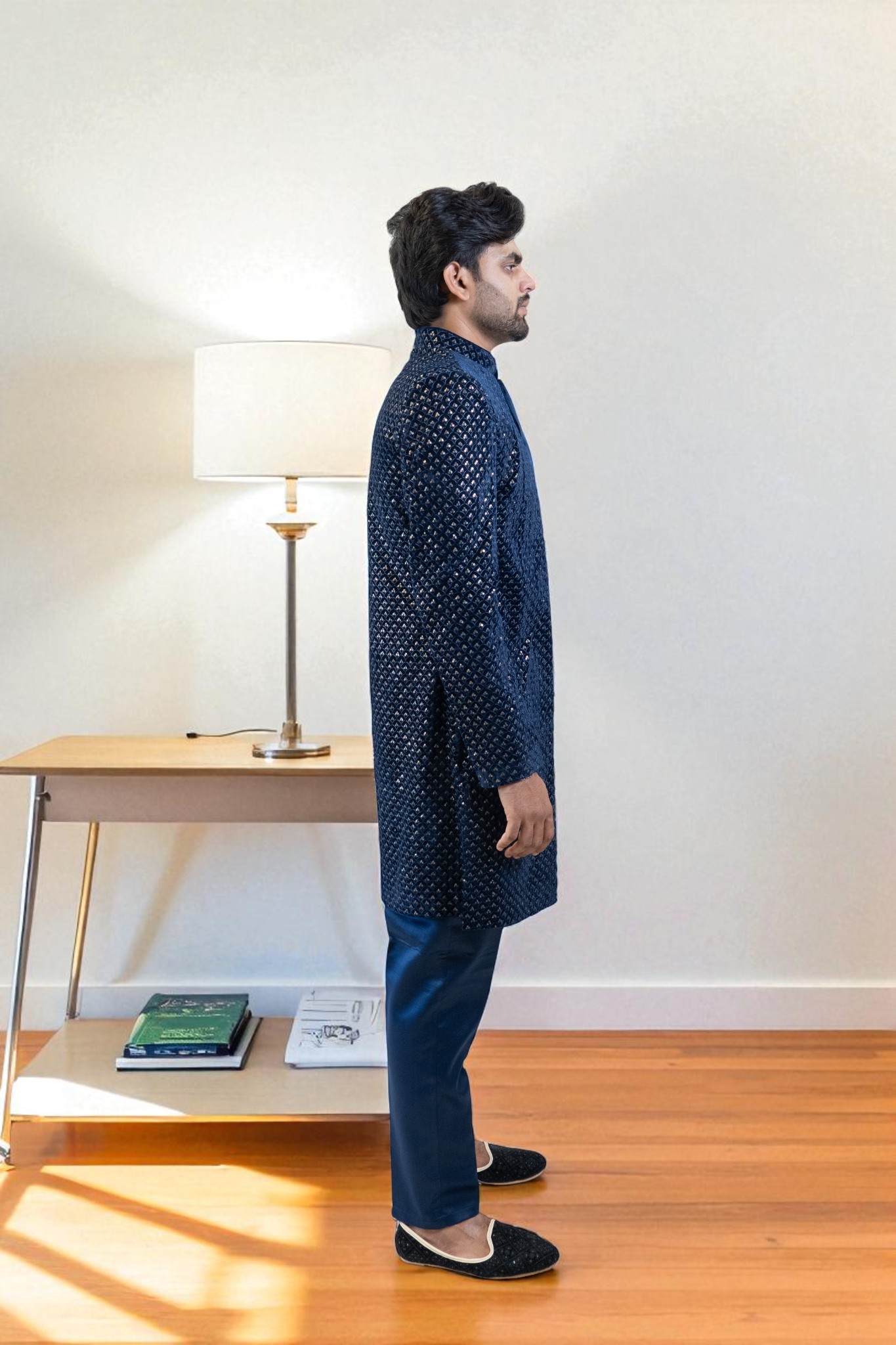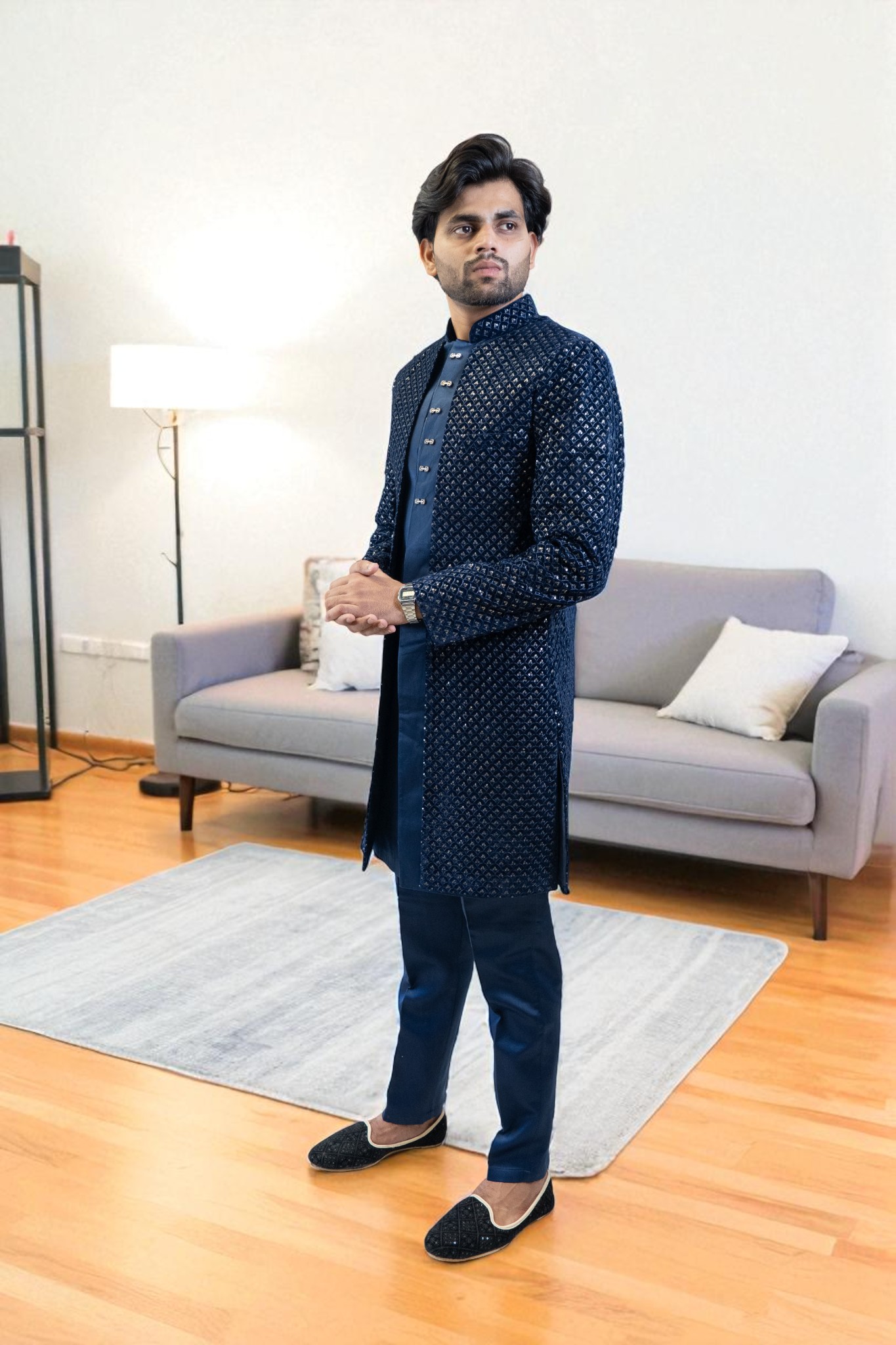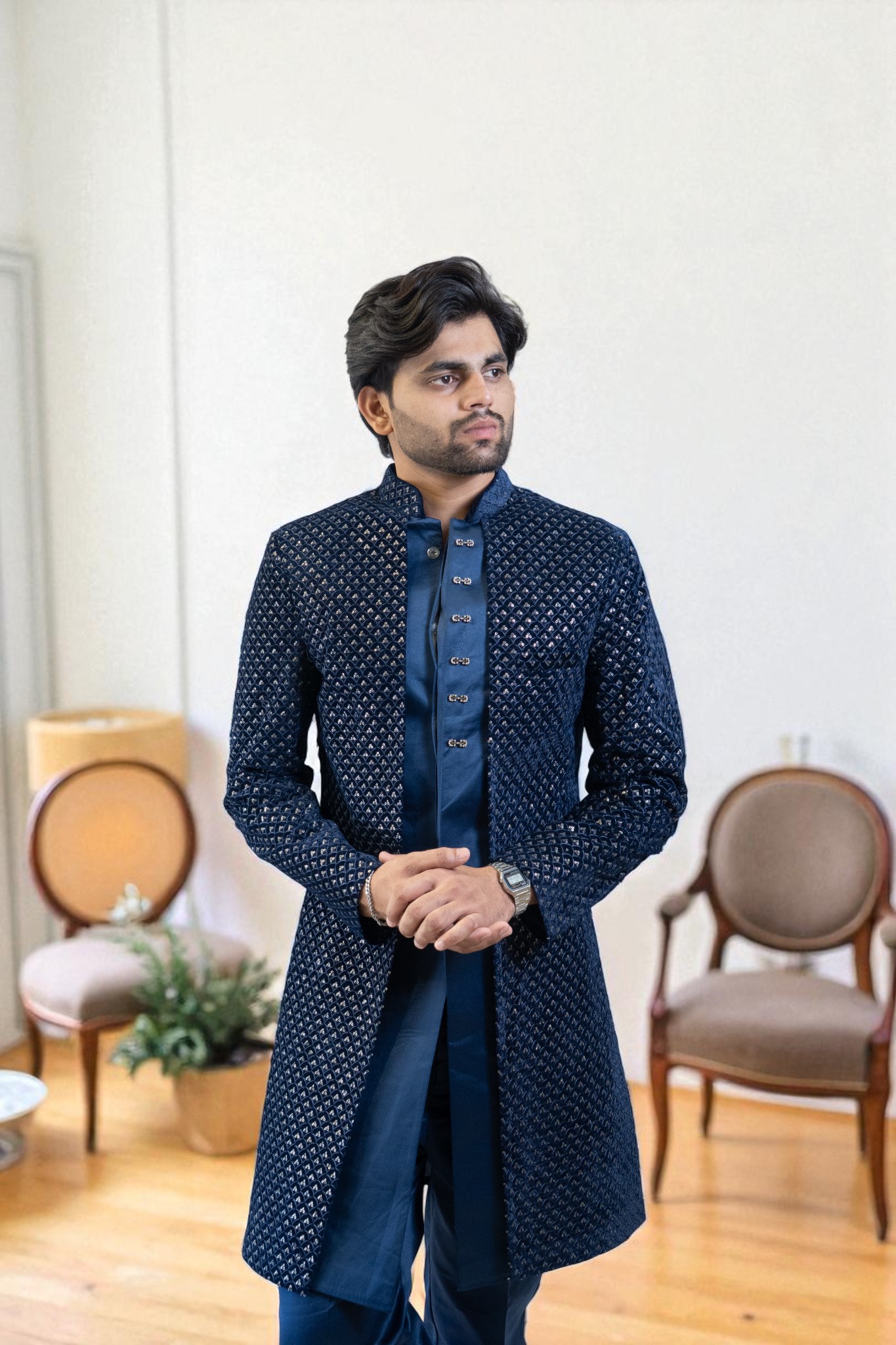 Blue Indo-Western Suit in Sharq style, crafted from premium suiting fabric for a soft and comfortable feel. The same-color pant completes the outfit, giving a neat and coordinated look.