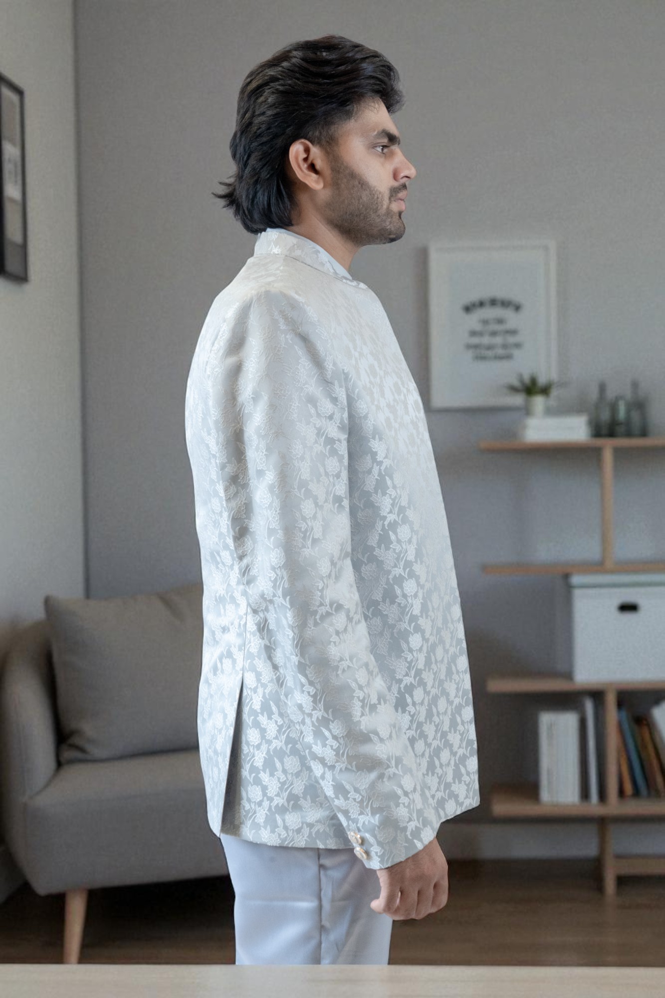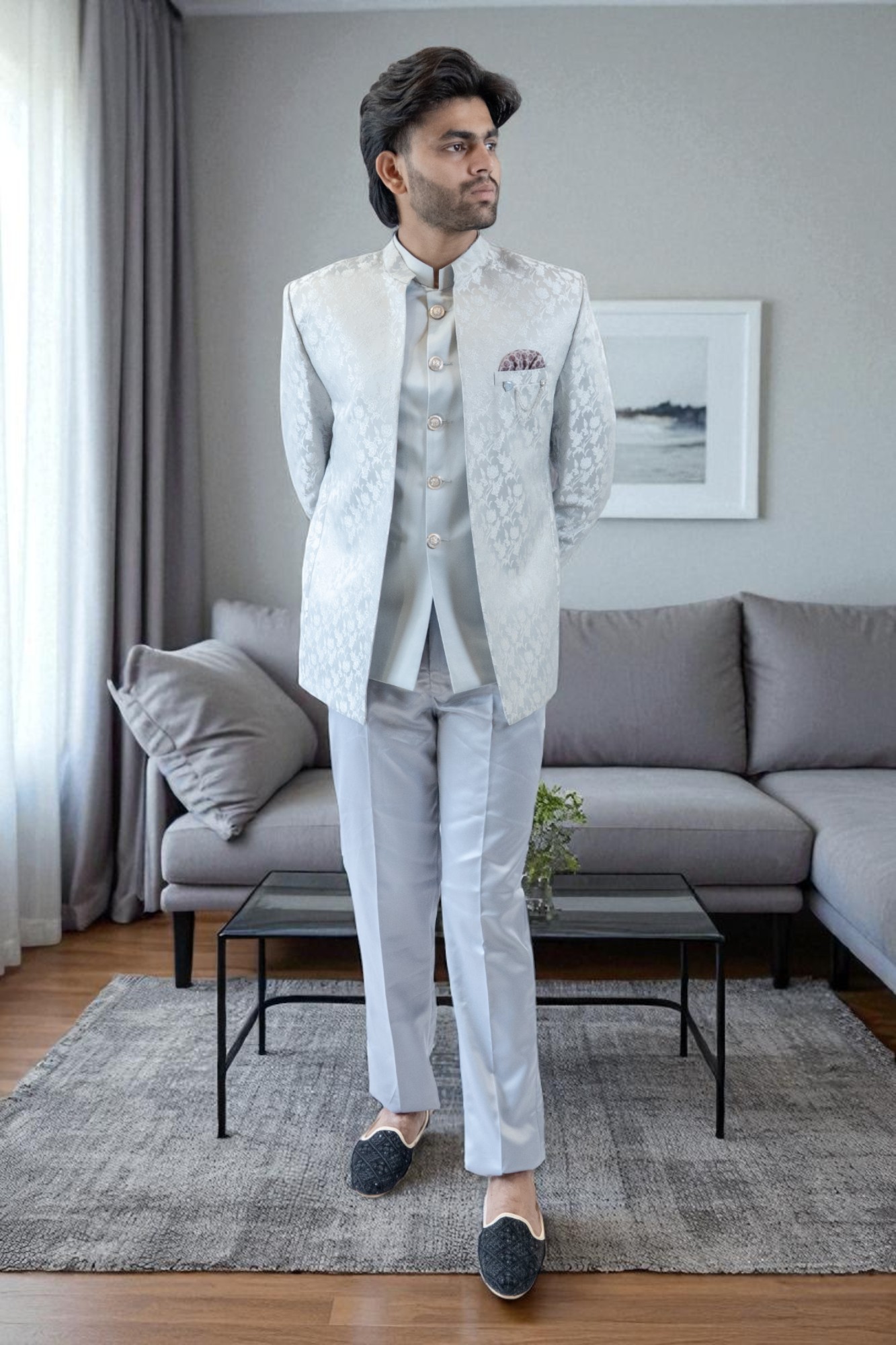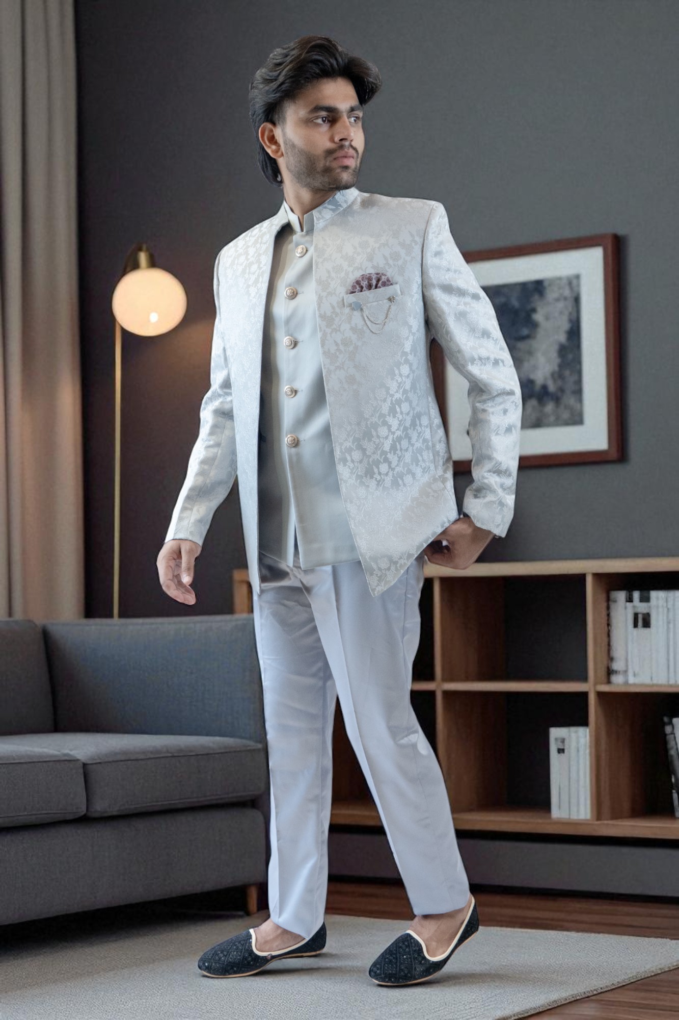 Make a royal impression with this Stylish designer grey Jodhpuri suit for party wear, crafted from premium suiting fabric. Featuring a classic Bandhgala jacket design, it blends traditional elegance with modern Indo-Western style. Perfect for weddings, receptions, festive occasions, and parties, this grey ethnic suit offers comfort, durability, and sophistication. A timeless choice for grooms and wedding guests who want to showcase refined fashion with a royal touch.