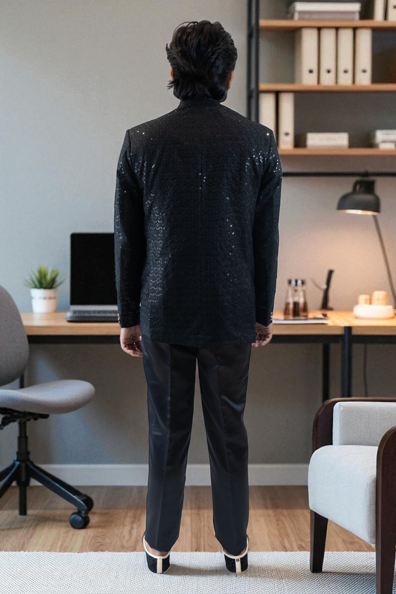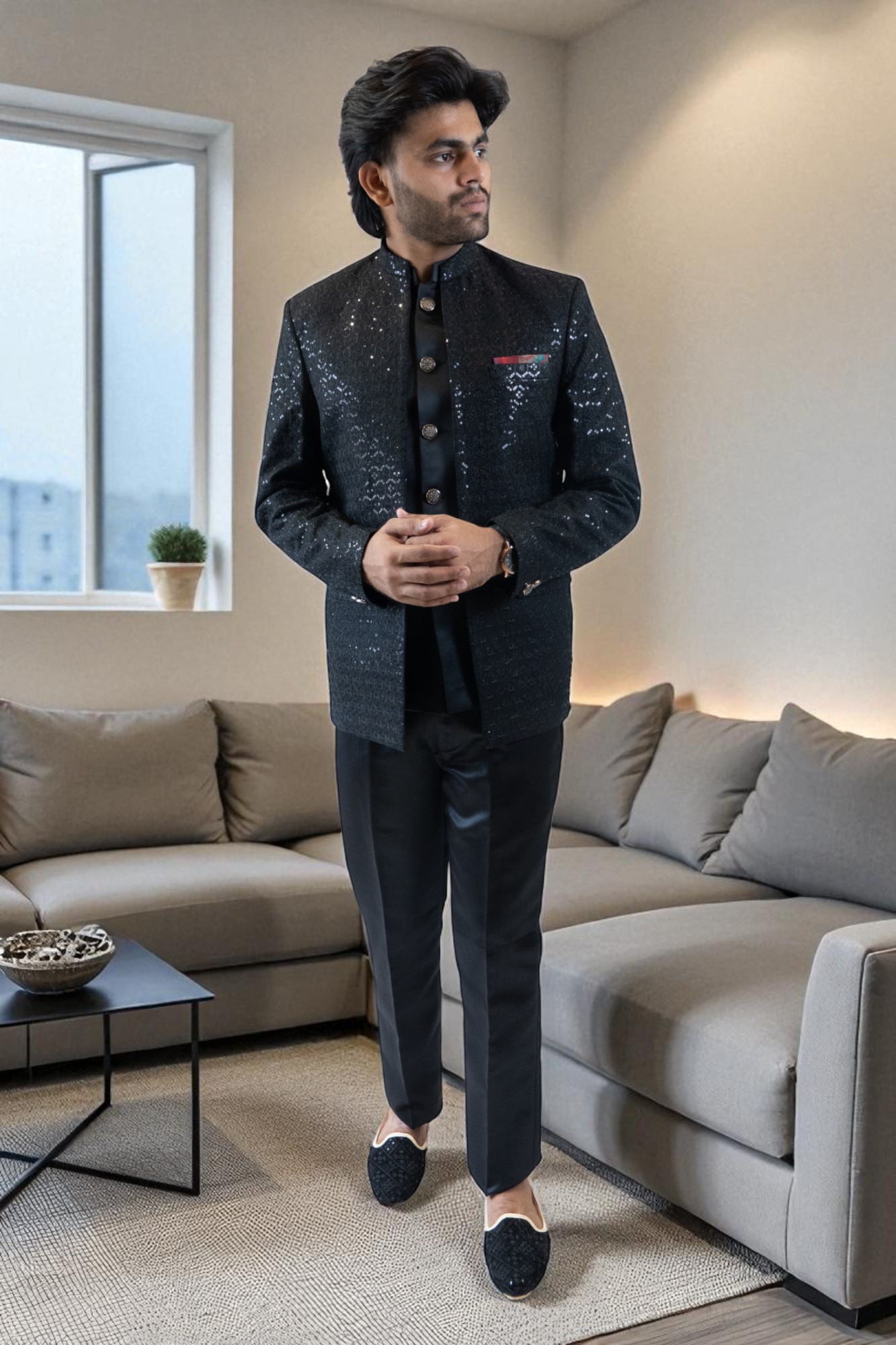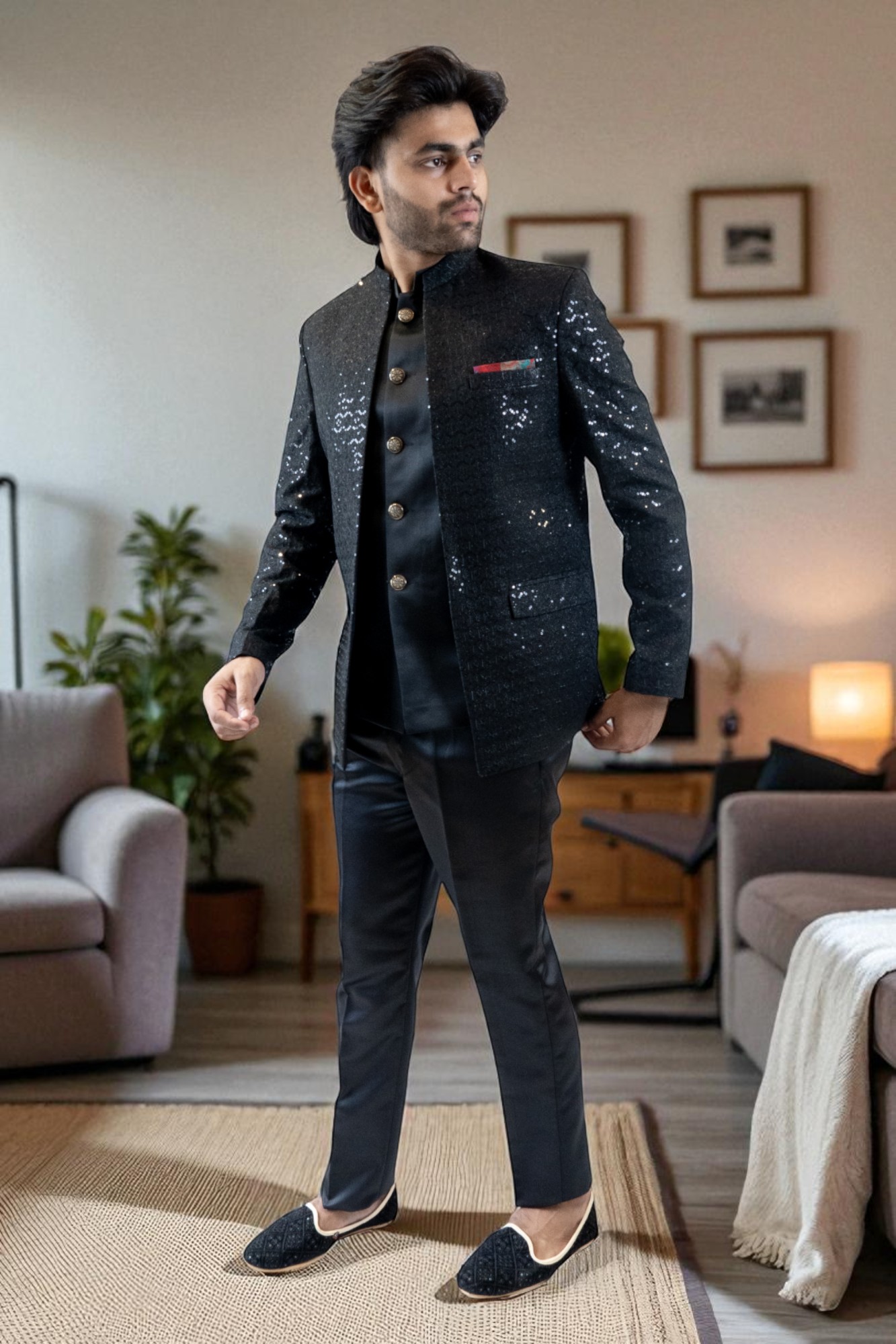 Make every occasion memorable with this handcrafted Jodhpuri suit, designed with rich suiting fabric and elegant sequin detailing. Perfect for cultural ceremonies, weddings, and festive gatherings, it blends traditional artistry with modern sophistication. The fine craftsmanship and premium finish ensure a royal presence and lasting comfort. Pair it with matching accessories to complete your regal look. A timeless outfit that truly defines heritage and class.