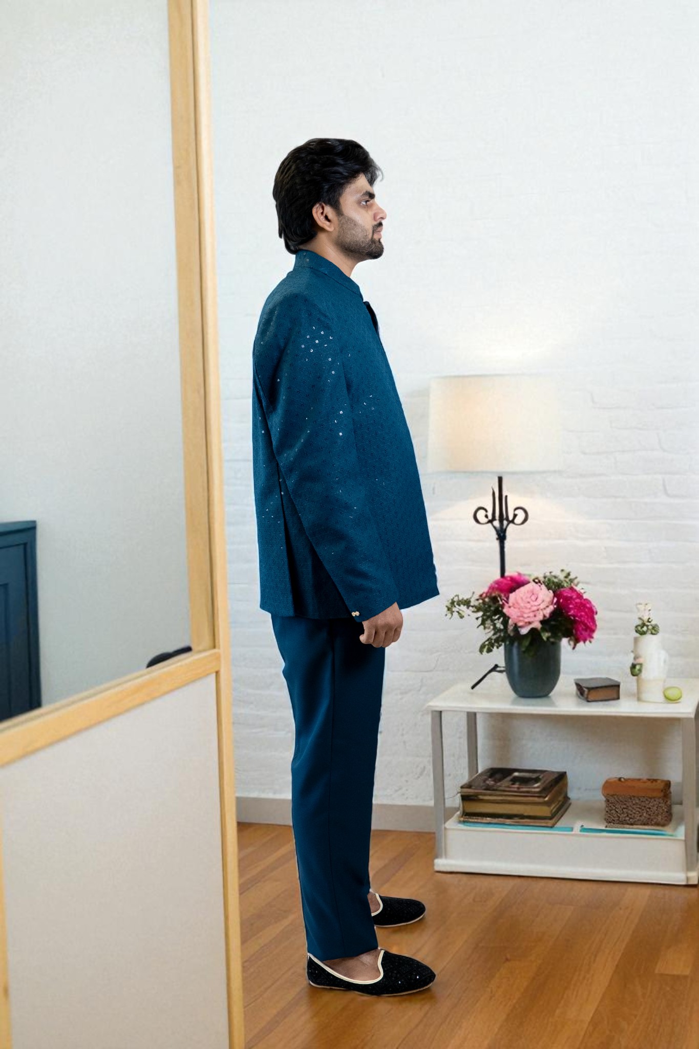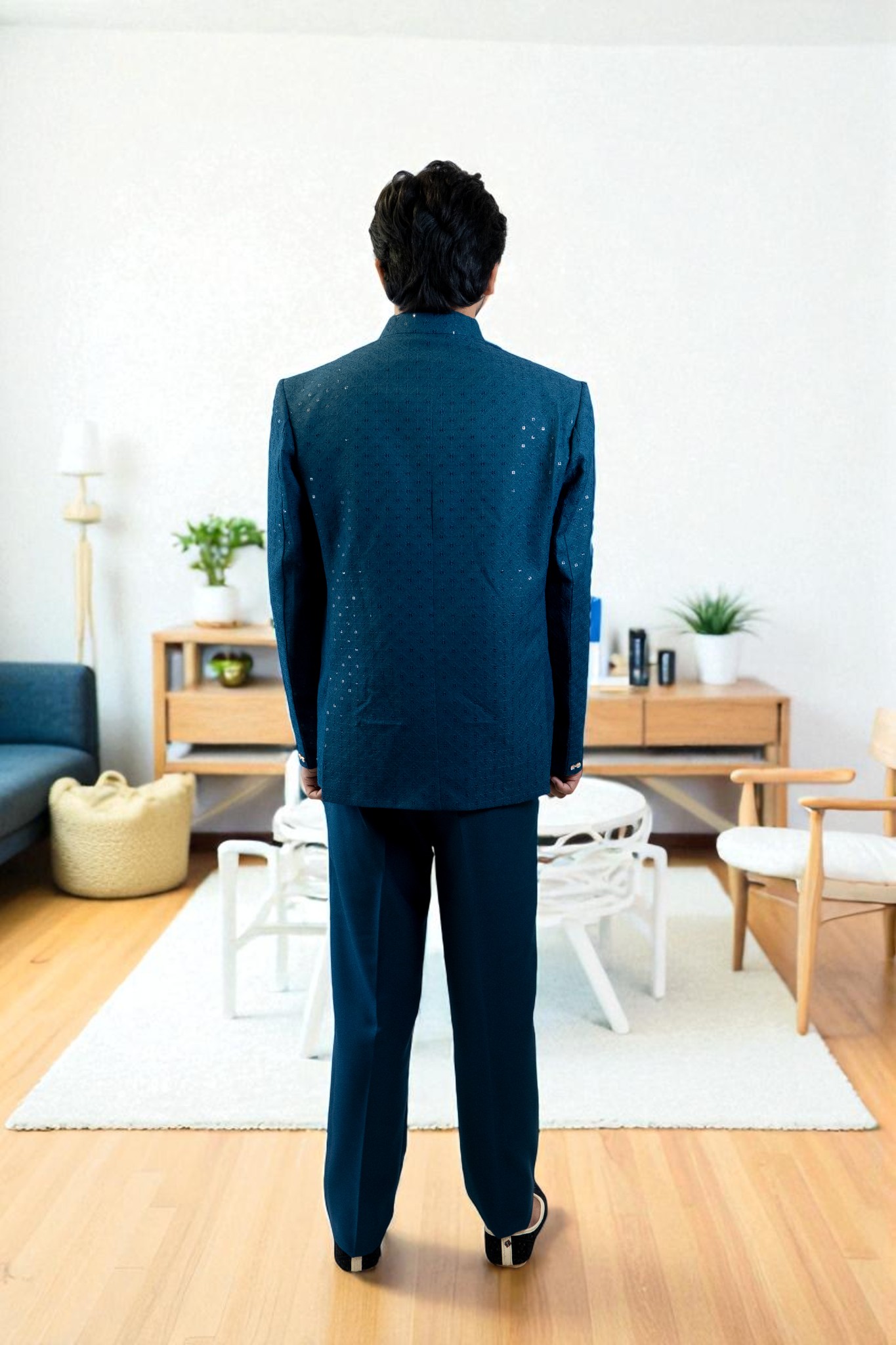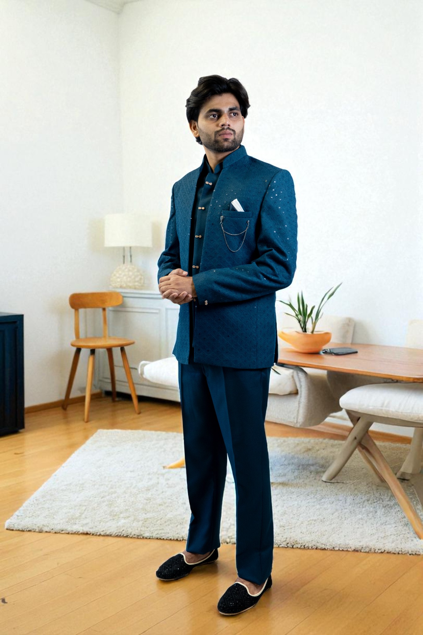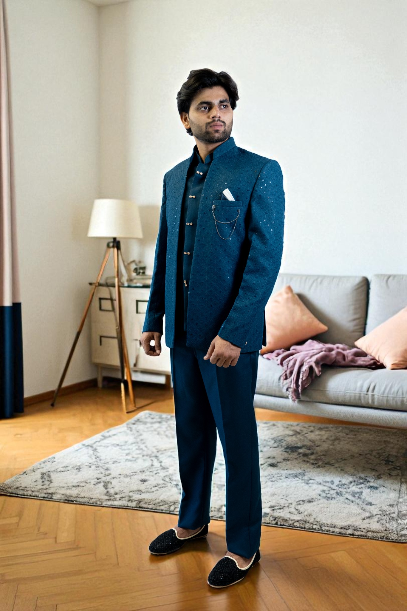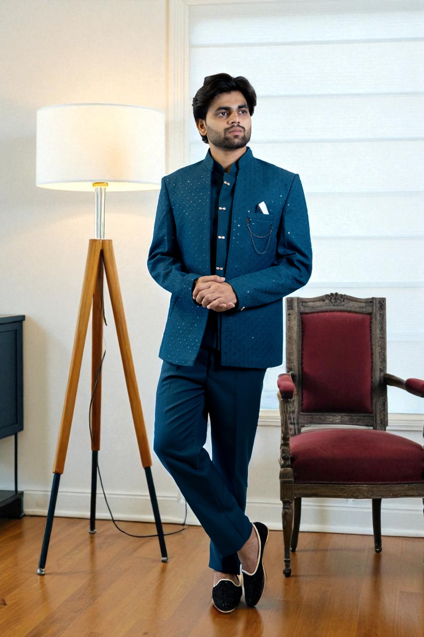 Look elegant in this Dark Blue Jodhpuri Suit, made from premium suiting fabric with stylish multi-design thread work for a classy and royal appearance. The same-color pant completes the outfit, perfect for parties, weddings, receptions, and festive occasions.