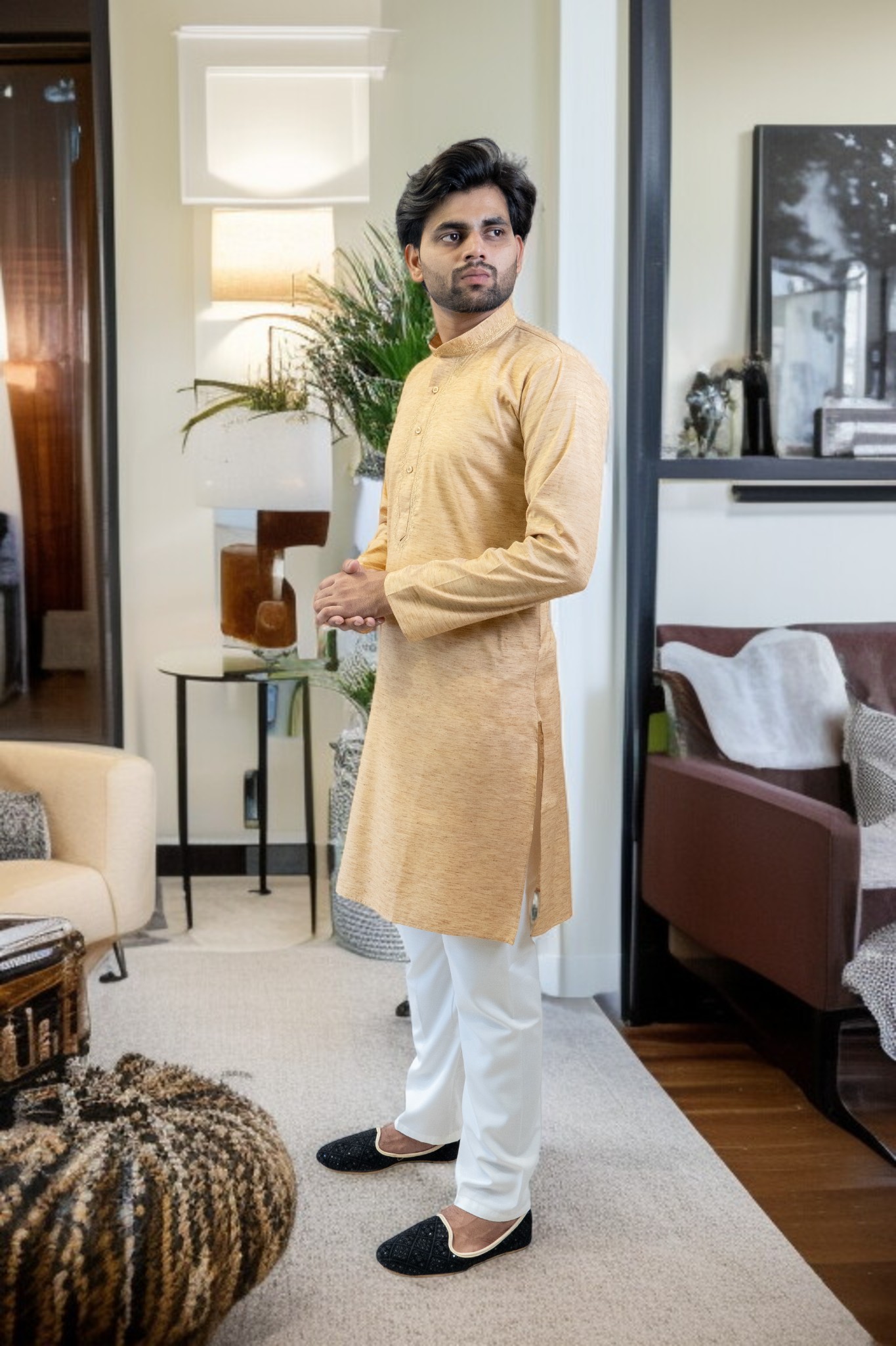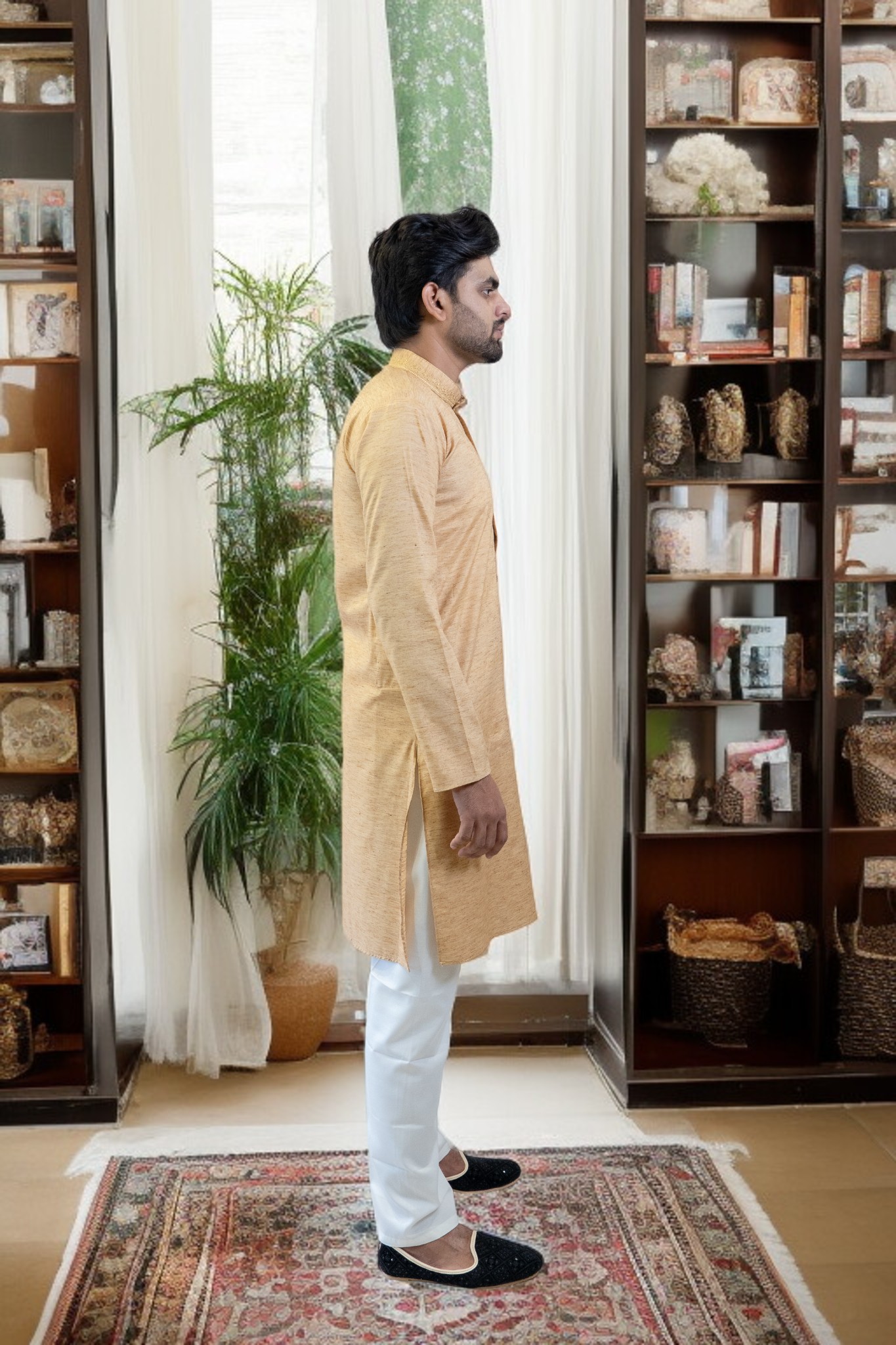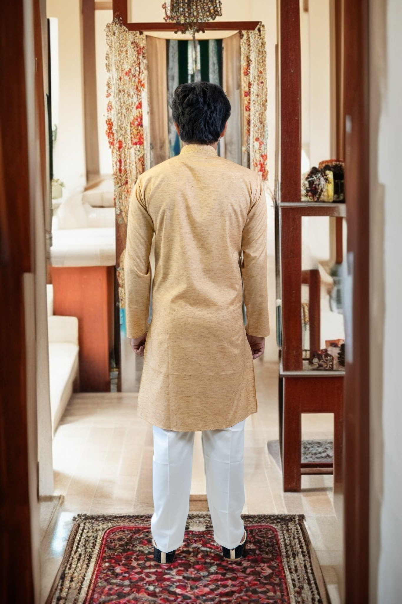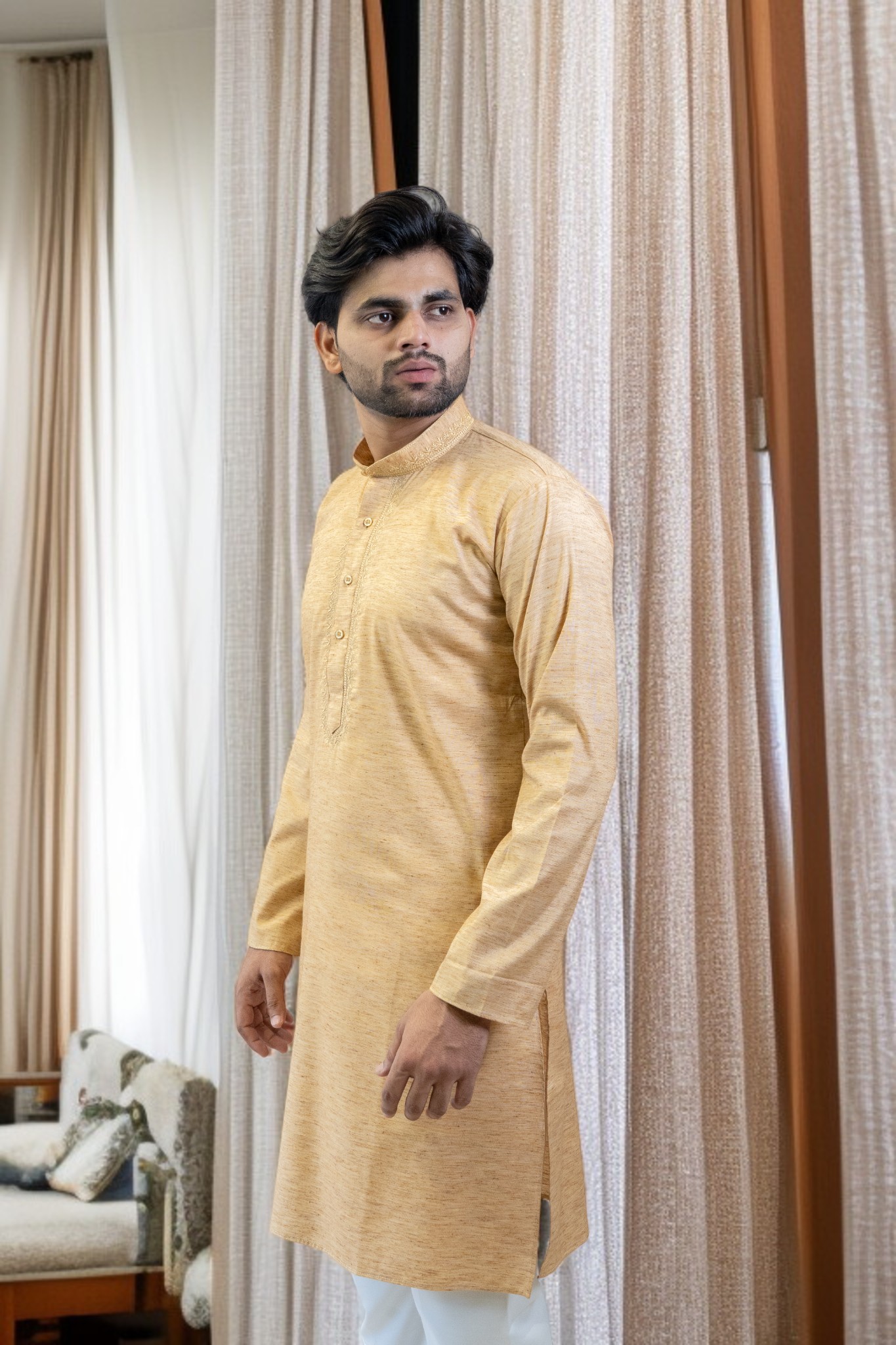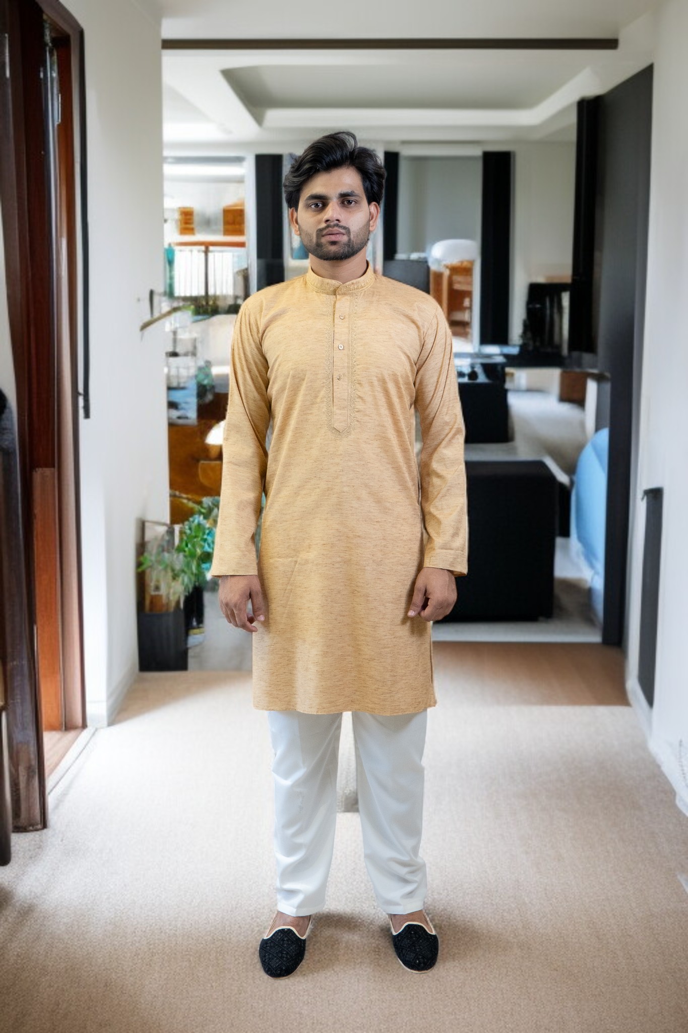 dark gold kurta pajama for men, crafted from 100% pure cotton. The fine gala embroidery design gives a rich traditional look, while the soft cotton fabric keeps you cool, fresh, and comfortable all day long.