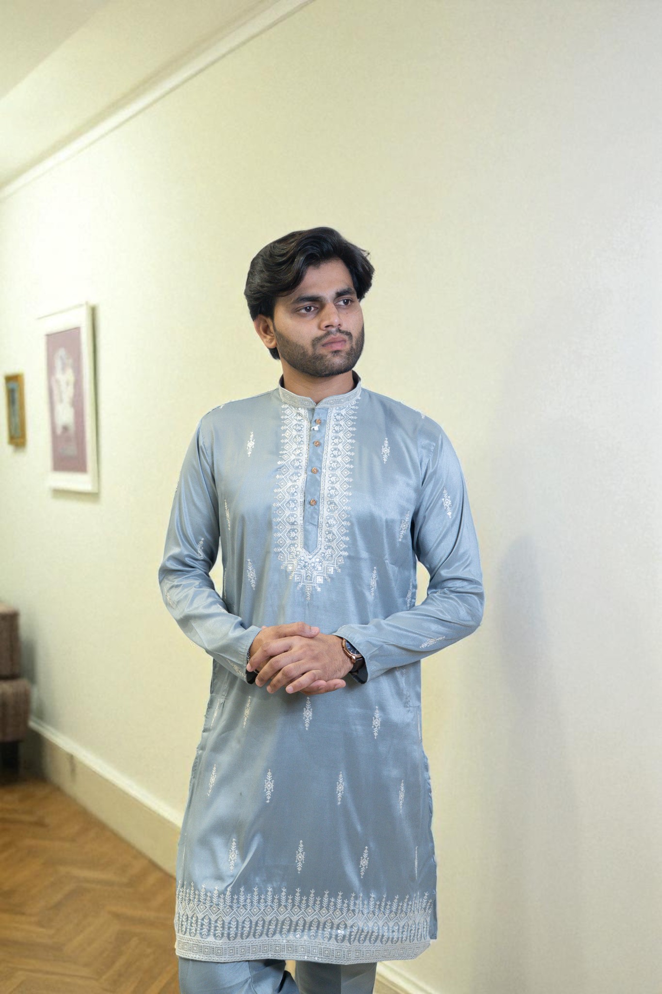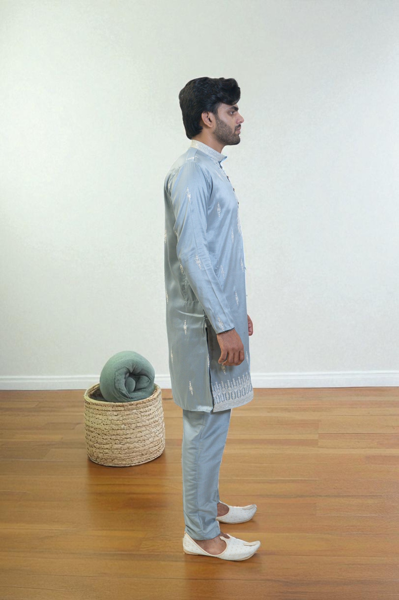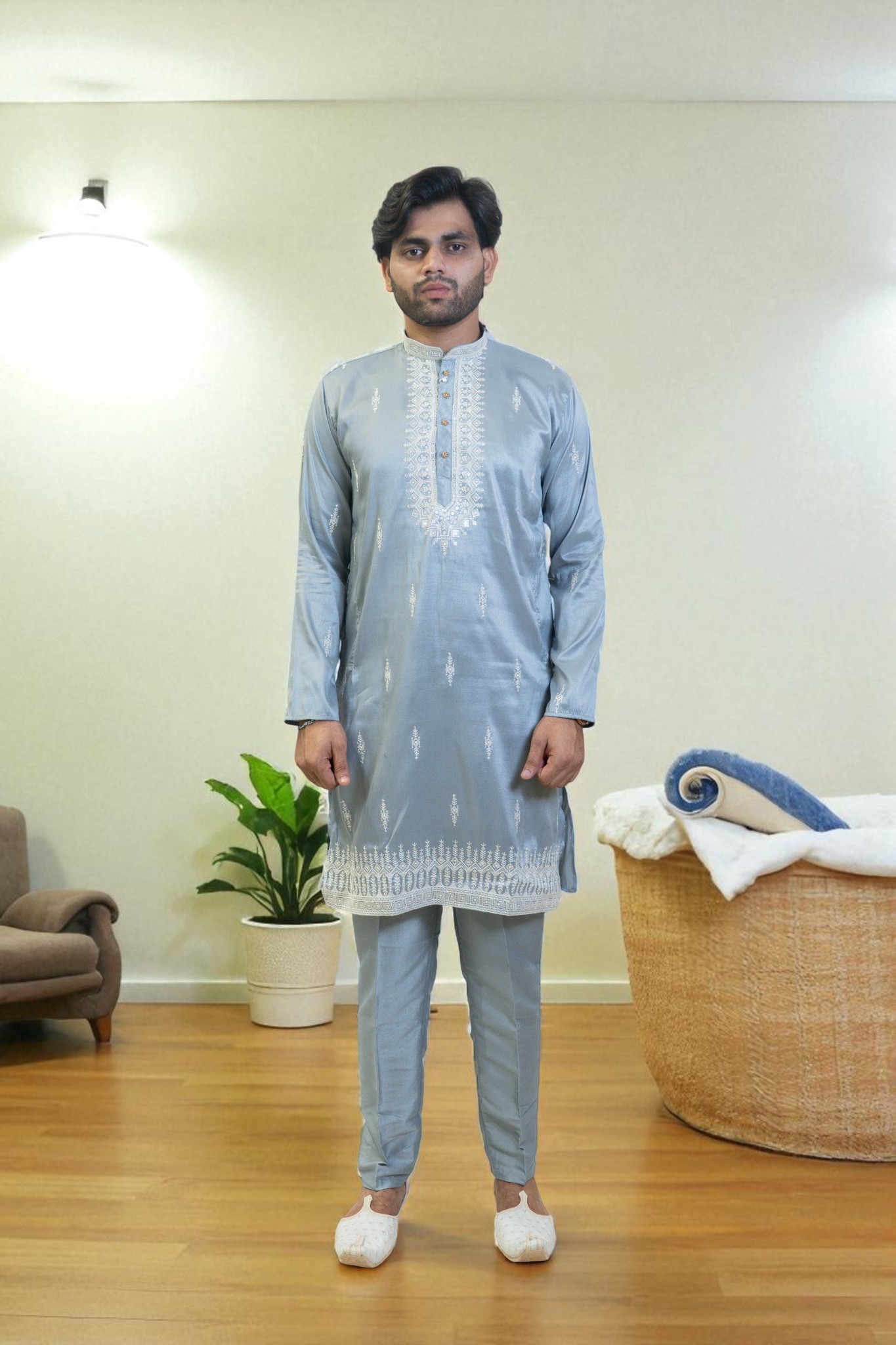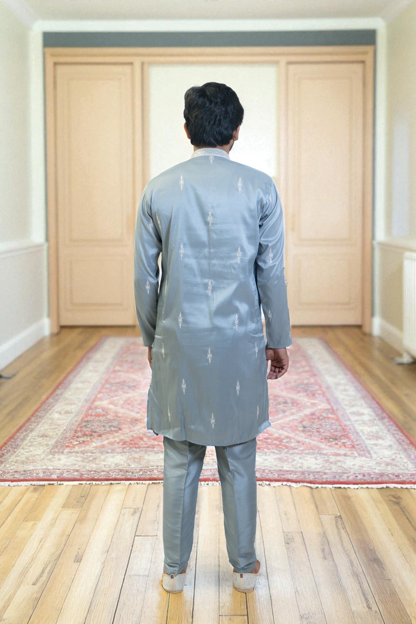 Grey Hand-Embroidered Cotton Silk Kurta Pajama