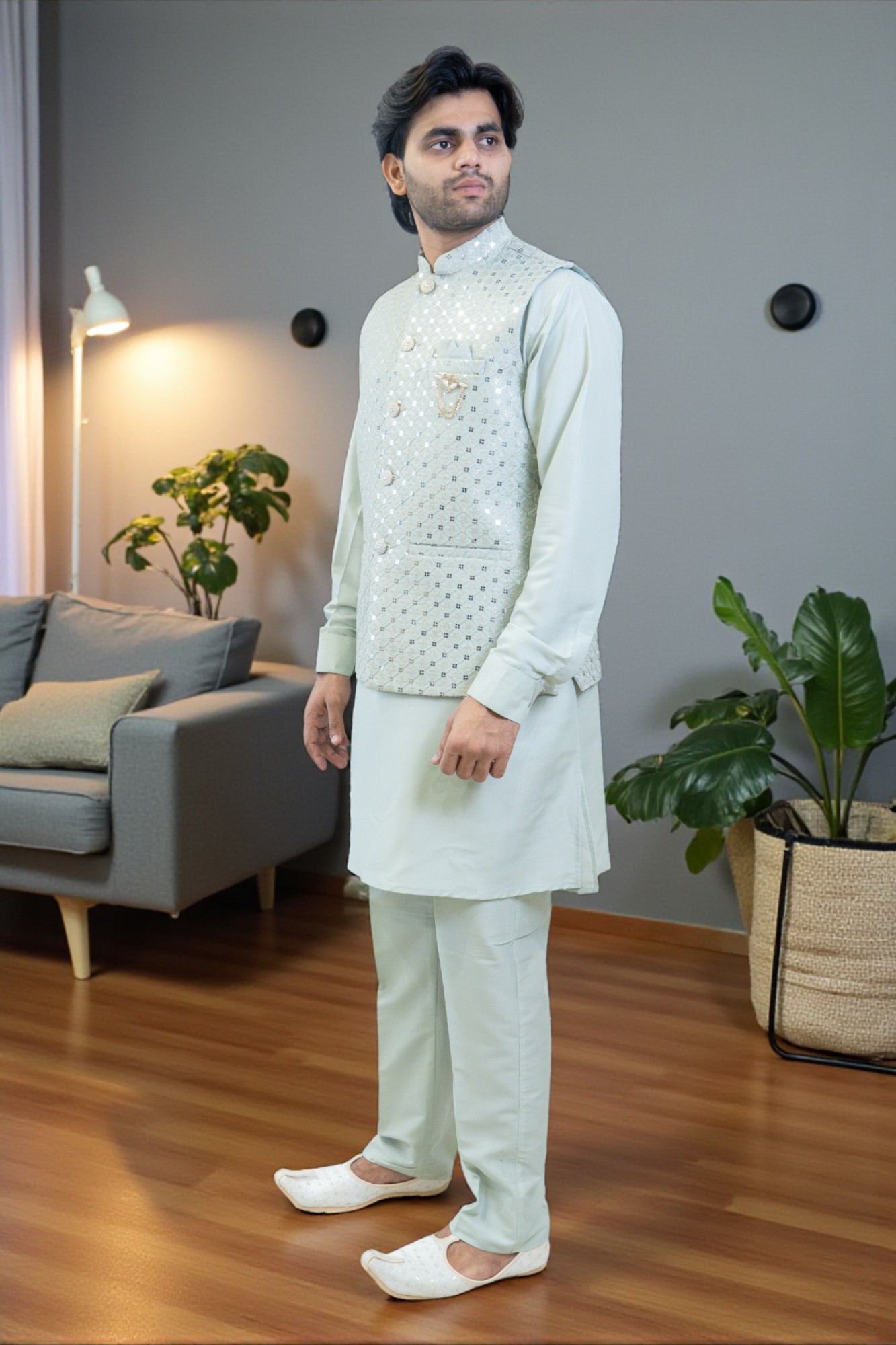 Grey Kurta Jacket Set. The kurta is made from soft rayon silk fabric, providing a smooth and comfortable feel all day. The jacket features a sparkling sequin design, giving a modern and elegant look that is perfect for weddings, parties, festivals, and family gatherings.