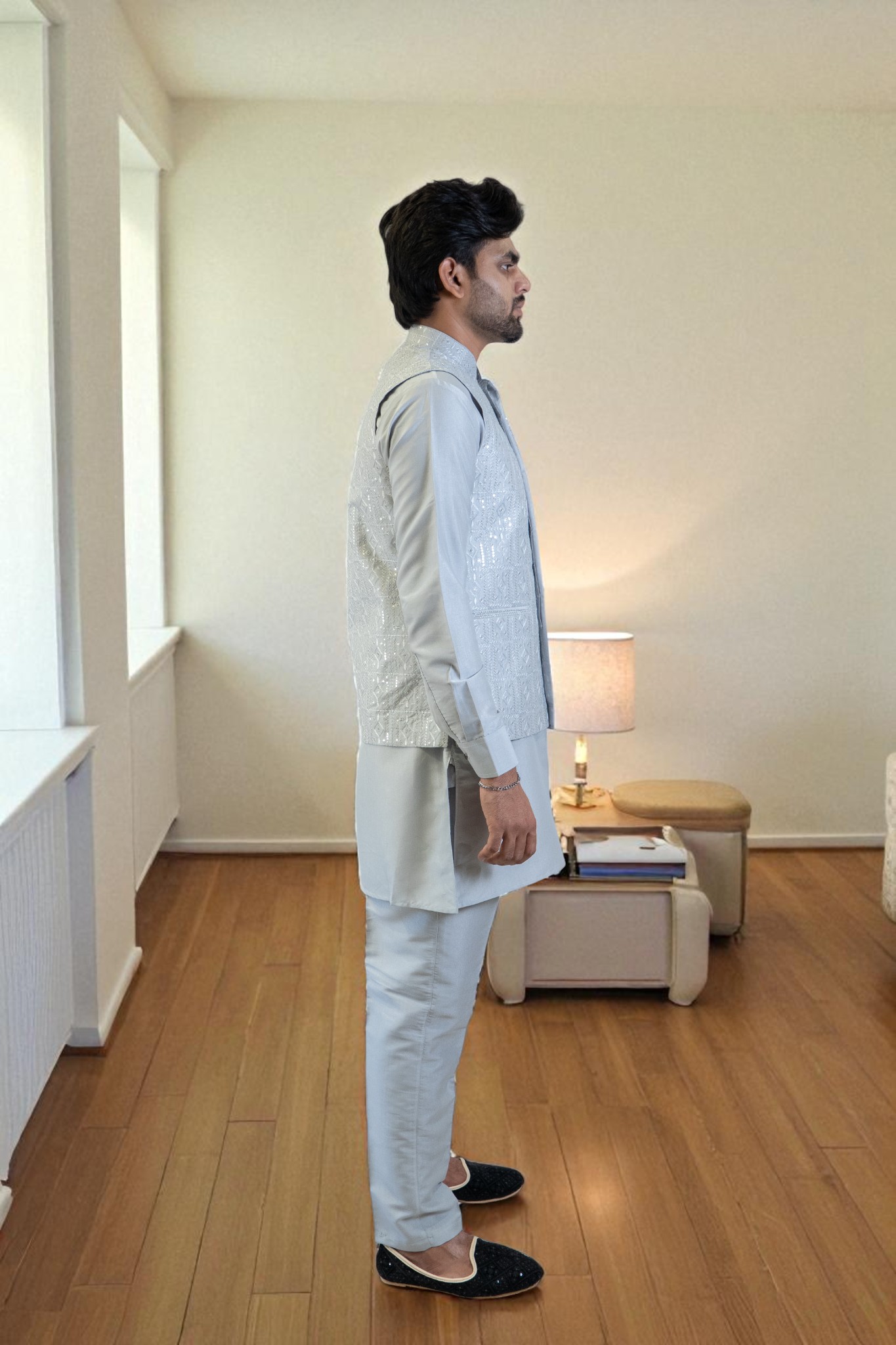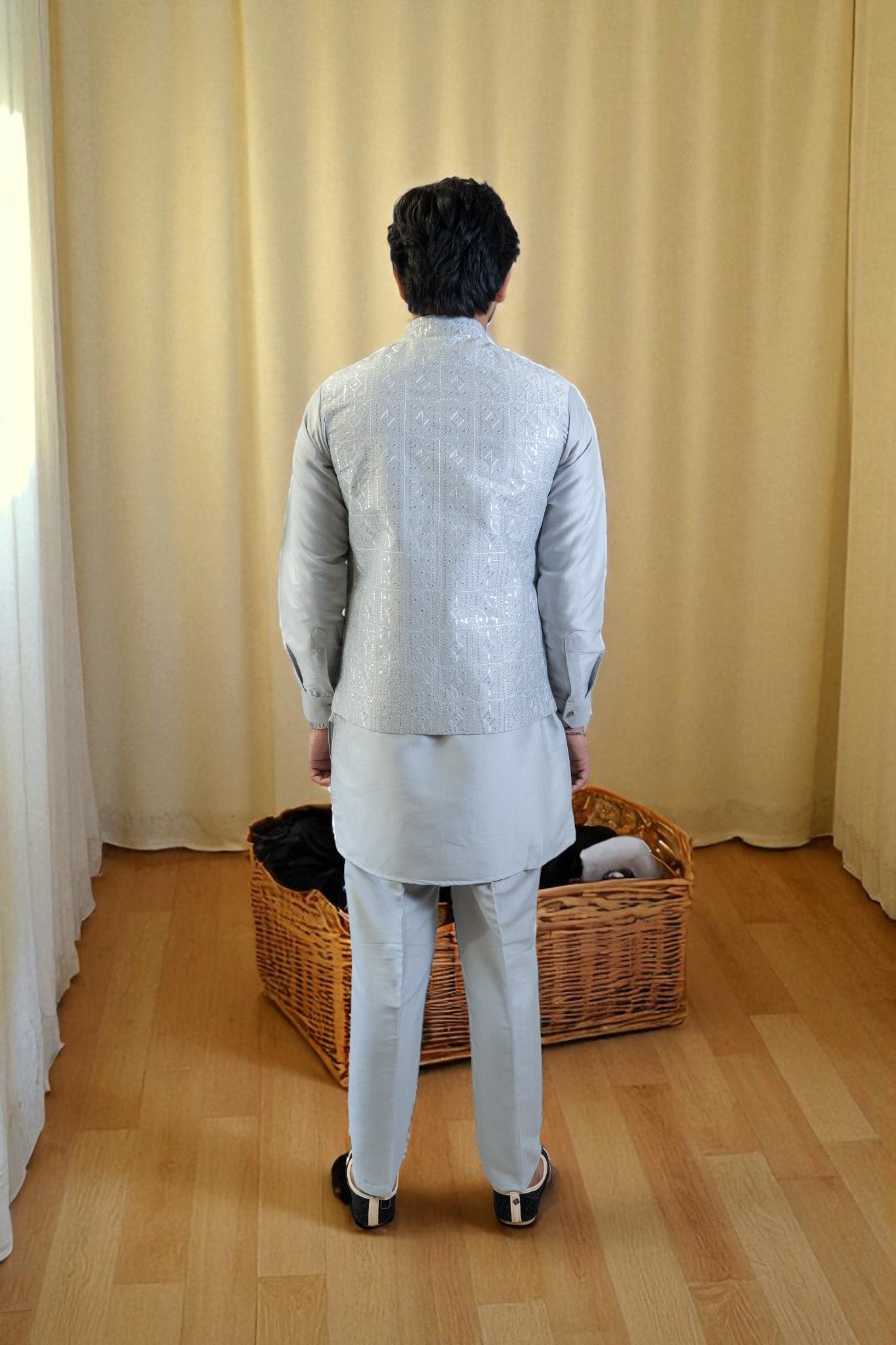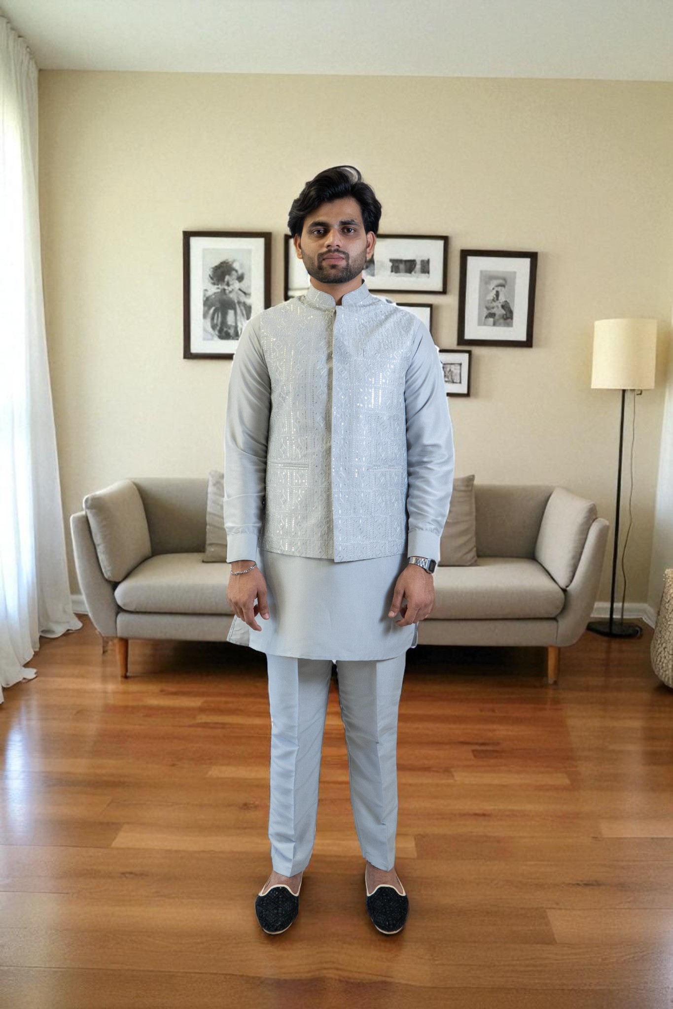 grey kurta jacket set, crafted from premium cotton silk fabric for a soft, shiny, and comfortable feel. The jacket features stunning full sequin embroidery, creating a luxurious and festive look, while the kurta pairs perfectly with a regular-fit pant with elastic waist for all-day comfort.