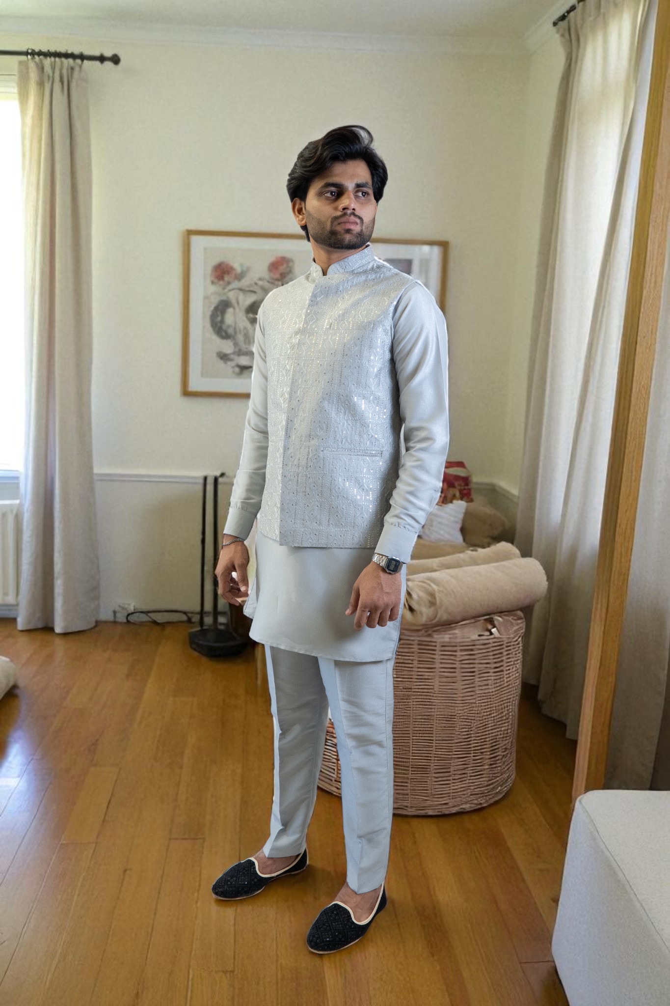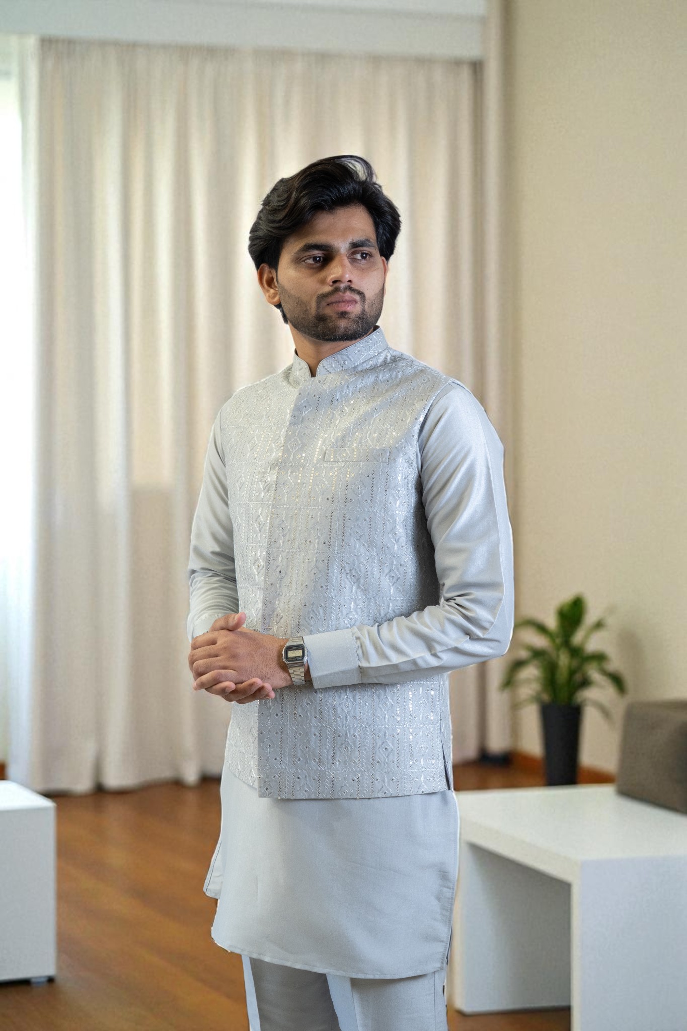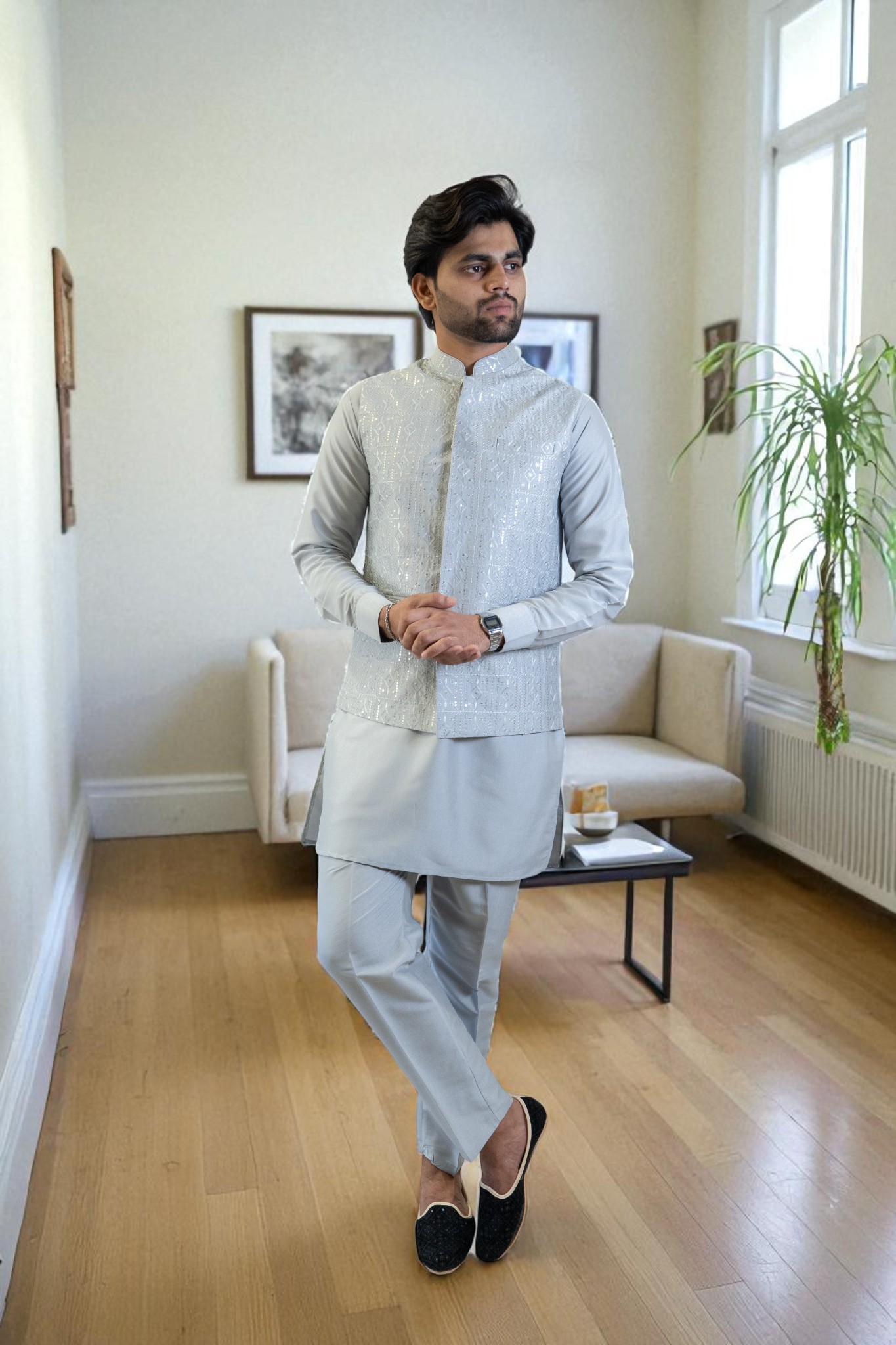 grey kurta jacket set, crafted from premium cotton silk fabric for a soft, shiny, and comfortable feel. The jacket features stunning full sequin embroidery, creating a luxurious and festive look, while the kurta pairs perfectly with a regular-fit pant with elastic waist for all-day comfort.