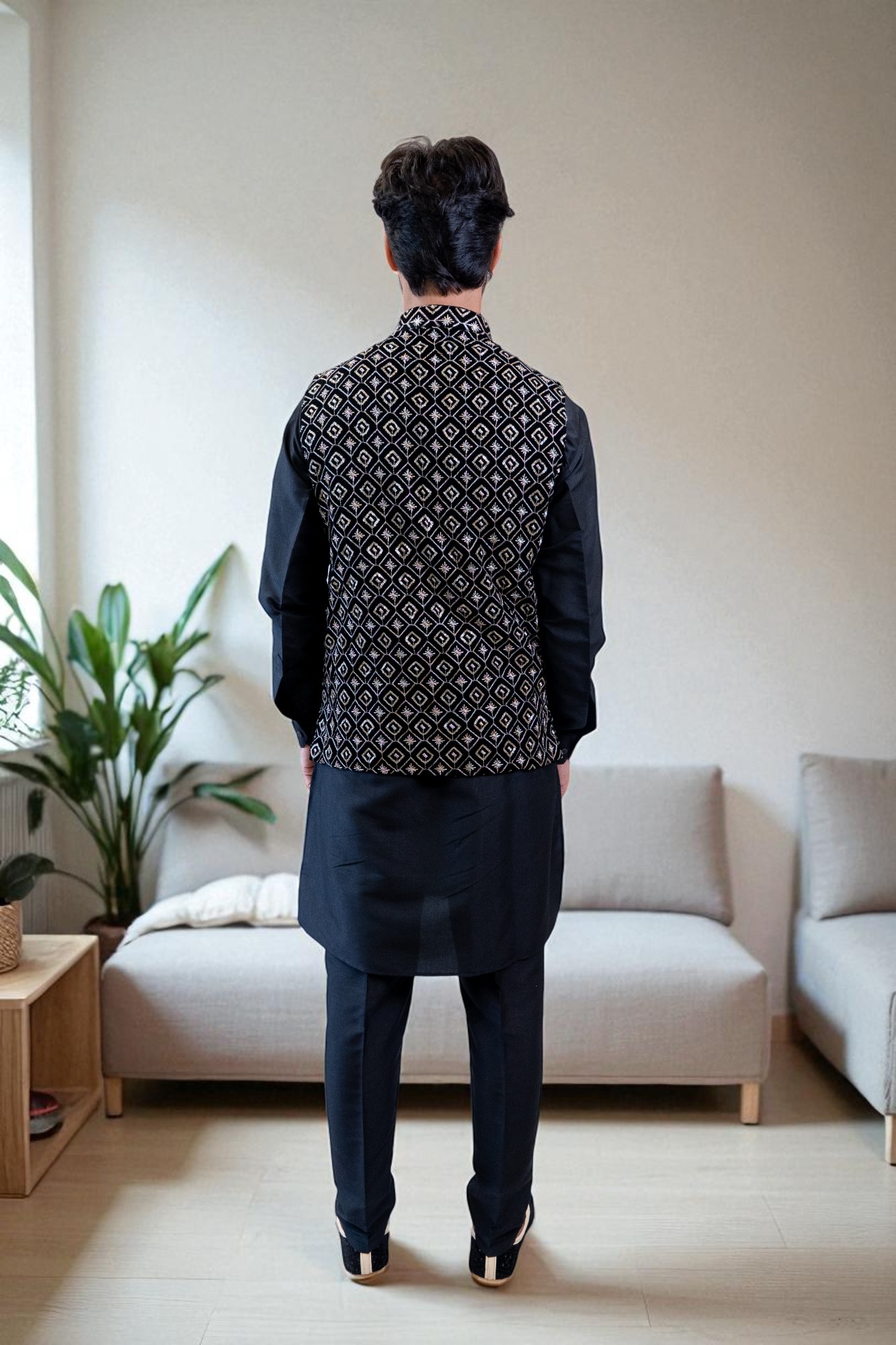 hine in this Sequin Kurta Jacket Set for Men! This set features a comfortable kurta, matching pajama, and a stylish yellow jacket adorned with sparkling sequins. Perfect as men’s wedding party wear kurta pajama with jacket, it blends traditional charm with a modern look. Made from soft, high-quality fabric, this designer sequin kurta pajama set for festive occasions ensures all-day comfort. Pair with traditional shoes for a complete festive look.