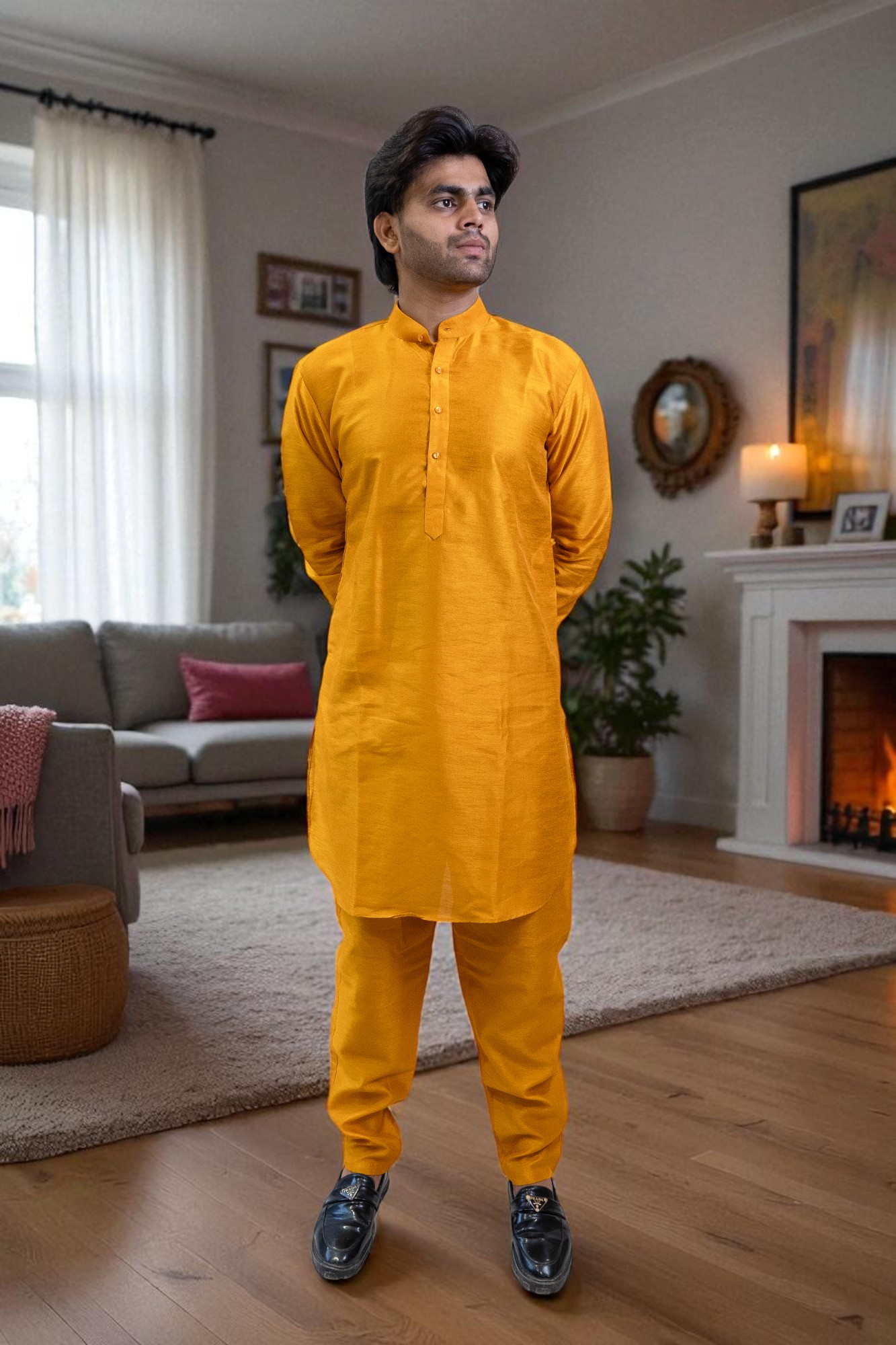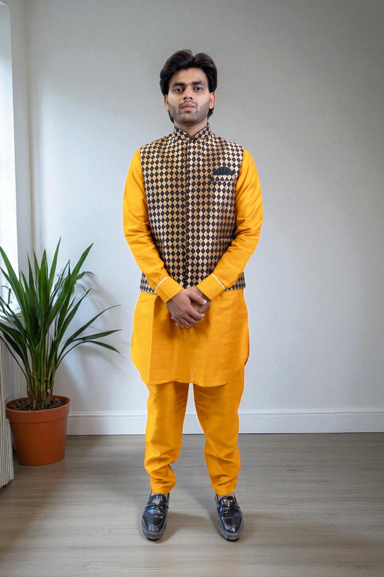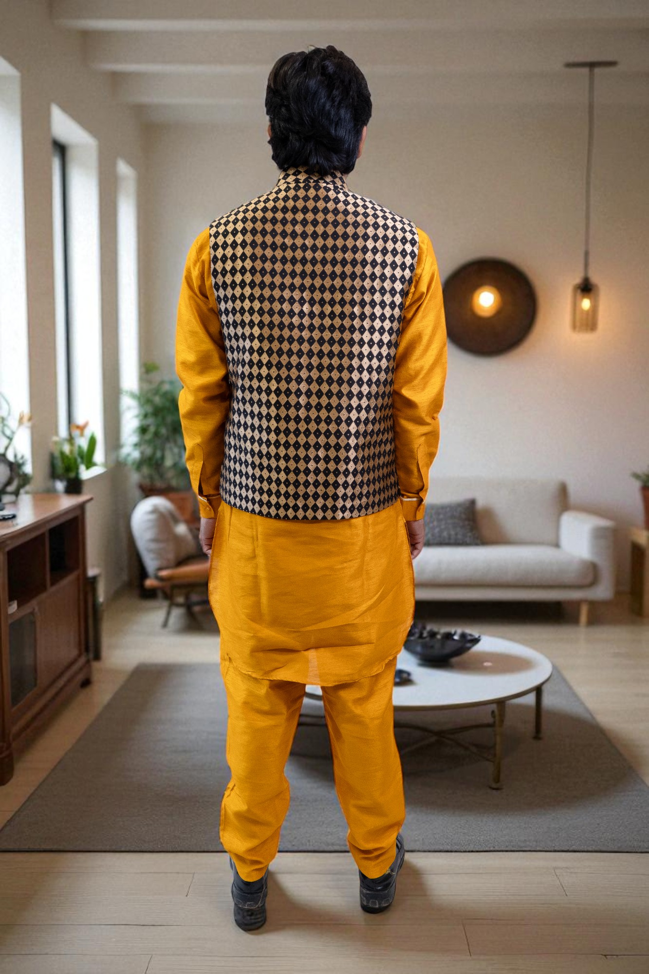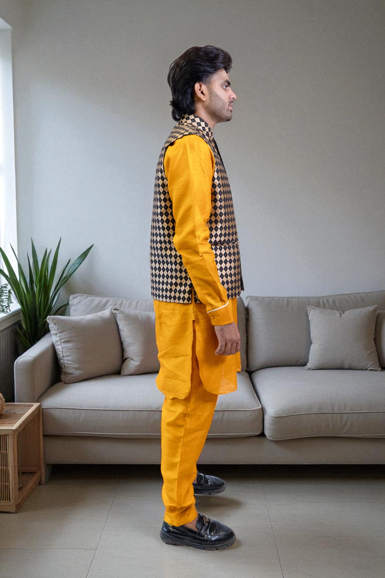 Look elegant in this Gold Printed Solid Kurta Pyjama Jacket Set! This stylish set includes a comfortable kurta, matching pyjama, and a classy gold-printed jacket, perfect for weddings, parties, and festive occasions. Ideal as men’s wedding party wear kurta pajama with jacket, it blends traditional charm with a modern look. Made from soft, high-quality fabric, this designer festive kurta pajama set ensures comfort and style all day.