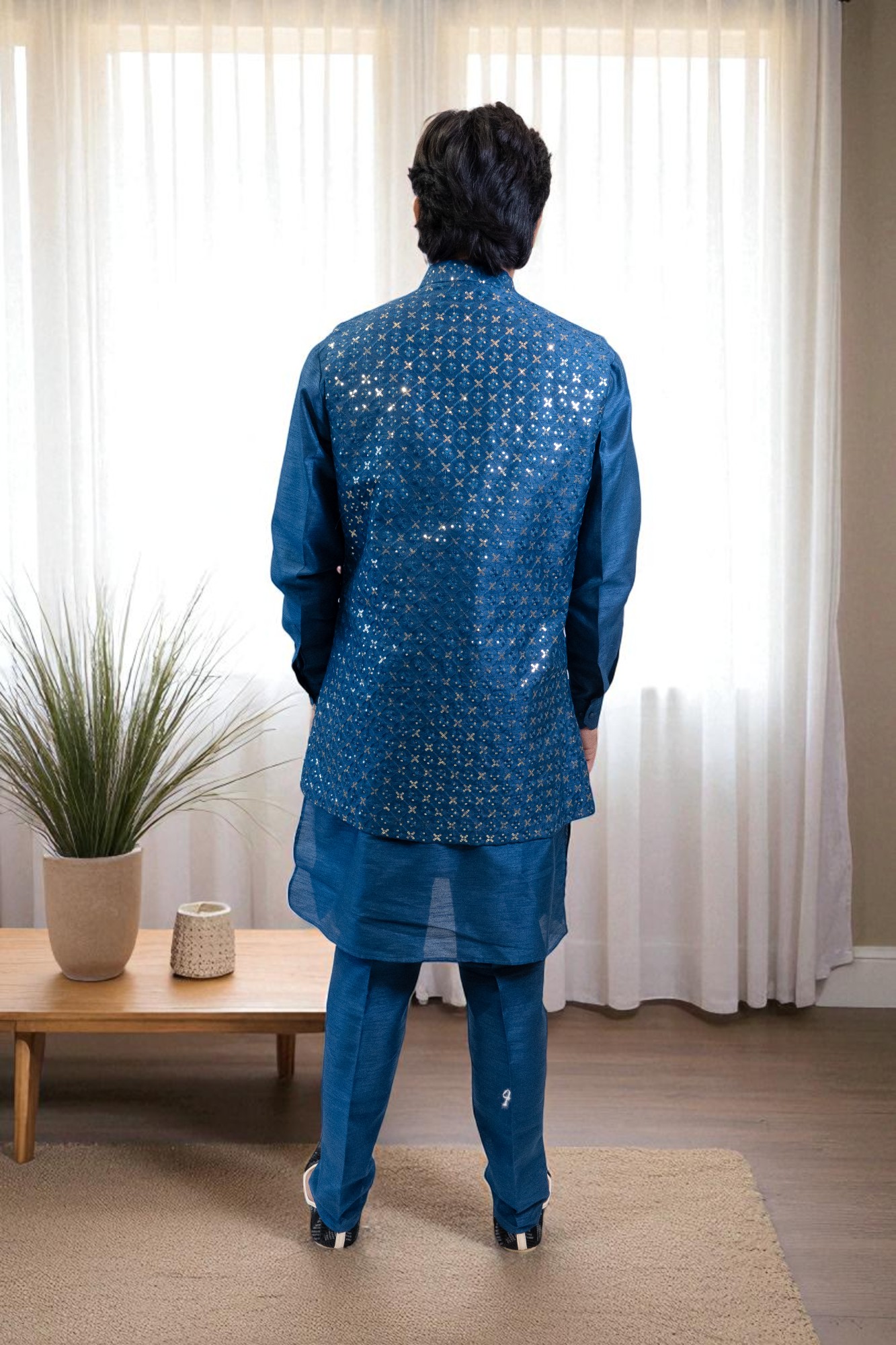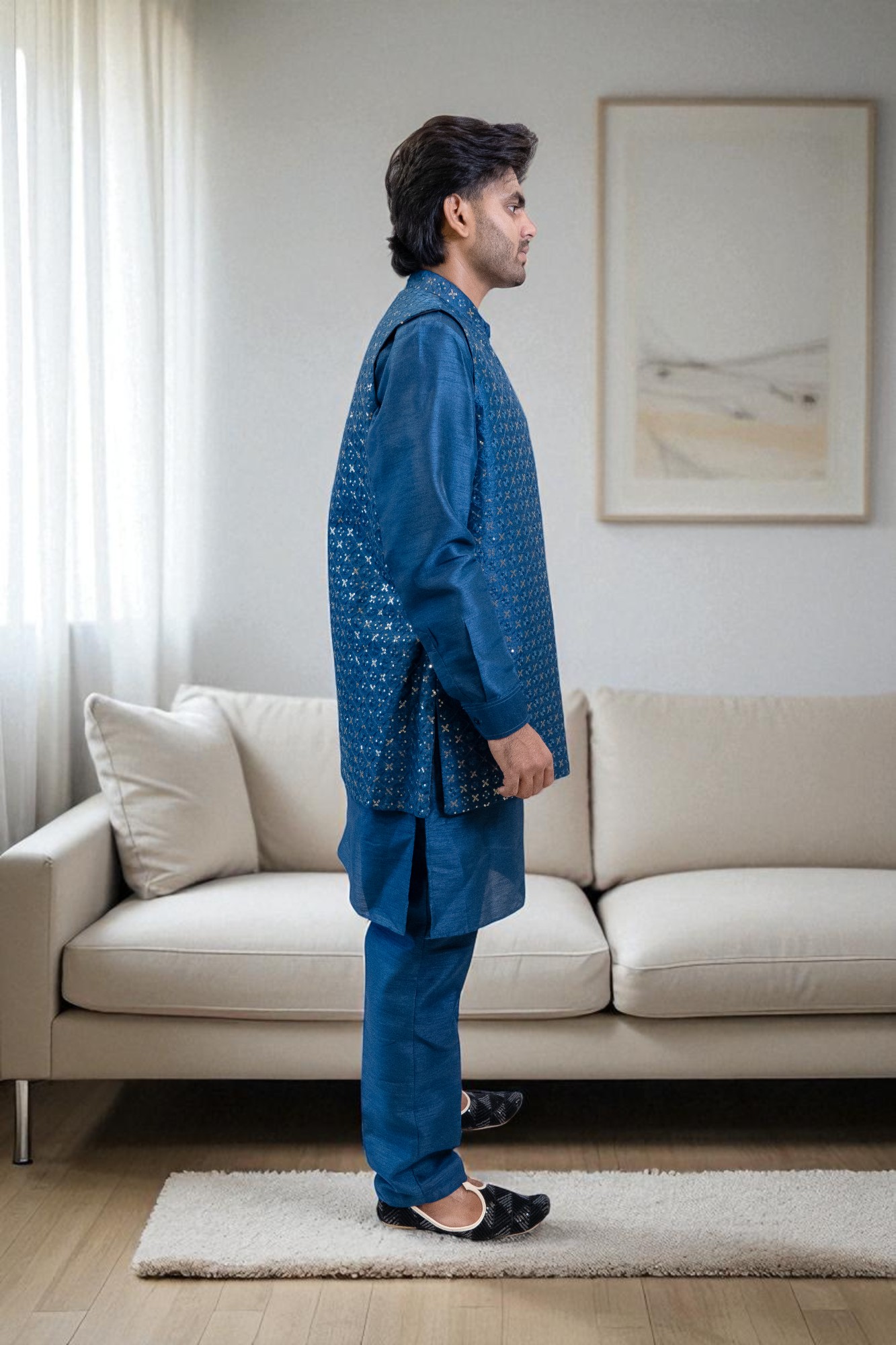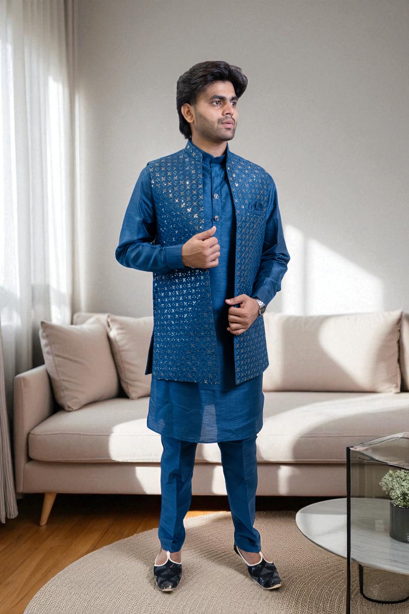 Party Wear Sequin Kurta Jacket for Men! This stylish set includes a comfortable kurta, matching pajama, and a sparkling sequin jacket that adds elegance and charm. Perfect as men’s party wear and wedding kurta pajama, it blends traditional design with a modern look. Made from soft, high-quality fabric, this festive outfit ensures all-day comfort. Available in vibrant colors and multiple sizes, it pairs perfectly with traditional shoes for a complete ethnic look.