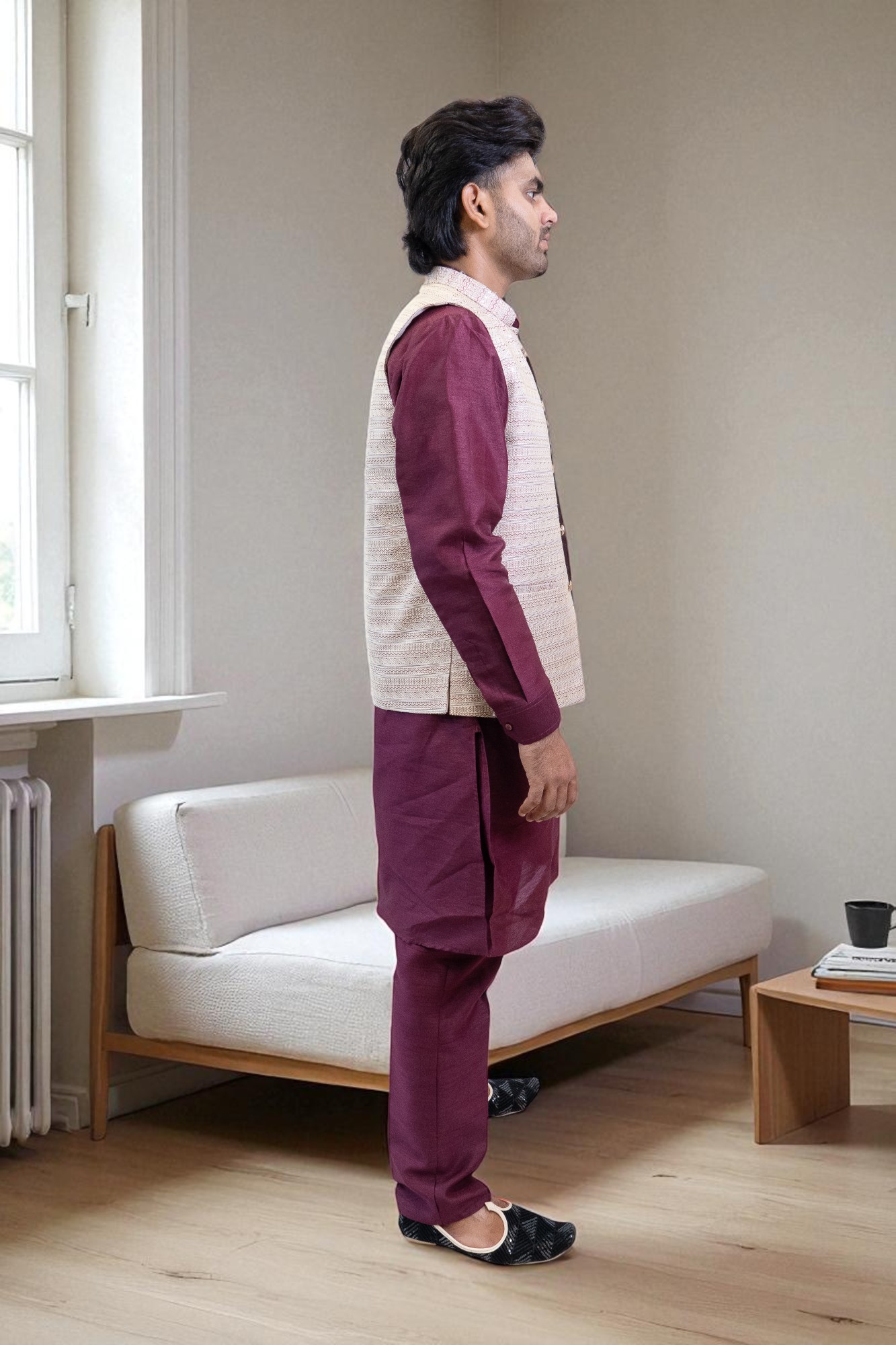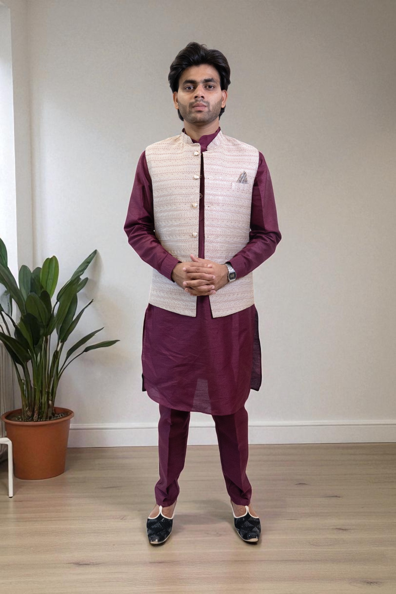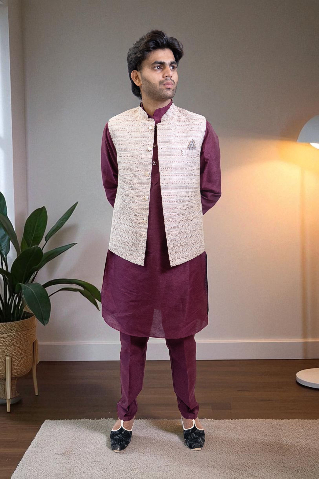 Ethnic Sequin Kurta Jacket Outfit Men! This set includes a comfortable kurta, matching pajama, and a stylish sequin jacket, perfect for weddings, parties, and festive occasions. Ideal as men’s party wear and a wedding kurta pajama, it blends traditional charm with a modern look. Made from soft, high-quality fabric, this festive outfit ensures comfort and elegance all day. Pair with traditional shoes for a complete ethnic style.