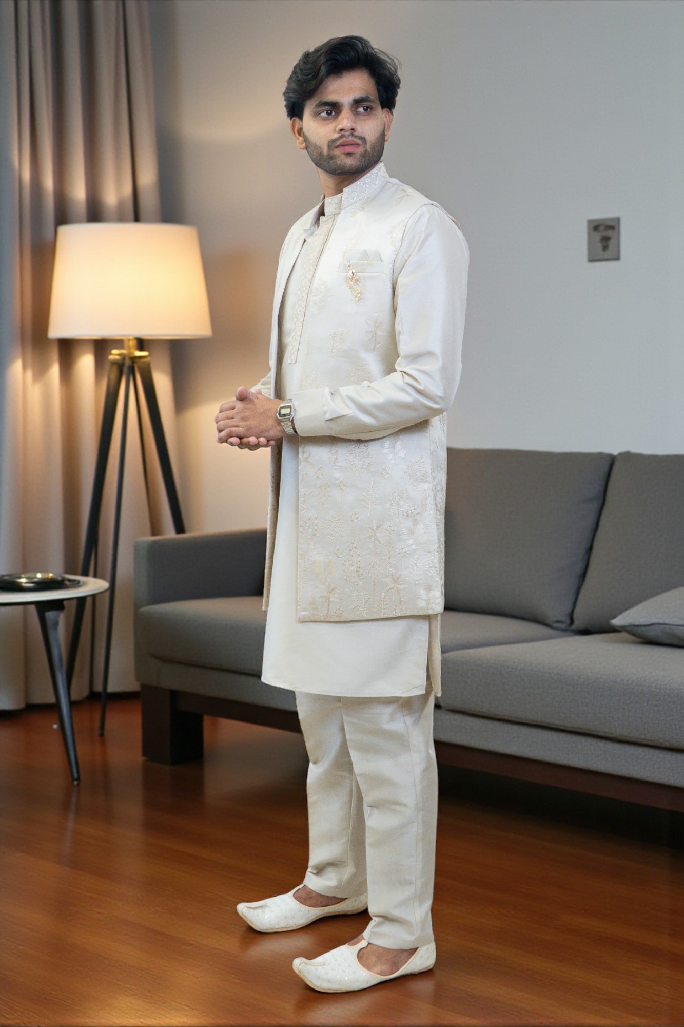 Look stylish and festive with this Light Golden Embroidered Kurta Jacket Set. Made from soft, comfortable fabric, the kurta ensures all-day comfort. The jacket features beautiful embroidery with fine detailing, giving a rich and elegant look for weddings, parties, and traditional events. Its light golden shade adds a luxurious touch while keeping the outfit classy. Pair it with churidar or pajama for a complete ethnic look. Lightweight and breathable, this set perfectly balances comfort, style, and sophistication. Ideal for men who want to stand out gracefully, this kurta jacket set is a must-have for festive and special occasions.