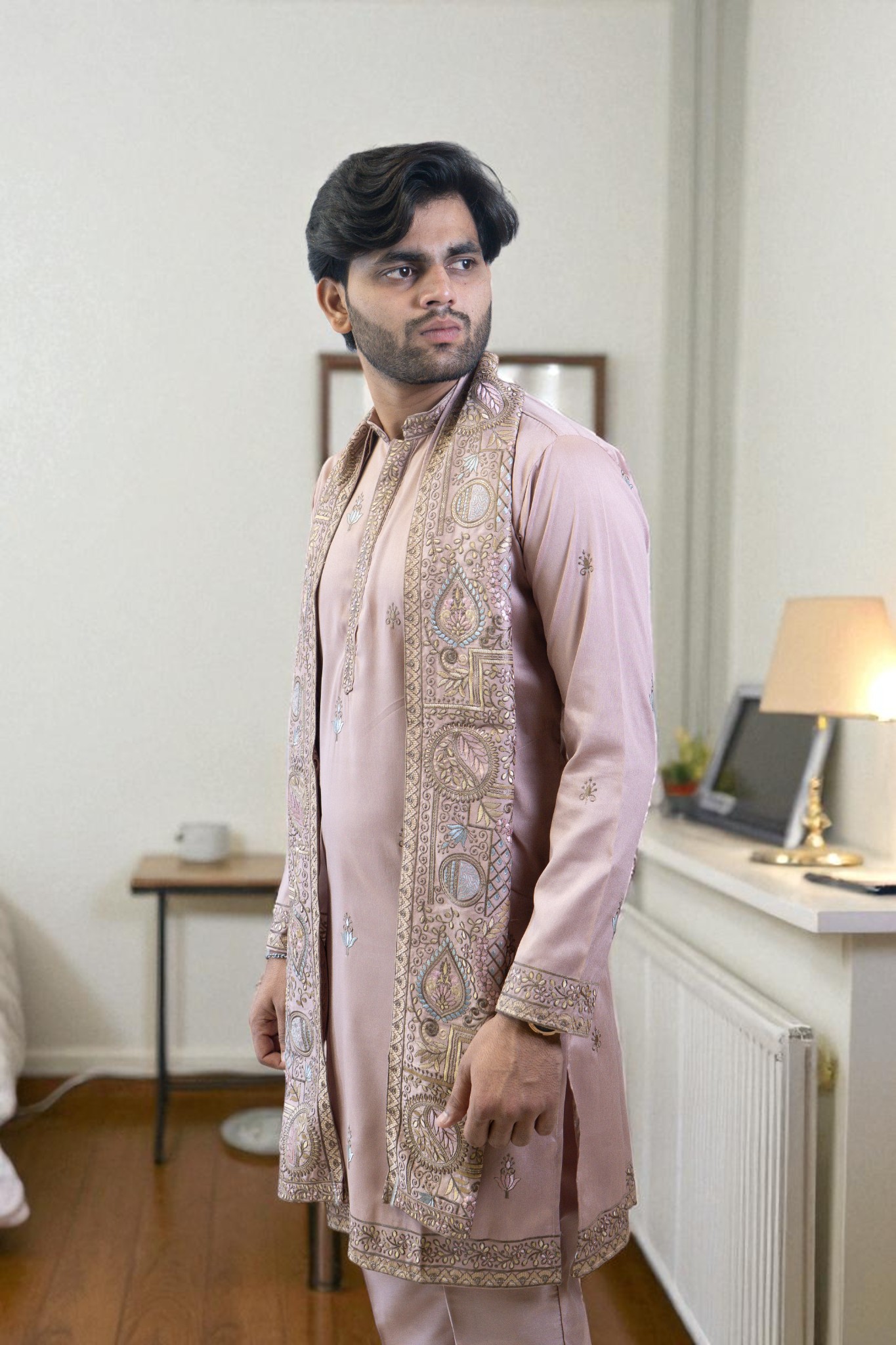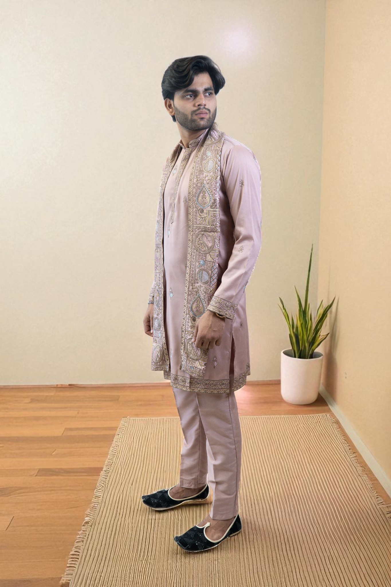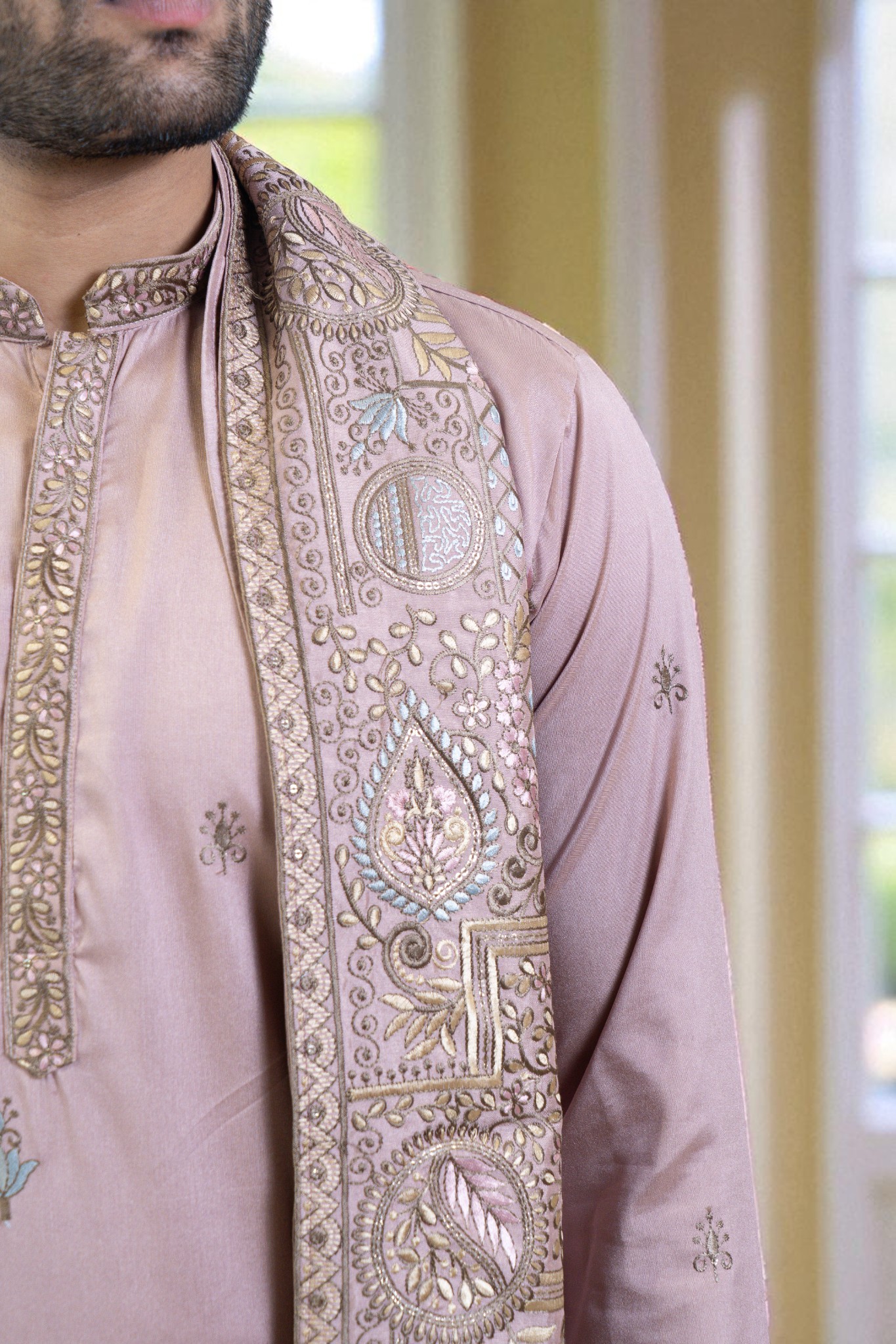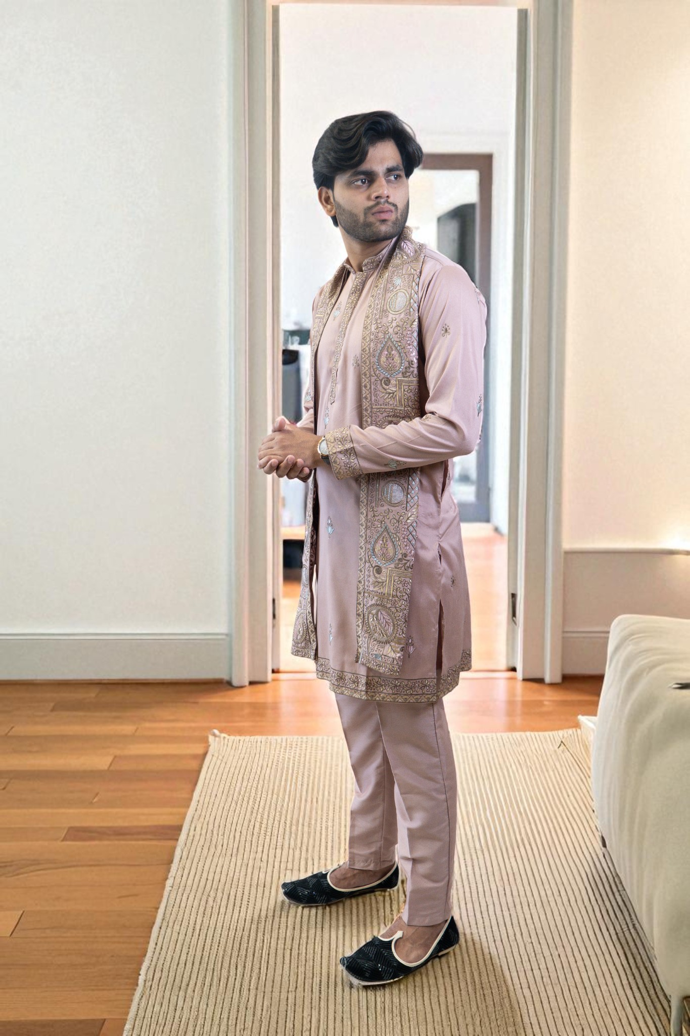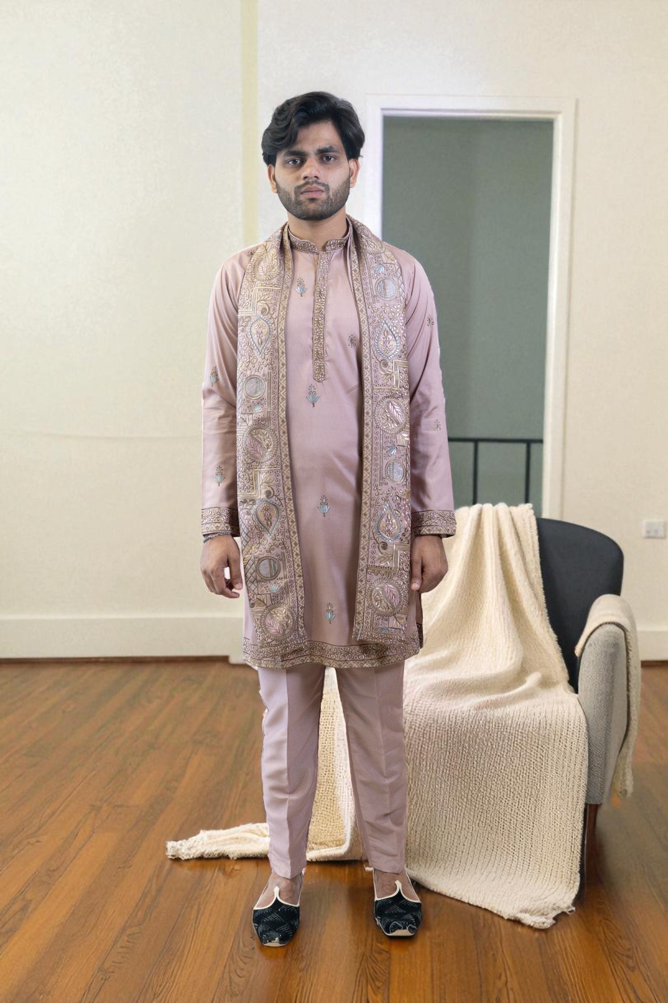 This designer kurta pajama blends elegance, tradition, and comfort. Its full embroidery design adds sophistication, while the light onion color brings a refreshing, modern touch. Ideal for Diwali, Eid, weddings, or special celebrations, this kurta pajama is a trending ethnic wear choice for men who value style and comfort.