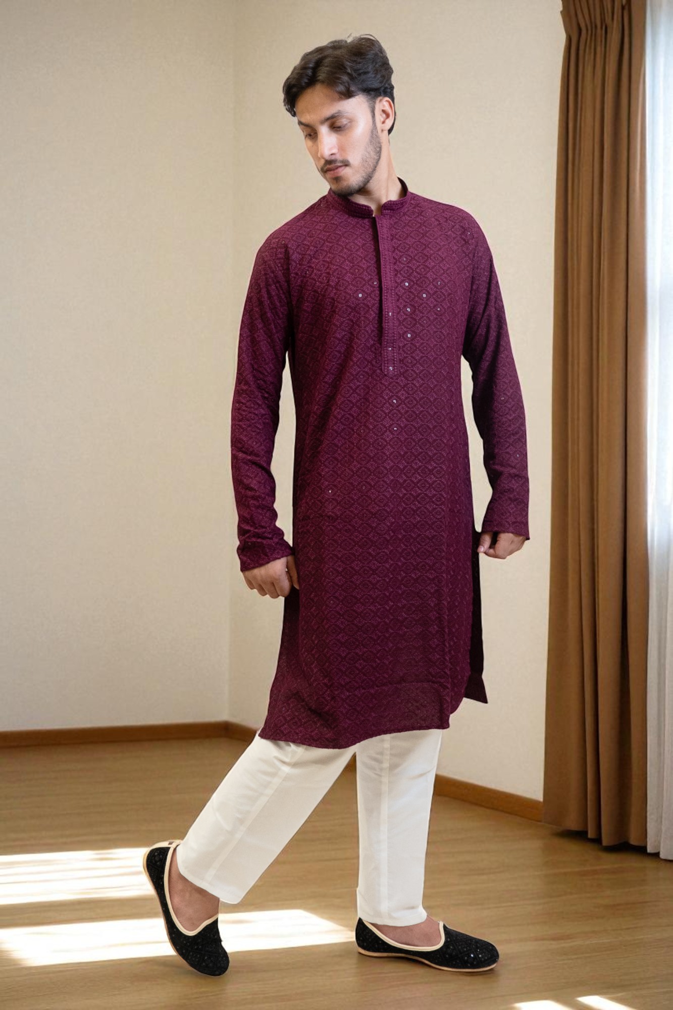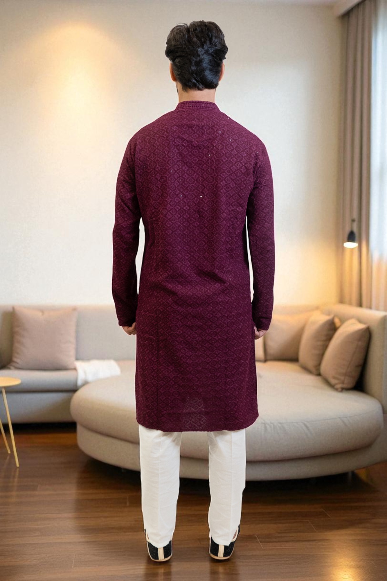 Mehroon Sequin Chikan Kadai Kurta Pajama for men