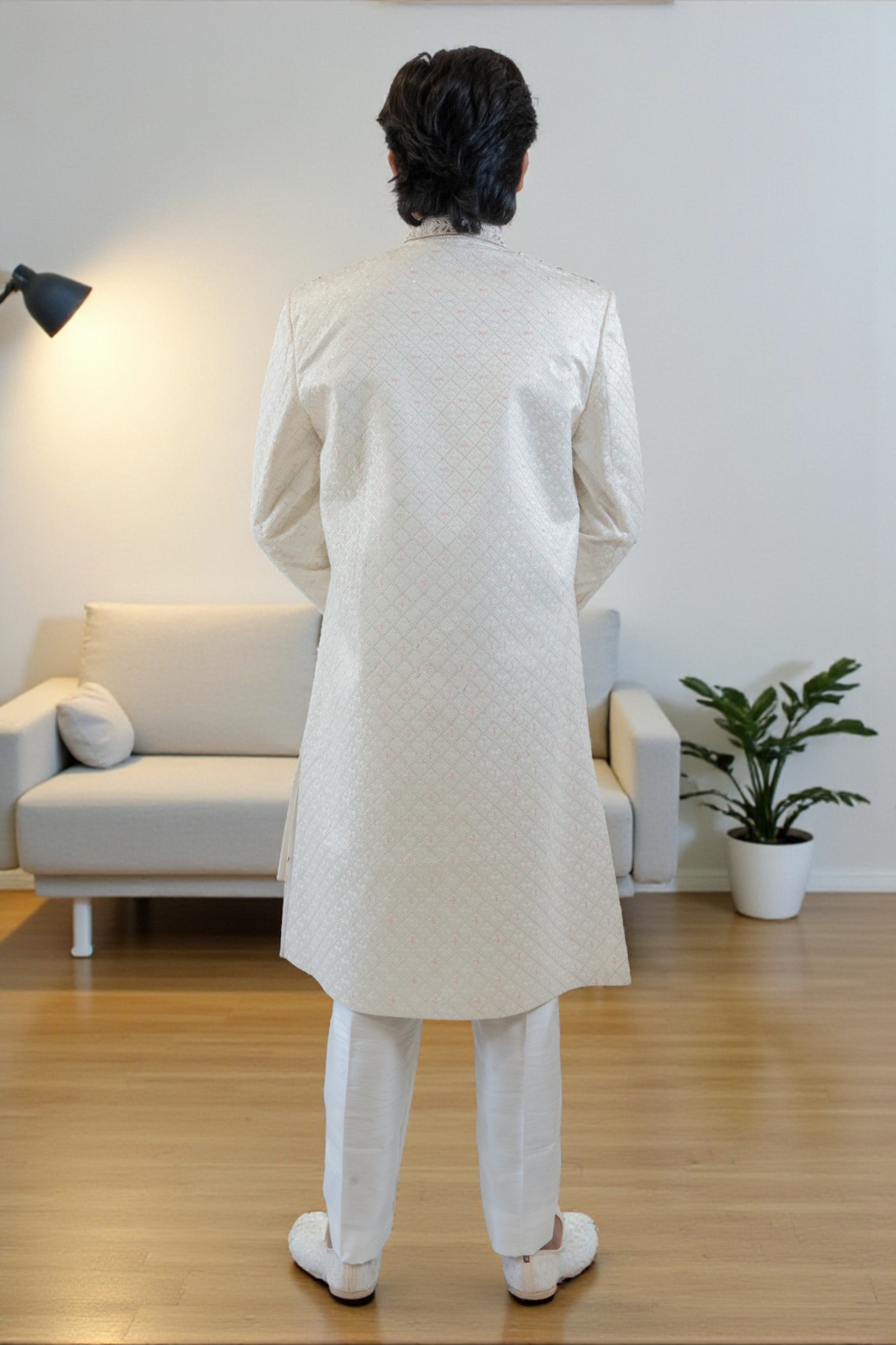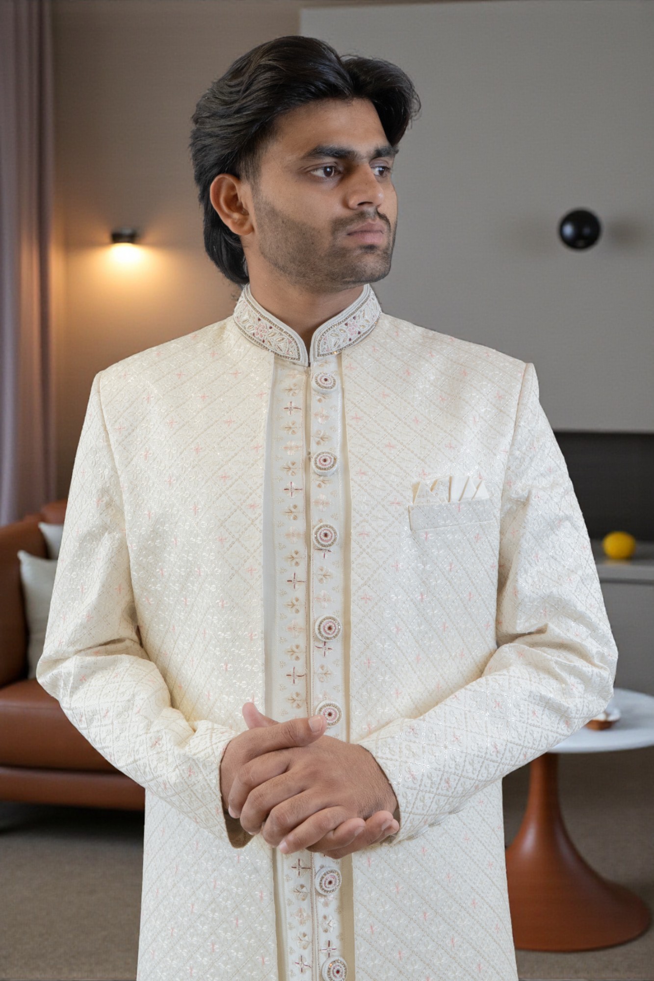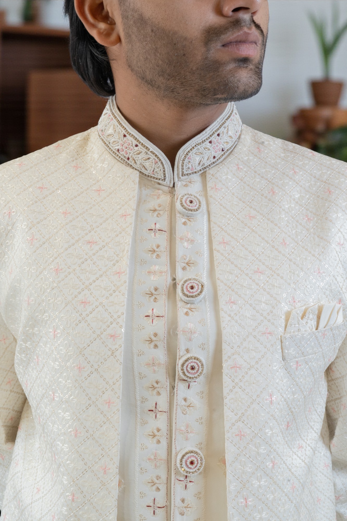 Off-White Floral Sequined Sherwani Set for Men – Elegant, Stylish & Comfortable