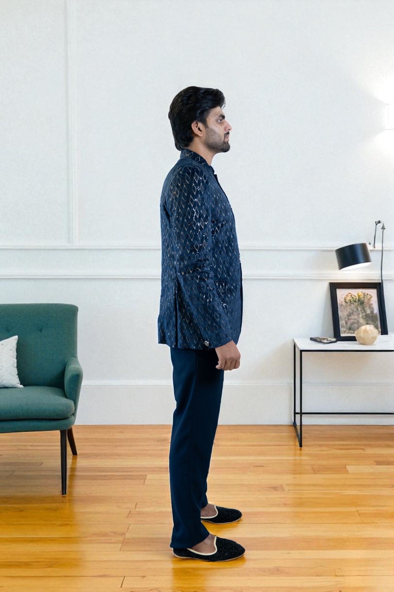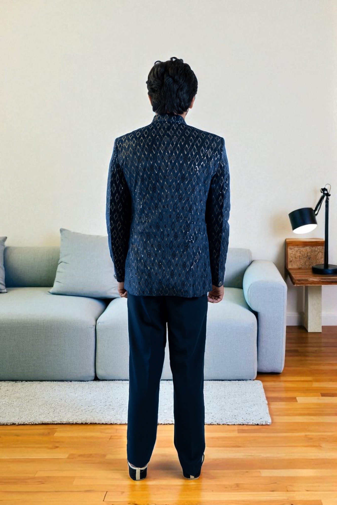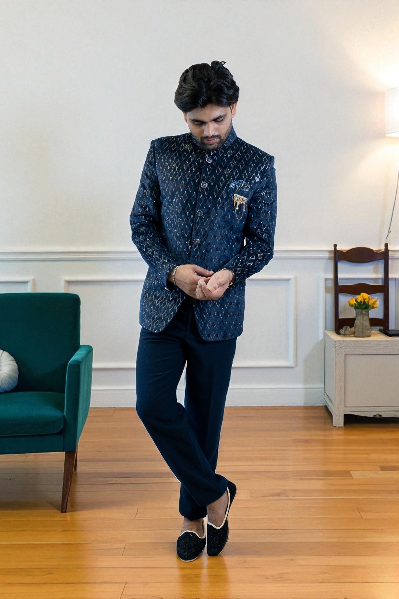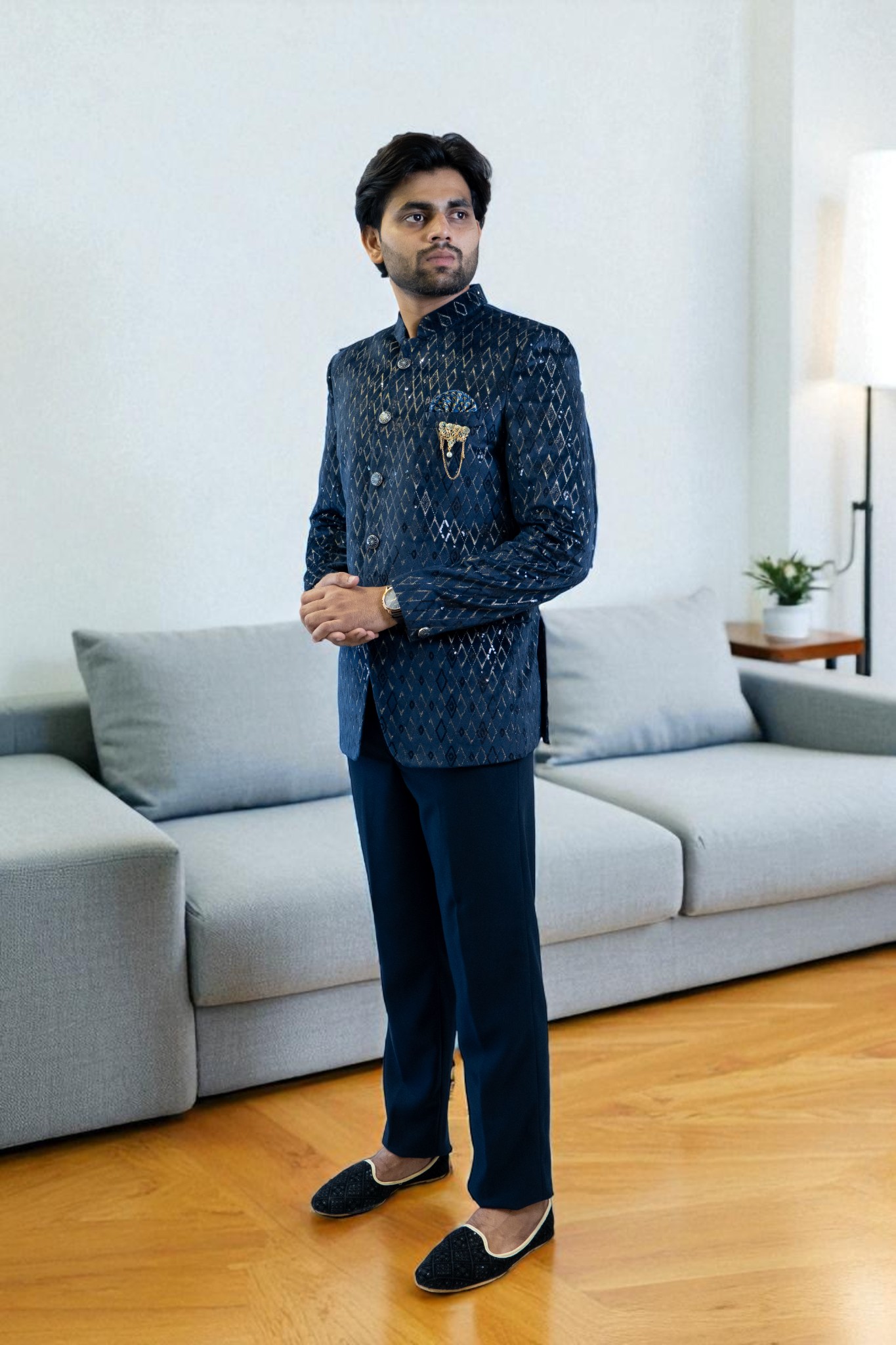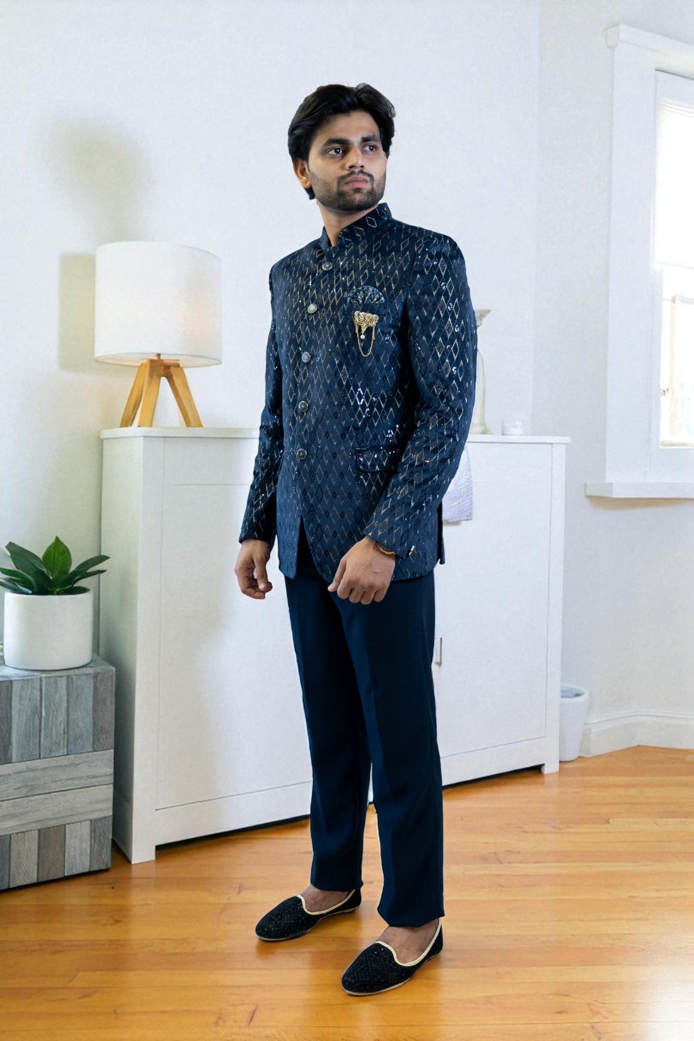 Navy Blue Jodhpuri Suit, crafted from soft velvet fabric with a beautiful golden print design. The same-color pant completes the outfit, giving a neat and coordinated look.