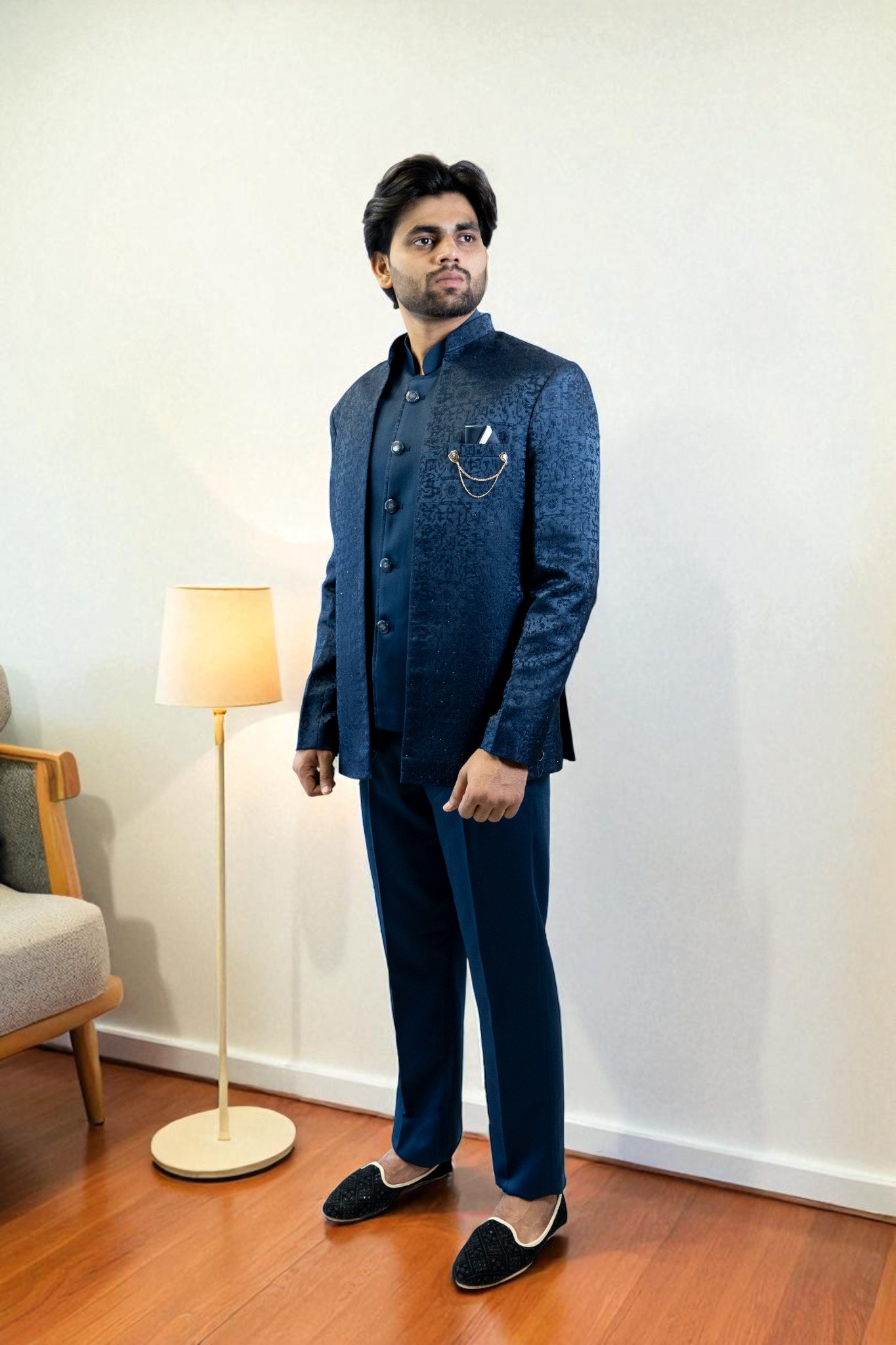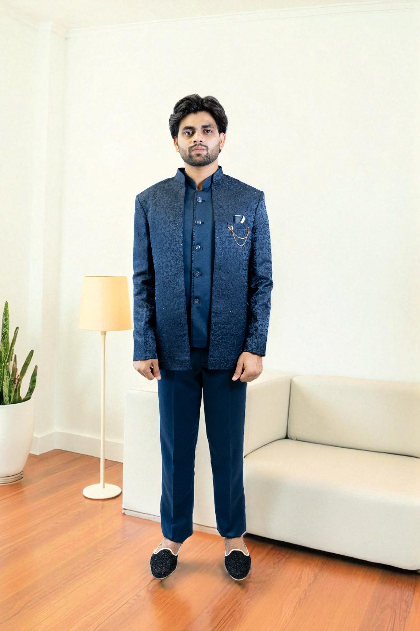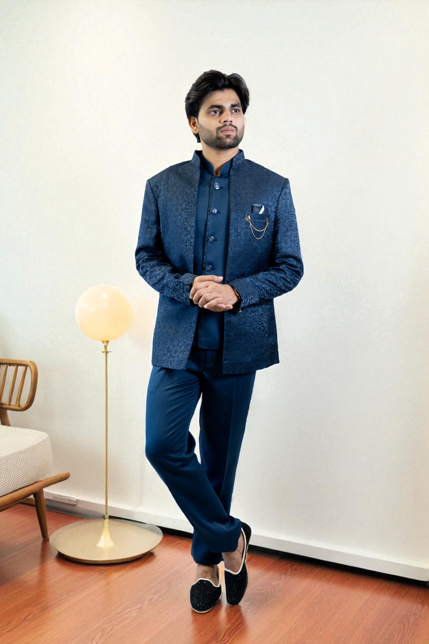 Navy Blue Jodhpuri Suit, made from premium suiting fabric for a soft and comfortable feel. The subtle self-print design adds a classy and elegant look, perfect for weddings, parties, receptions, and festive occasions.