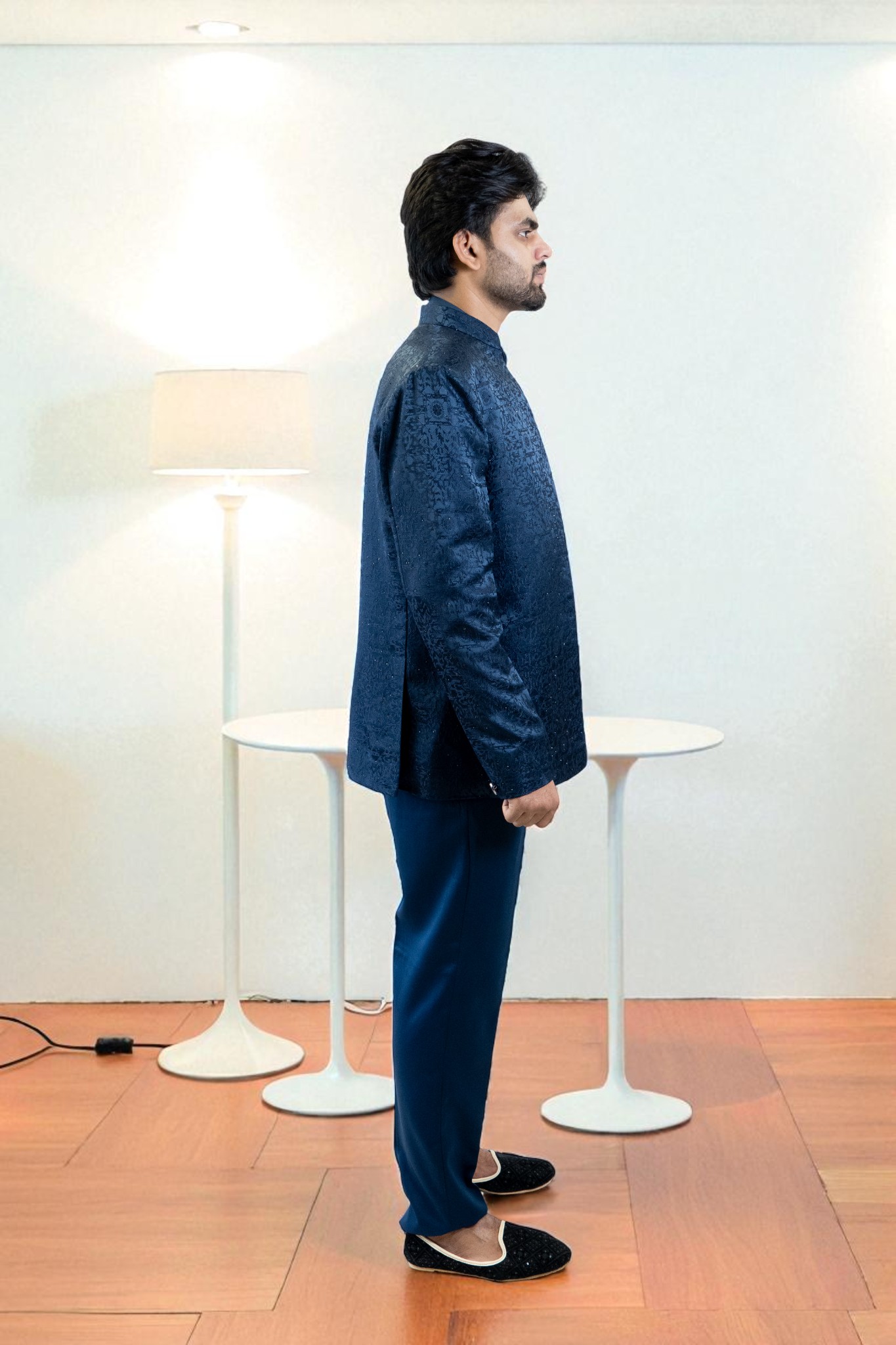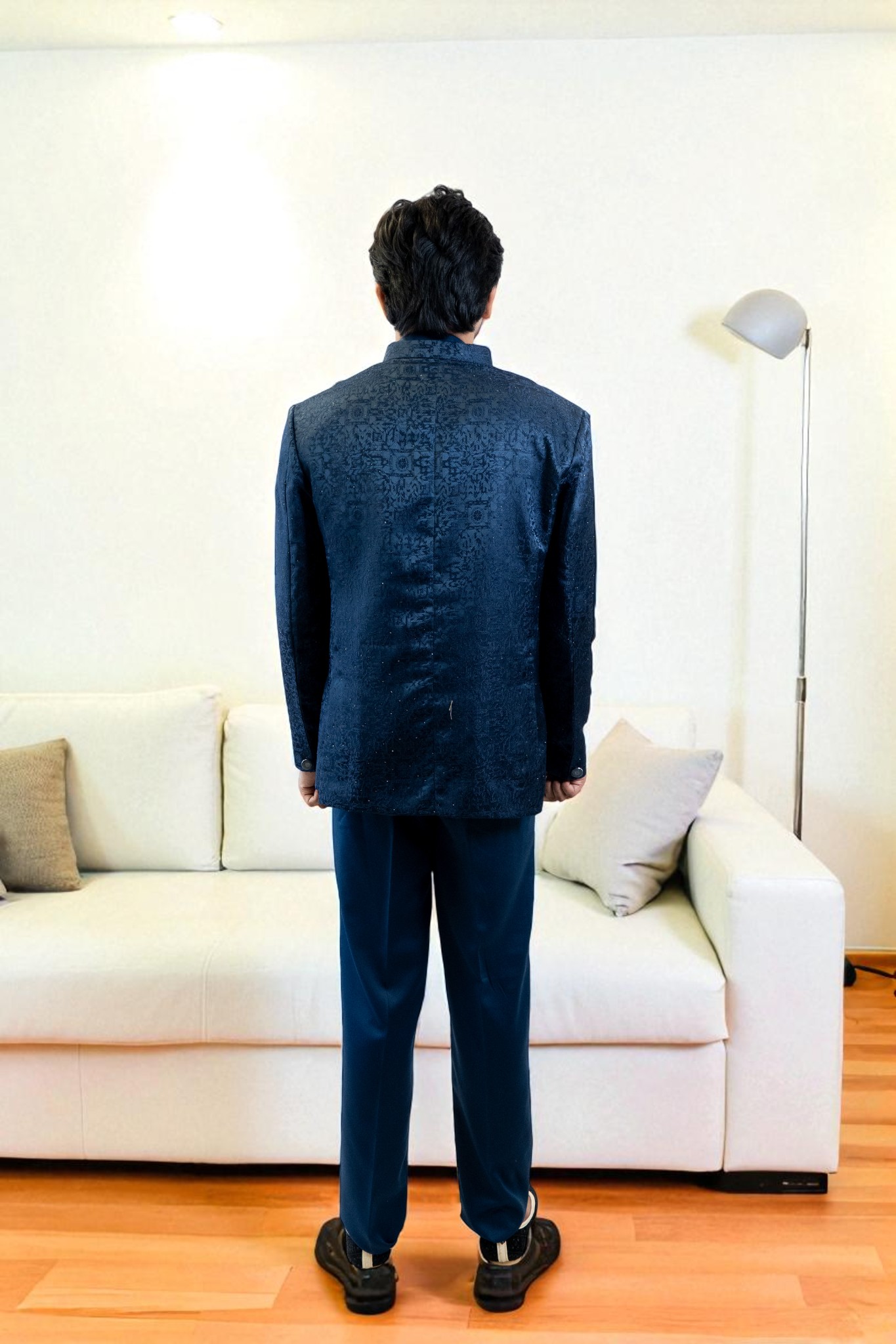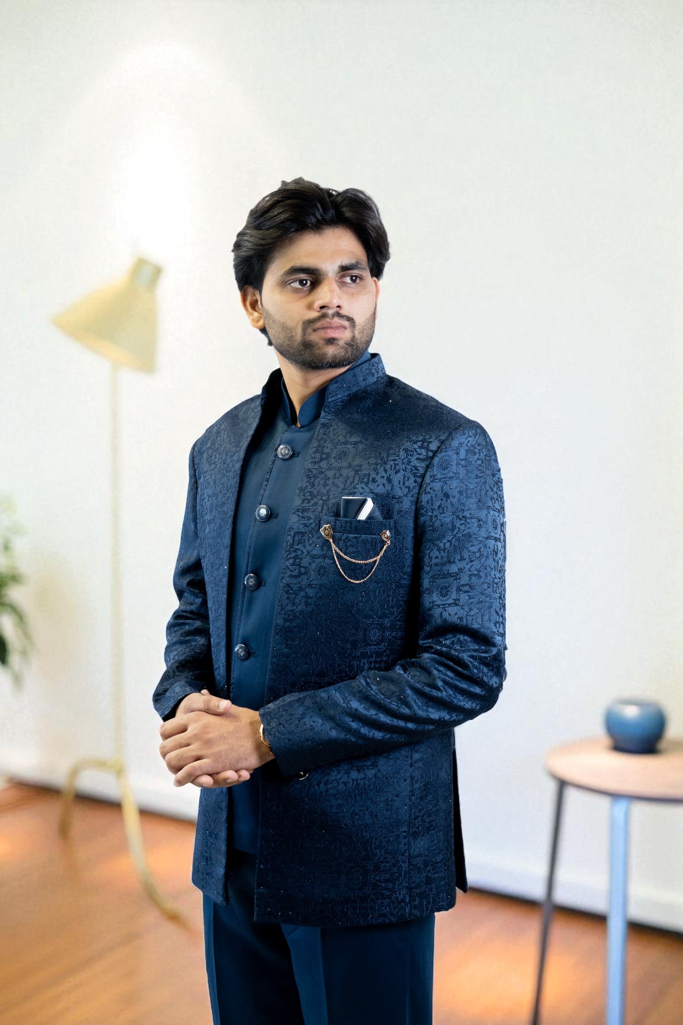 Navy Blue Jodhpuri Suit, made from premium suiting fabric for a soft and comfortable feel. The subtle self-print design adds a classy and elegant look, perfect for weddings, parties, receptions, and festive occasions.