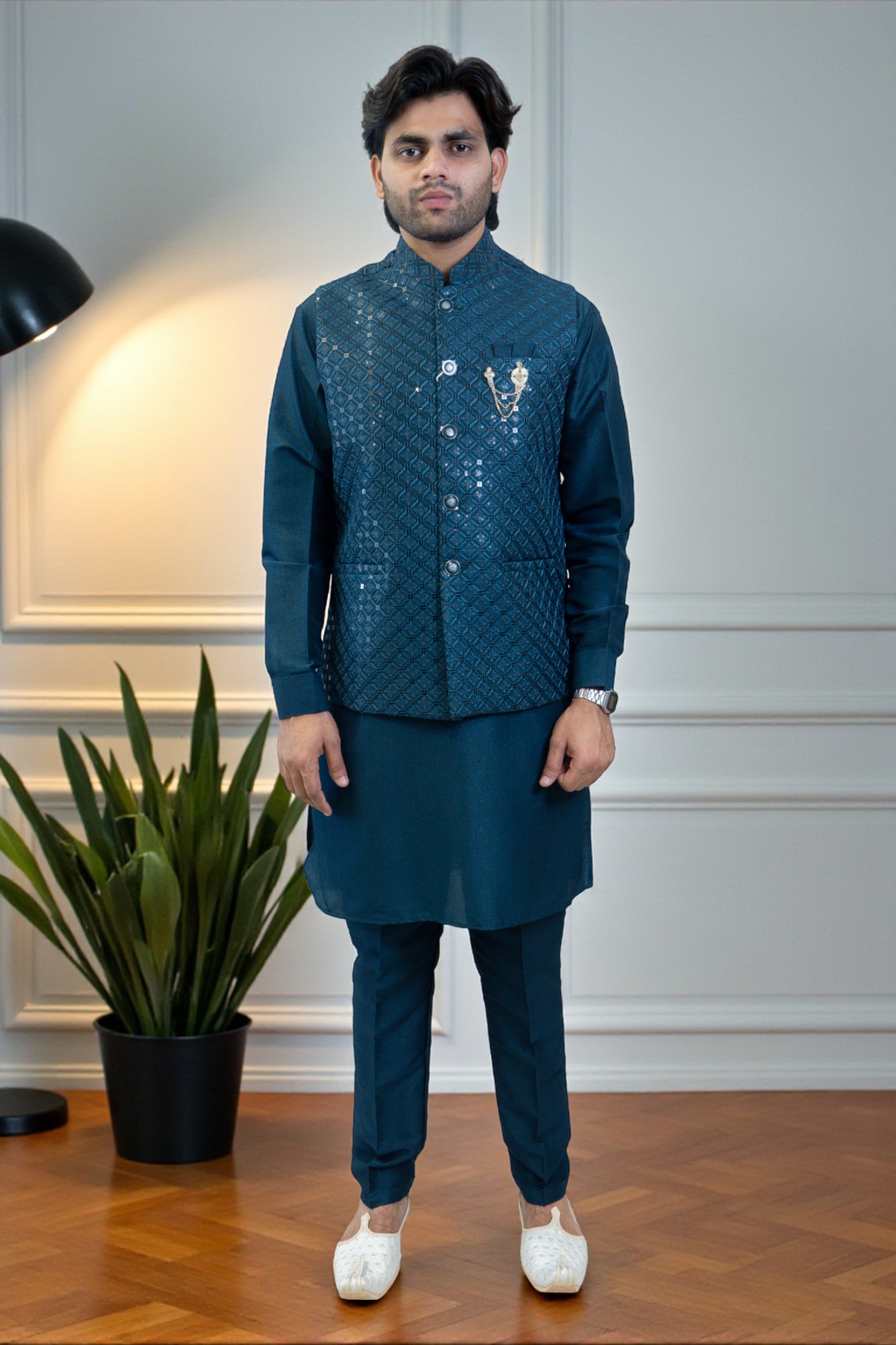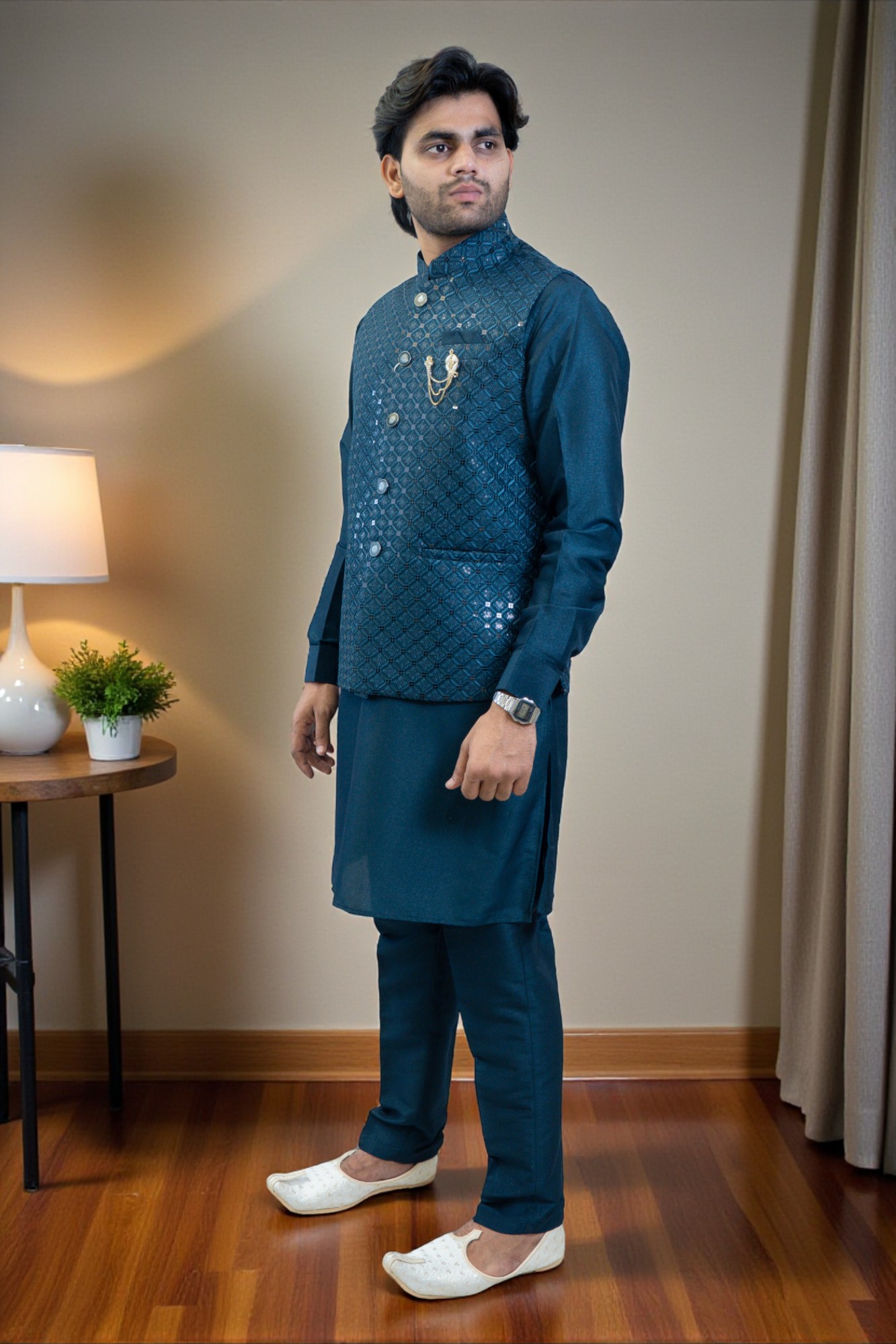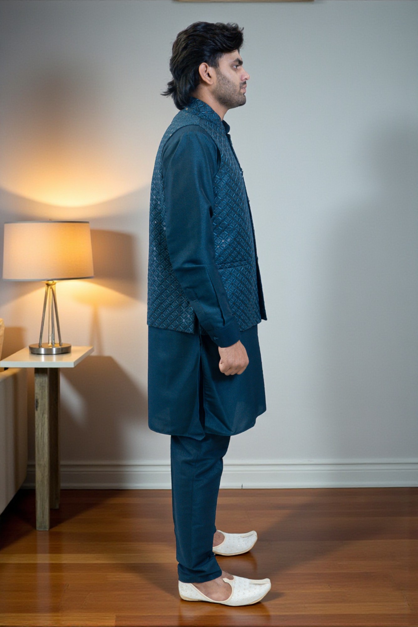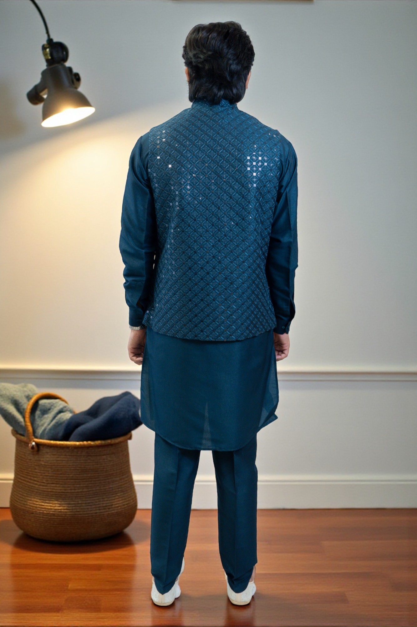 Navy Blue Kurta Jacket Set for Men – Standard Size, Rayon Silk Fabric with Sequin Design Jacket