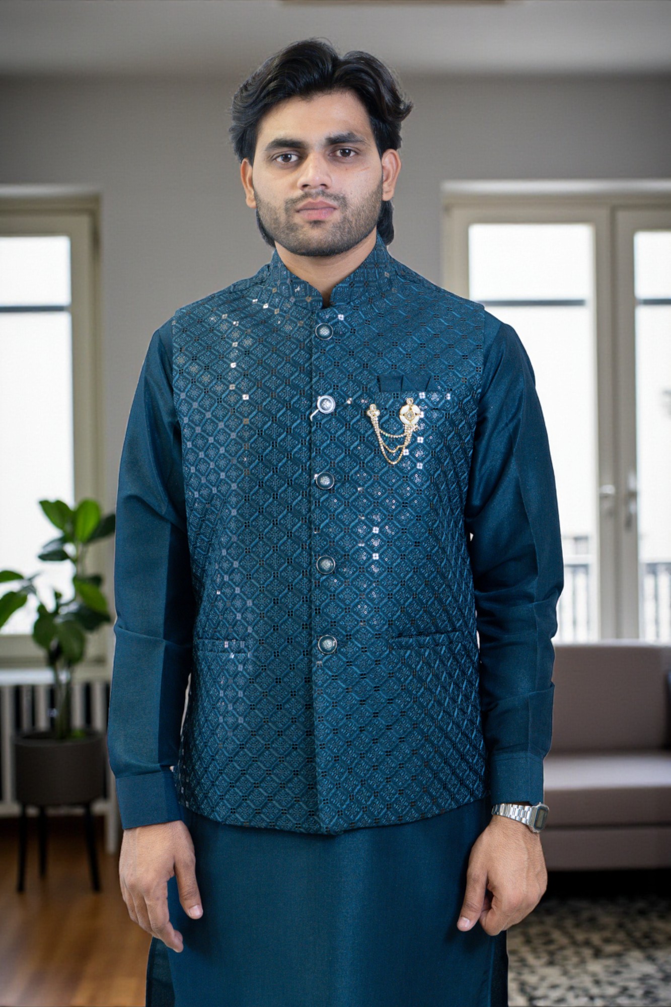 This set comes in standard sizes that fit most men comfortably. Perfect for weddings, parties, and festivals like Diwali or Eid, it mixes traditional style with a modern look. Easy to wear and neat in design, it gives a smart and classy appearance. Pair it with mojaris or sandals for a complete ethnic look.