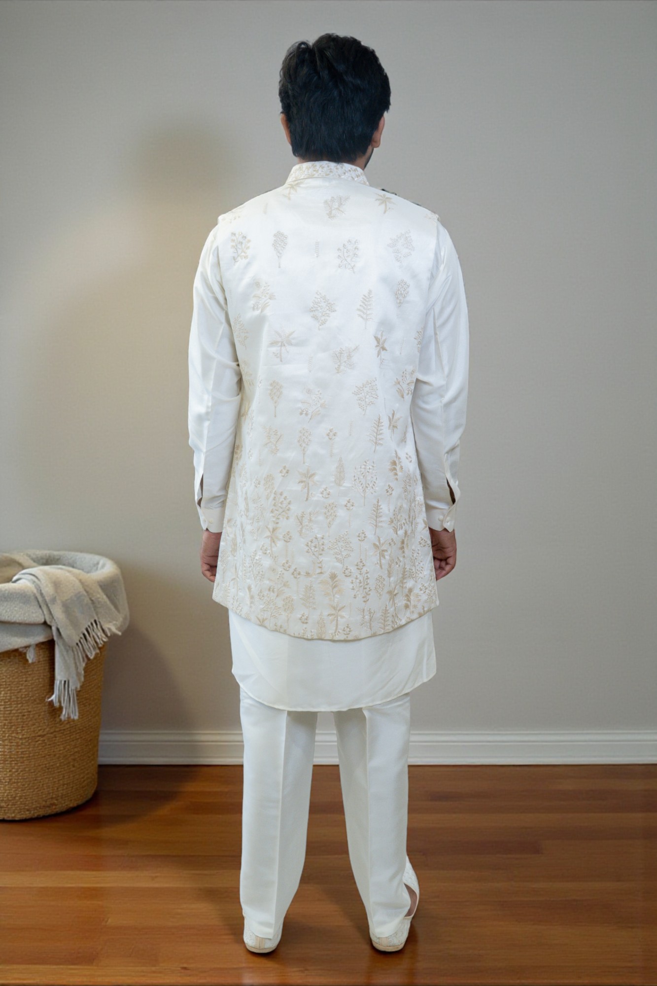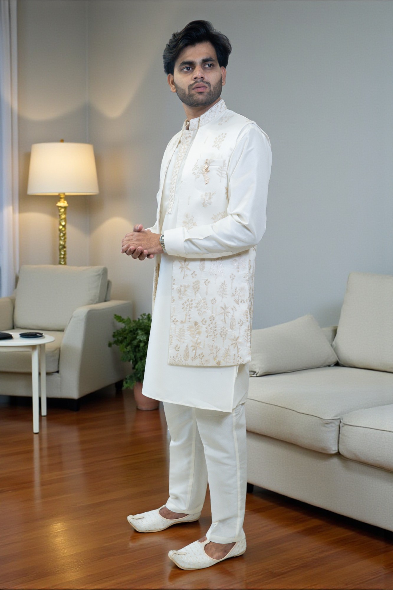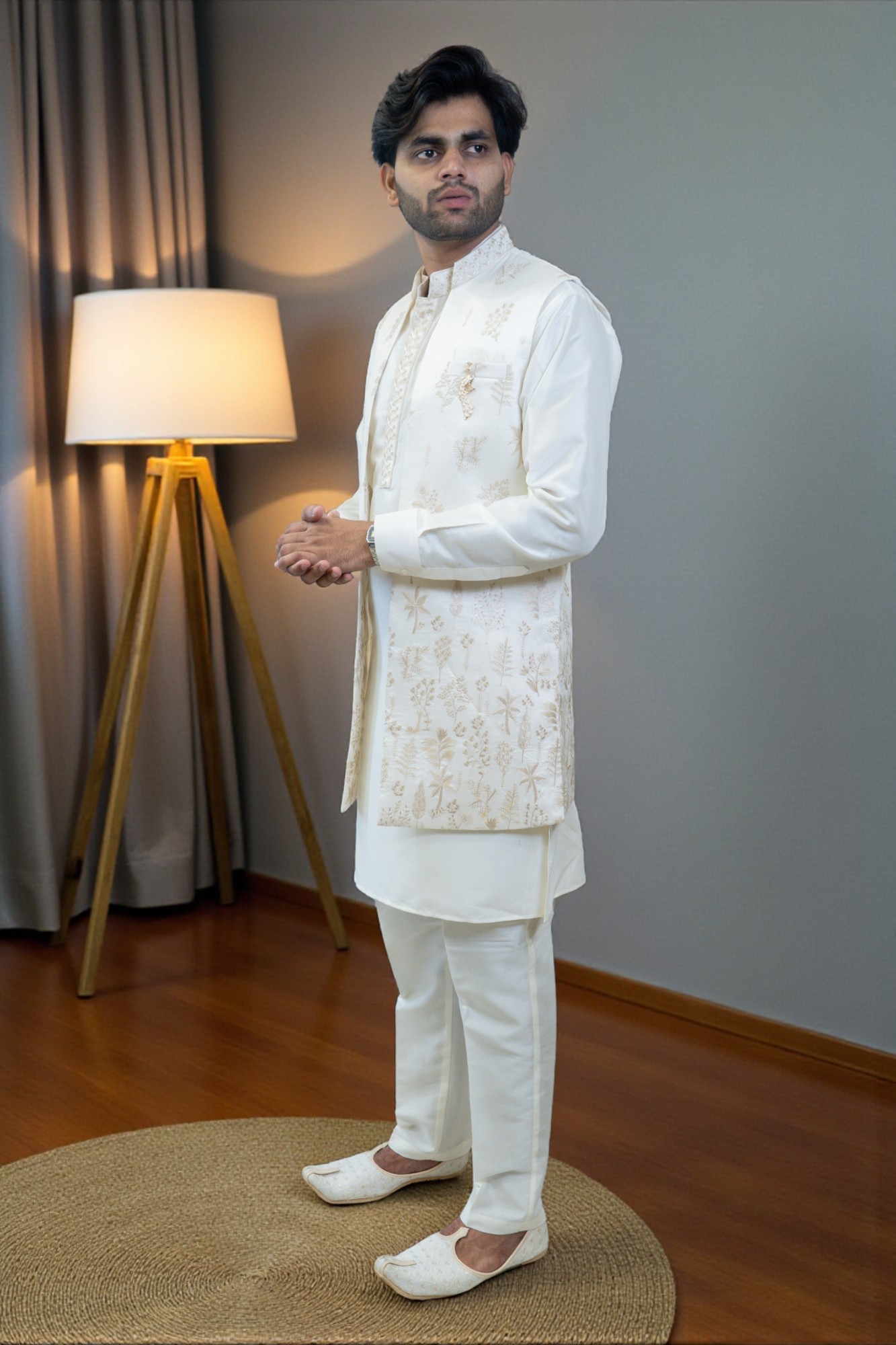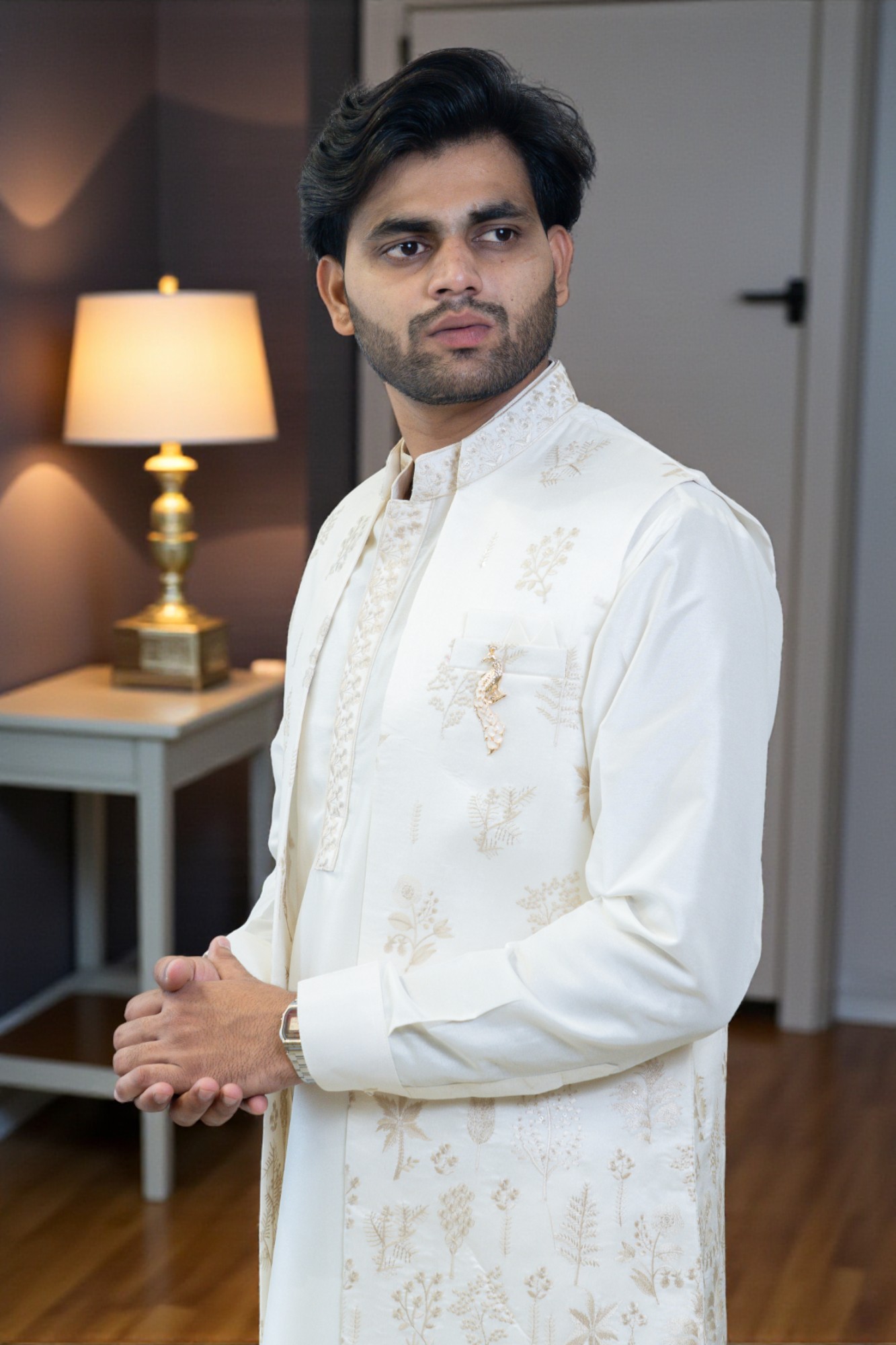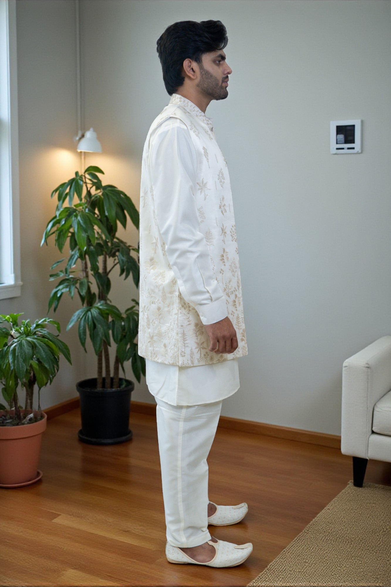 Off-White Kurta Jacket Set for Men – Golden Embroidery Sharq Style