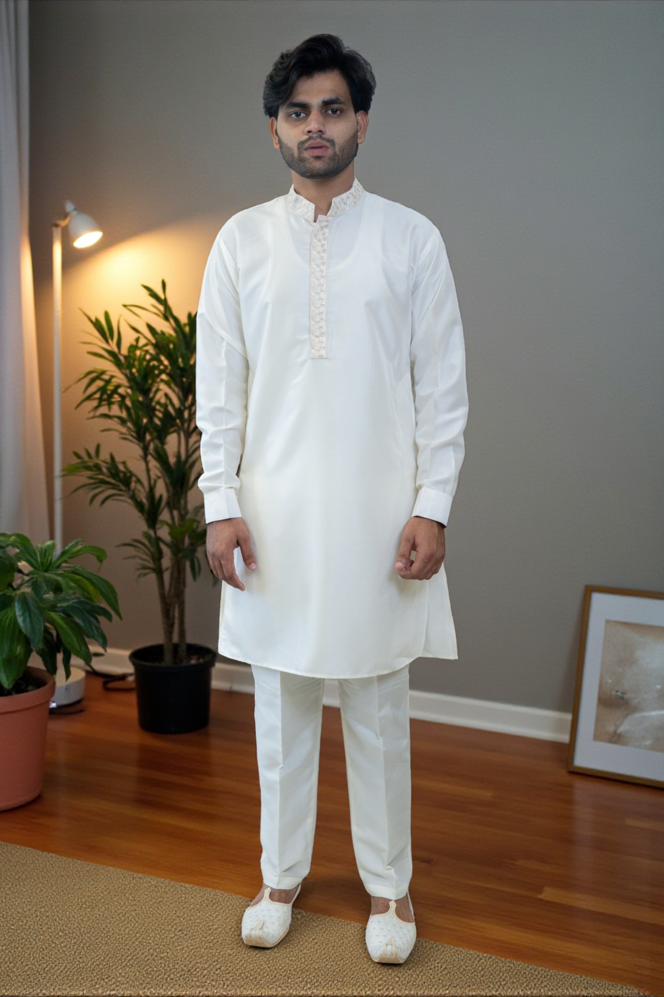 Make a statement at weddings, receptions, parties, or any special occasion with this Off-White Kurta Jacket Set featuring golden embroidery in Sharq style. Crafted from soft, comfortable fabric, the kurta ensures all-day ease. The jacket showcases intricate golden embroidery, giving a rich, elegant, and festive look. Its off-white shade adds a classy and sophisticated appeal, perfect for traditional celebrations. Lightweight and breathable, this set blends comfort and style effortlessly. Pair it with churidar or pajama for a complete ethnic look. Ideal for men who want to look stylish and graceful, this embroidered kurta jacket set is perfect for weddings, receptions, parties, and any occasion wear.