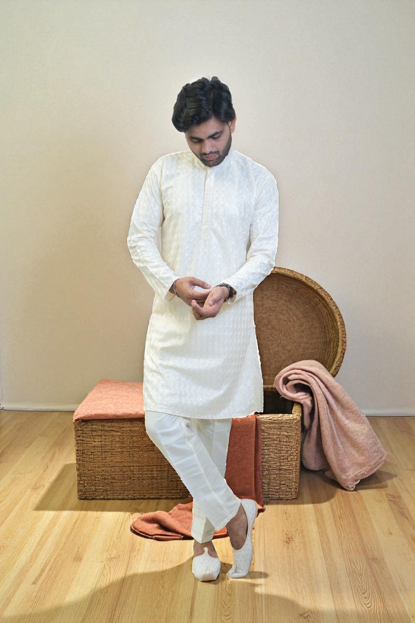 off white kurta pajama, a symbol of sophistication and comfort. The white thread (dhaga) gala embroidery adds a subtle yet royal look, giving this outfit a refined touch perfect for festive and formal events.