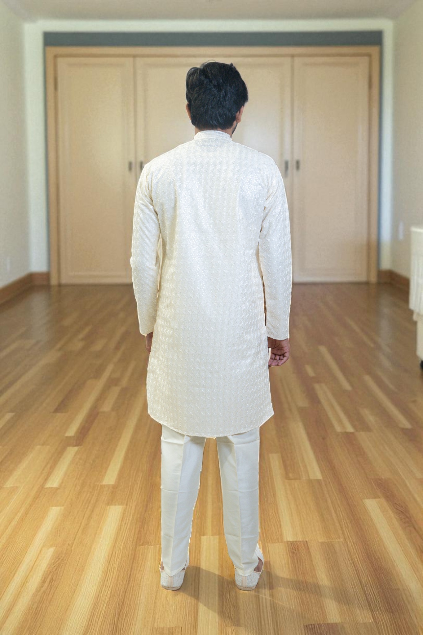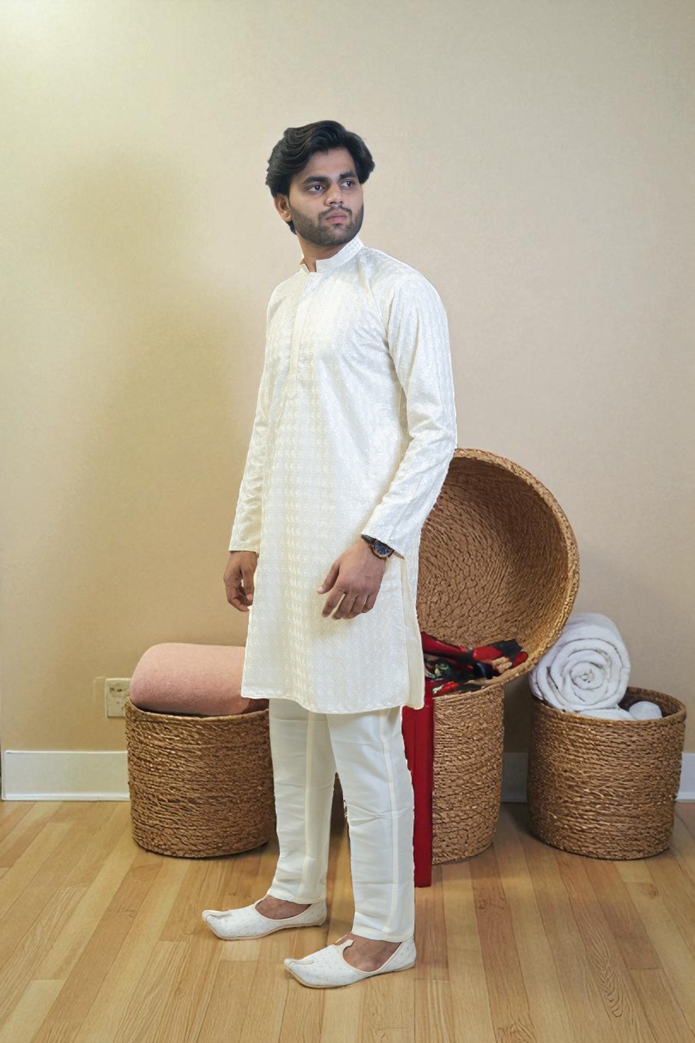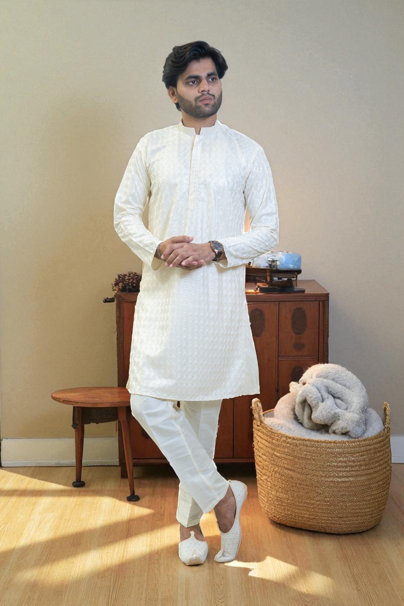 off white kurta pajama, designed with white dhaga gala embroidery and a stylish paint-style pajama. A perfect blend of tradition and modern appeal, this outfit stands out as one of the most attractive and elegant articles for any special occasion.