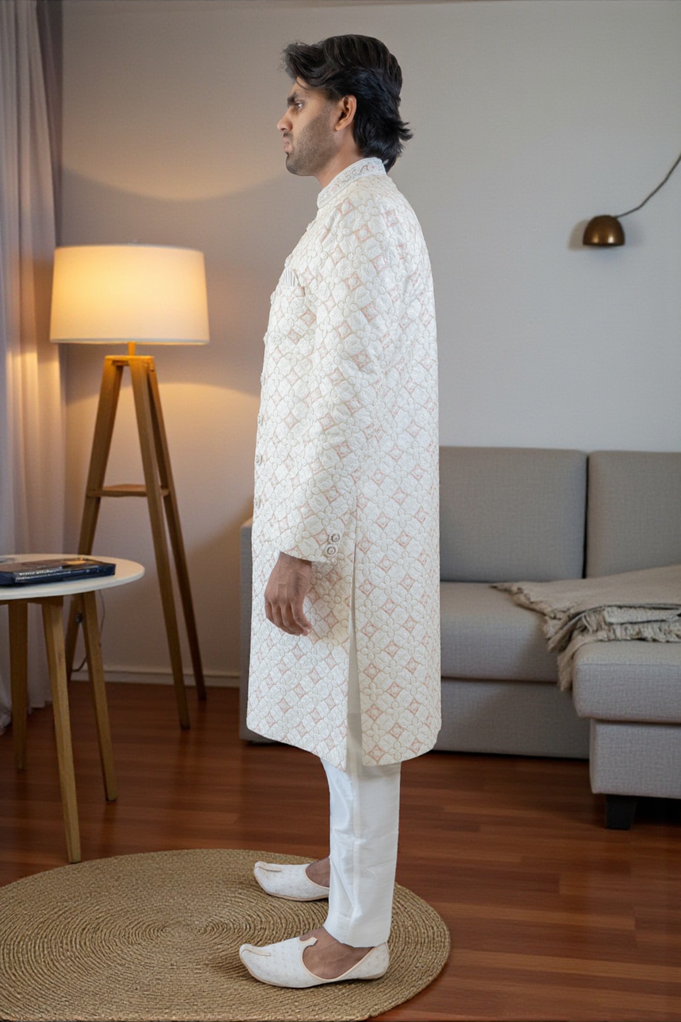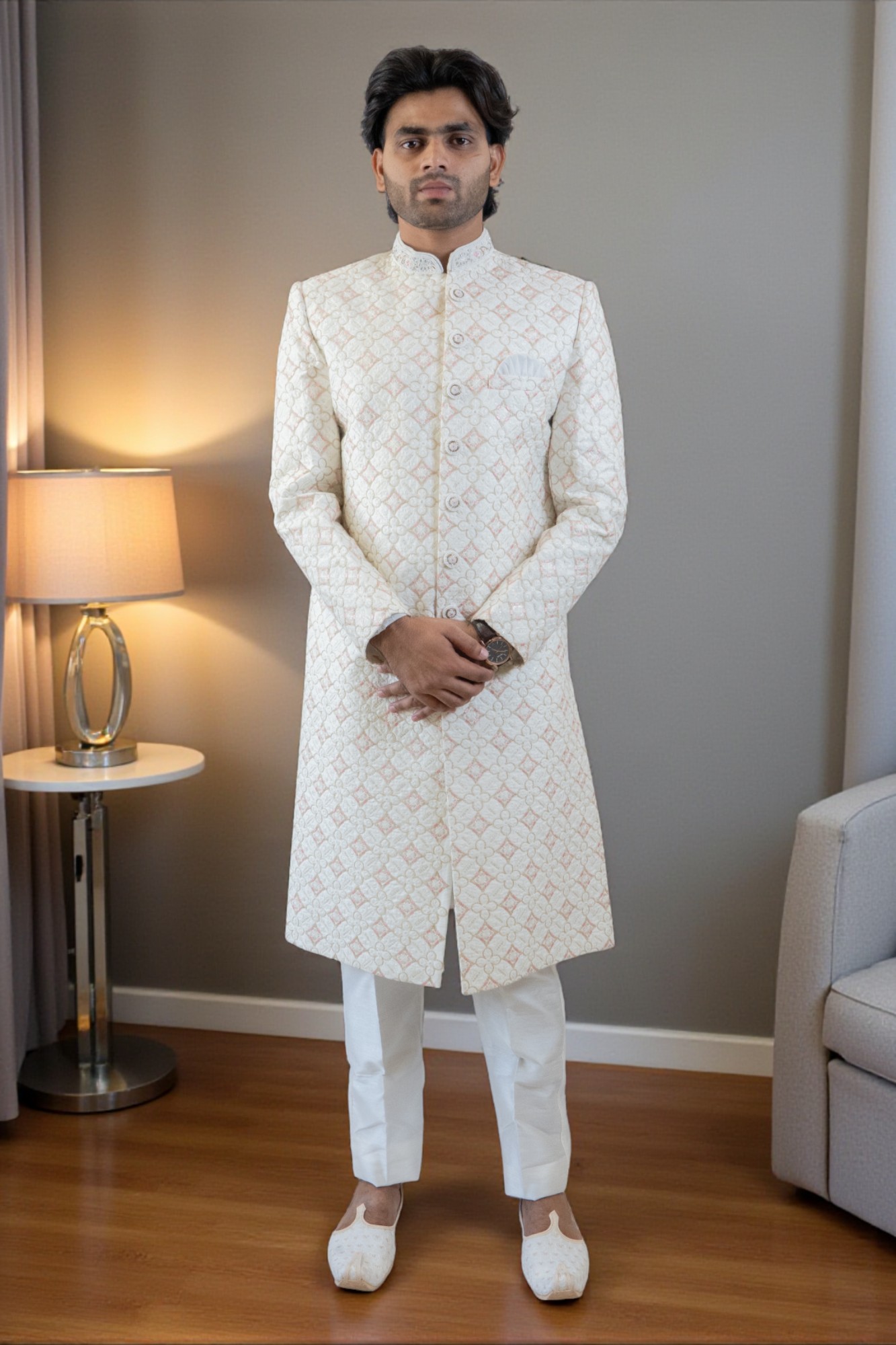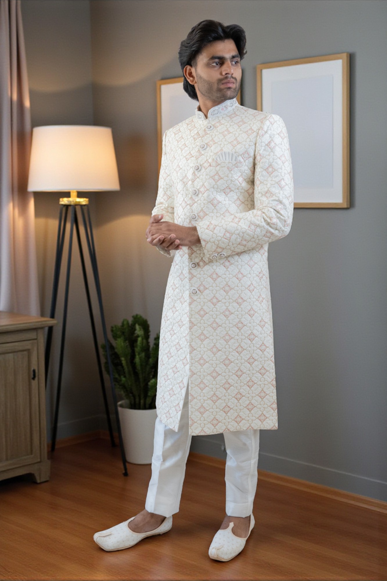 Off-White Sherwani for Men featuring delicate pink floral thread work. Perfect for weddings, parties, and special occasions, it blends traditional charm with a modern touch. Made from soft, premium fabric, it feels comfortable and lightweight for all-day wear. The intricate thread embroidery gives a royal and classy look, while the modern cut keeps it stylish and trendy. Pair it with churidar, dhoti, or slim-fit pants for a complete ethnic outfit. Durable and elegant, this sherwani makes you stand out effortlessly. Its off-white base with soft pink thread patterns offers a sophisticated and vibrant appearance, ideal for men who love modern ethnic fashion.