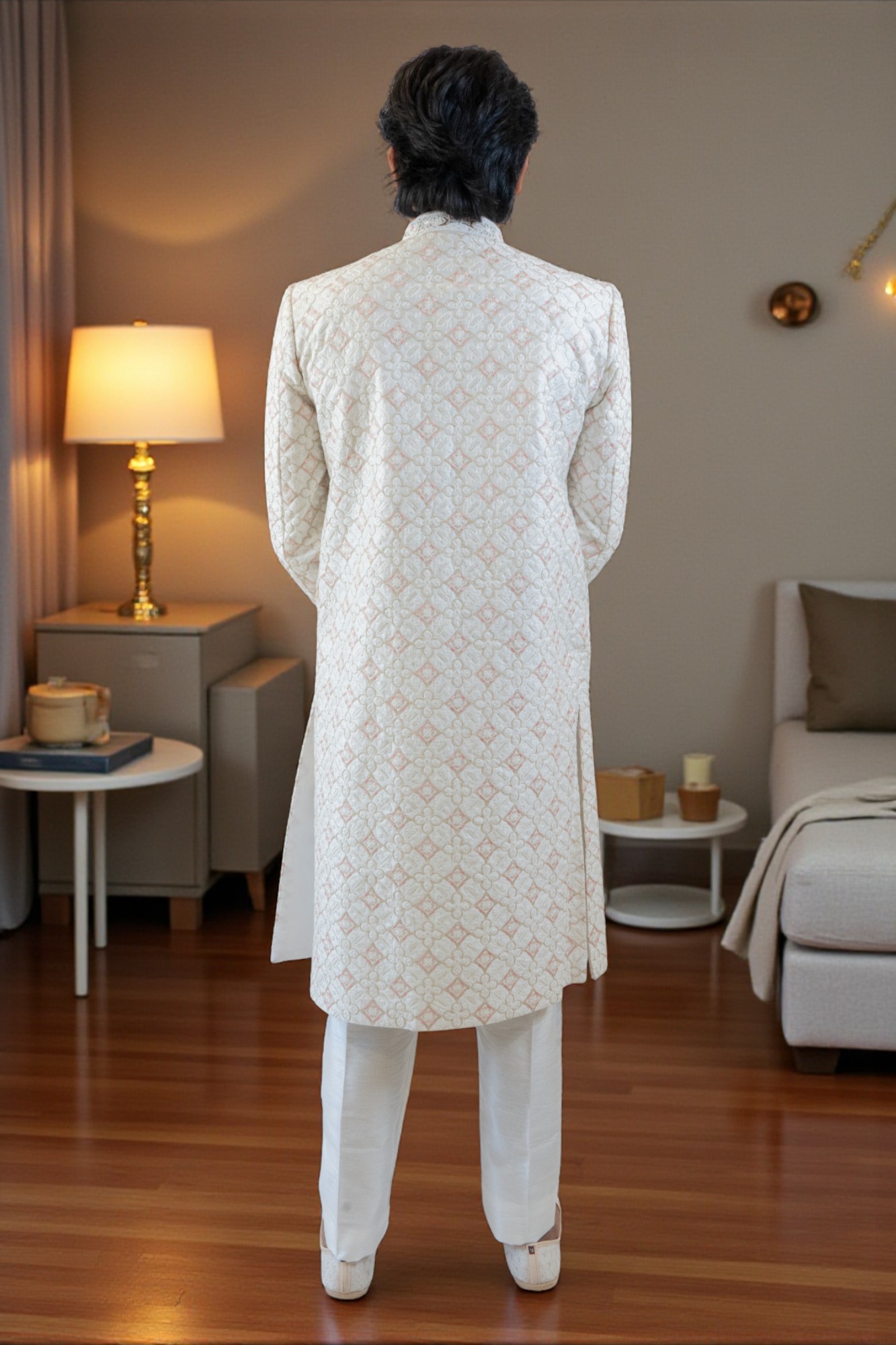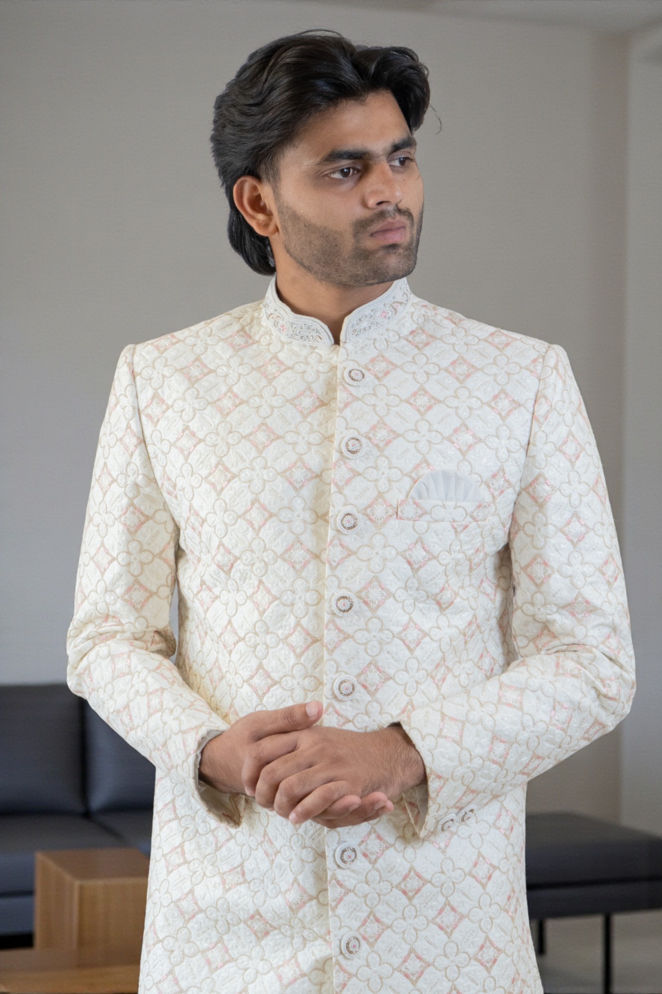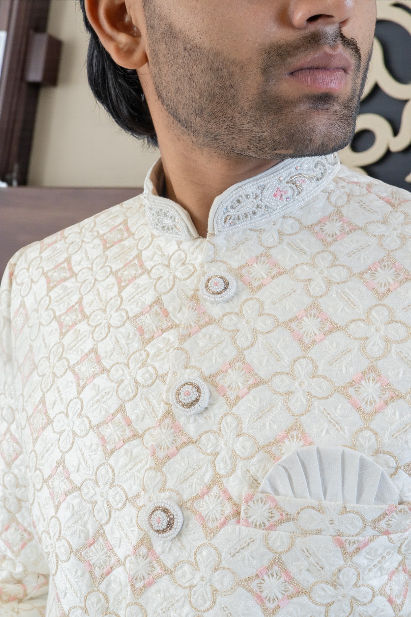 Off-White Sherwani Set for Men with Pink Floral Thread Work – Elegant & Modern