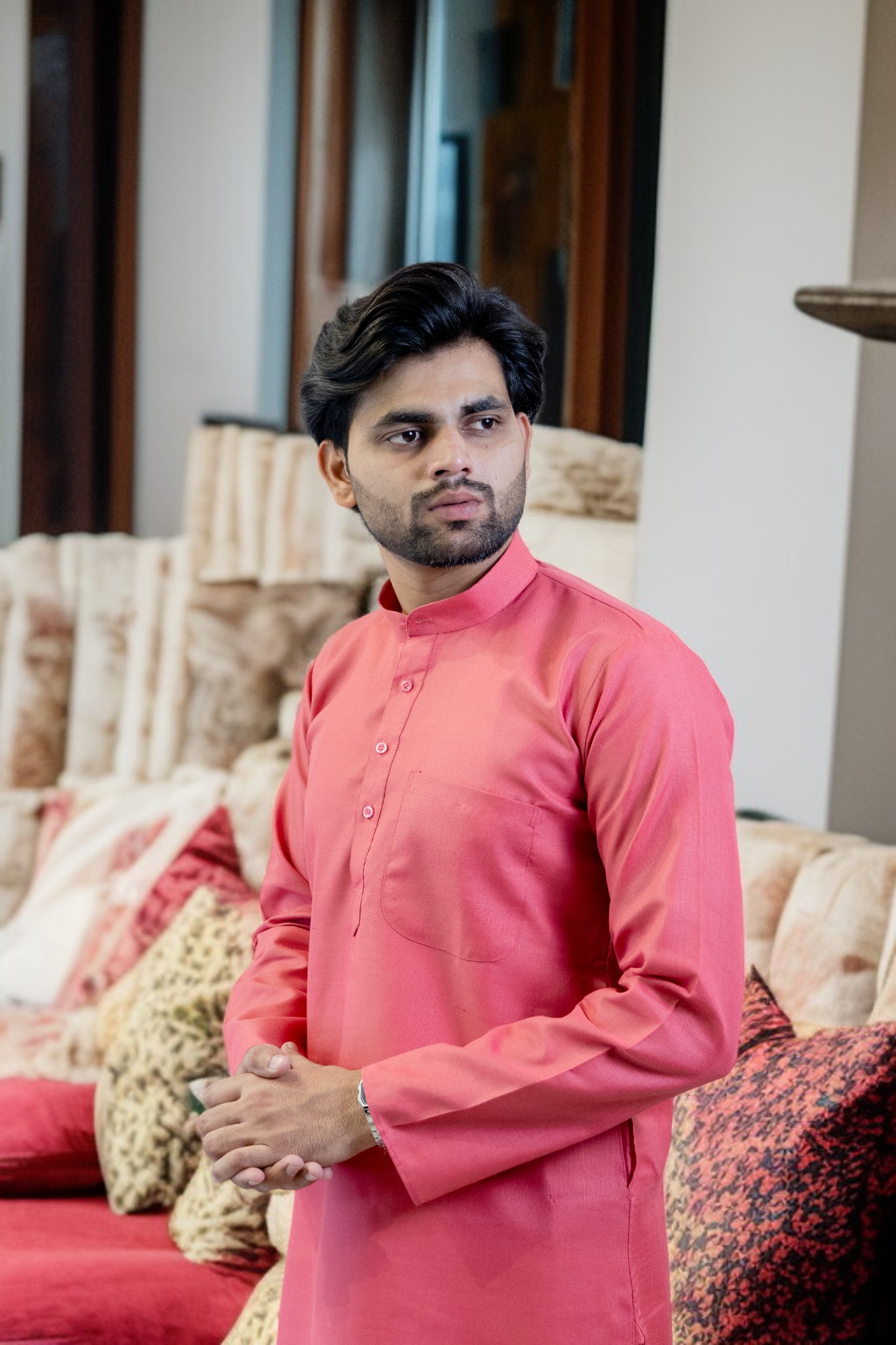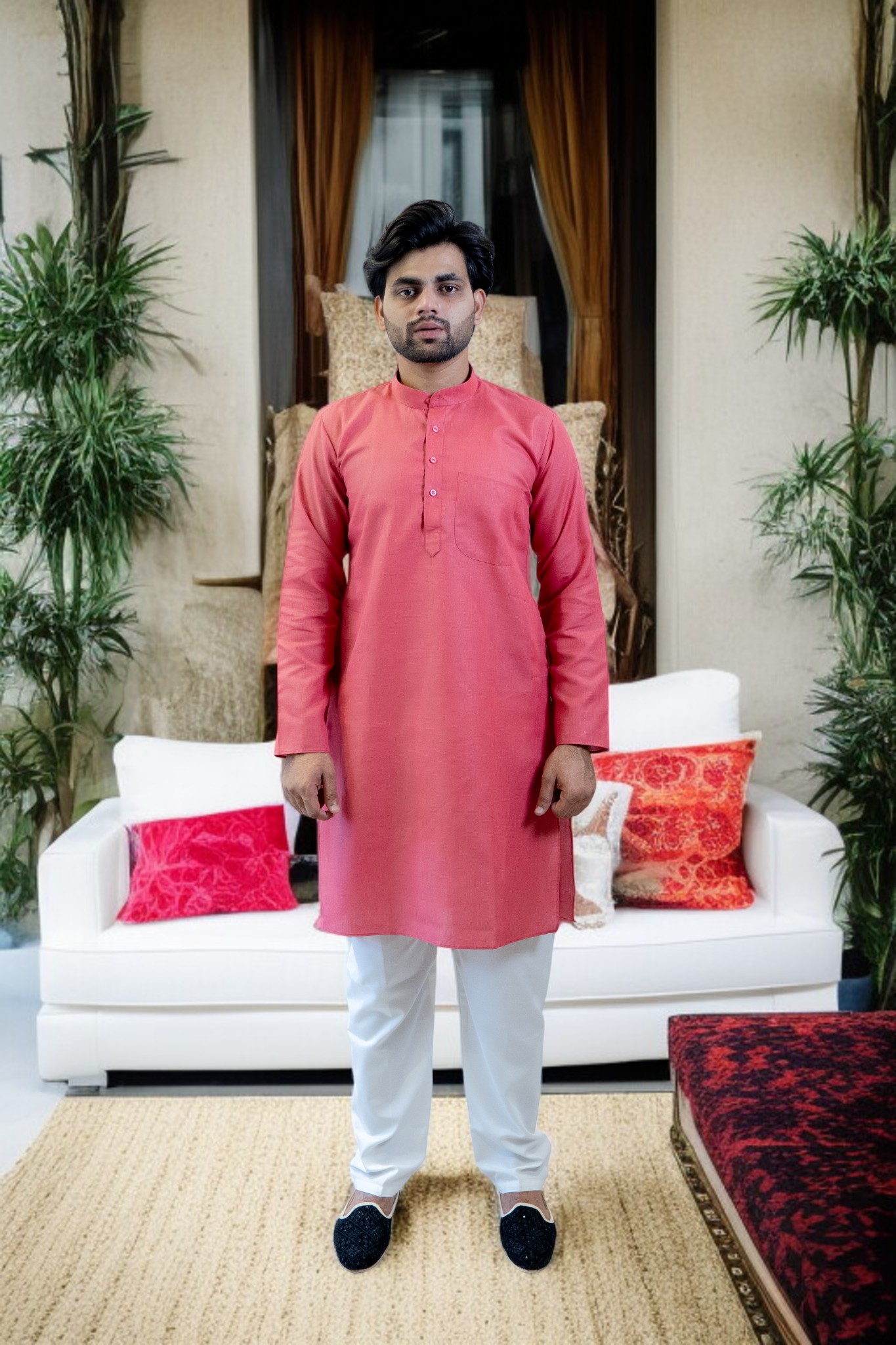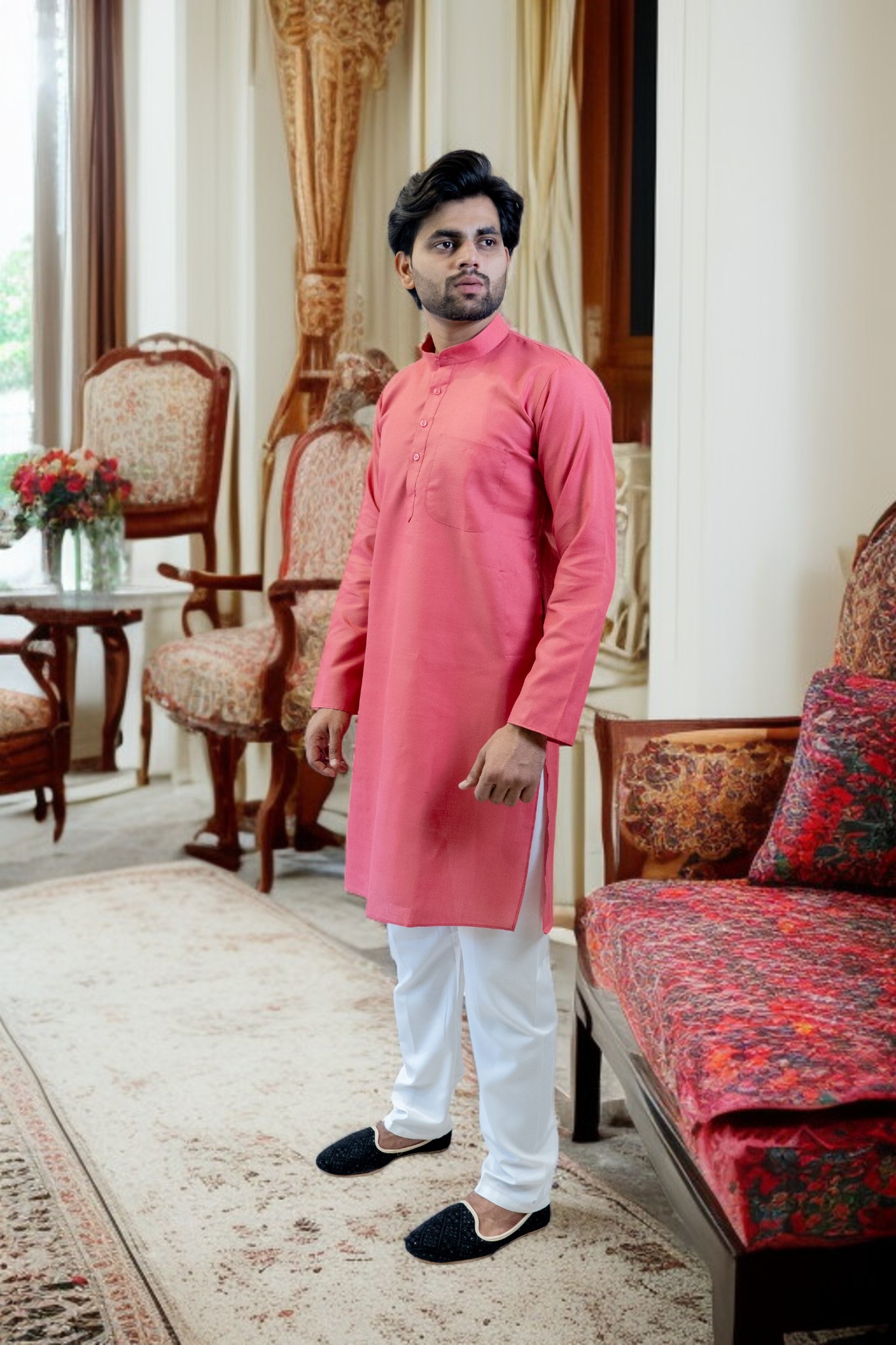 The plain, classic kurta features a subtle pink shade that adds a fresh, elegant look, perfect for both daytime and evening events. Paired with a matching cotton pajama, it provides a coordinated and classy appearance suitable for all age groups.