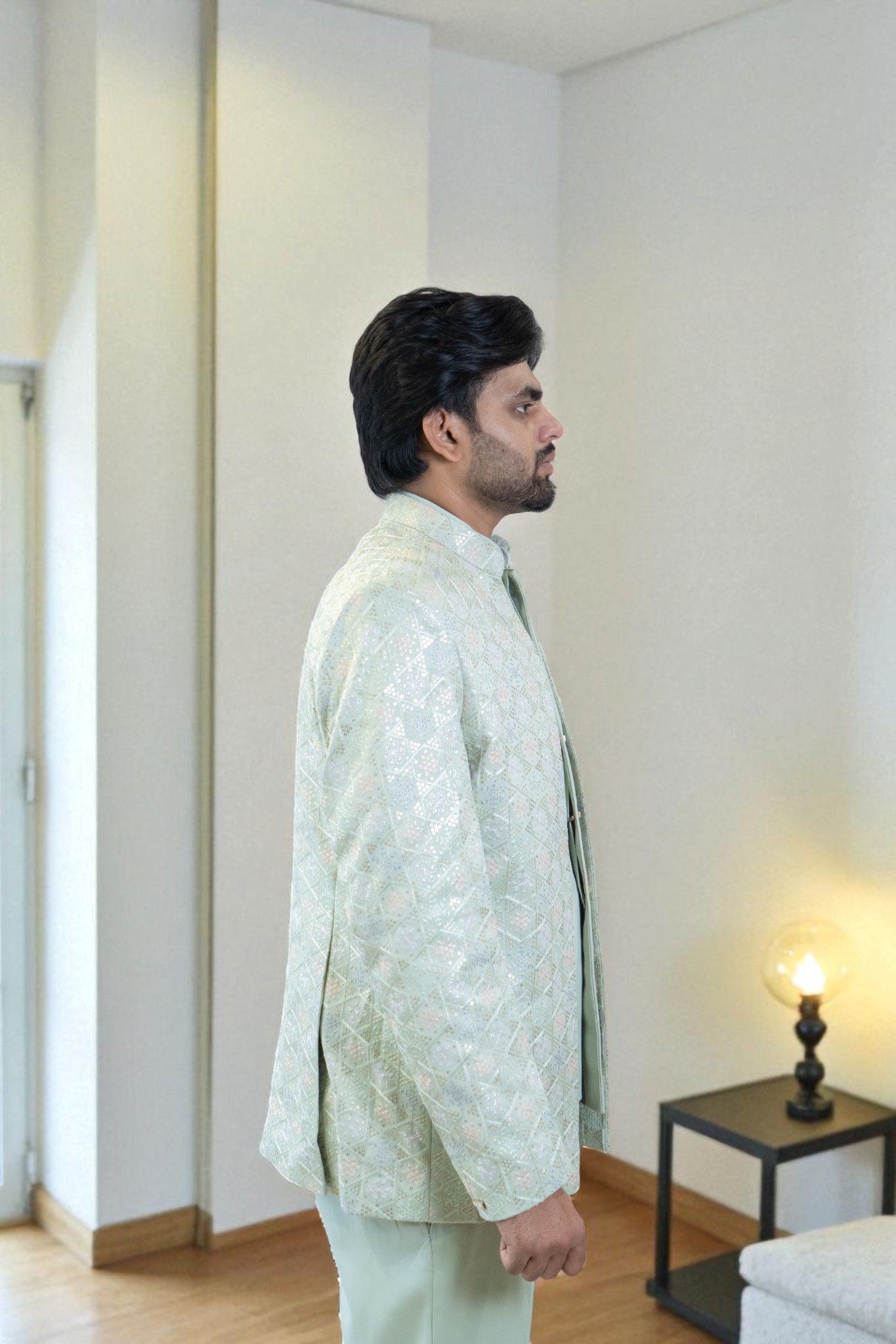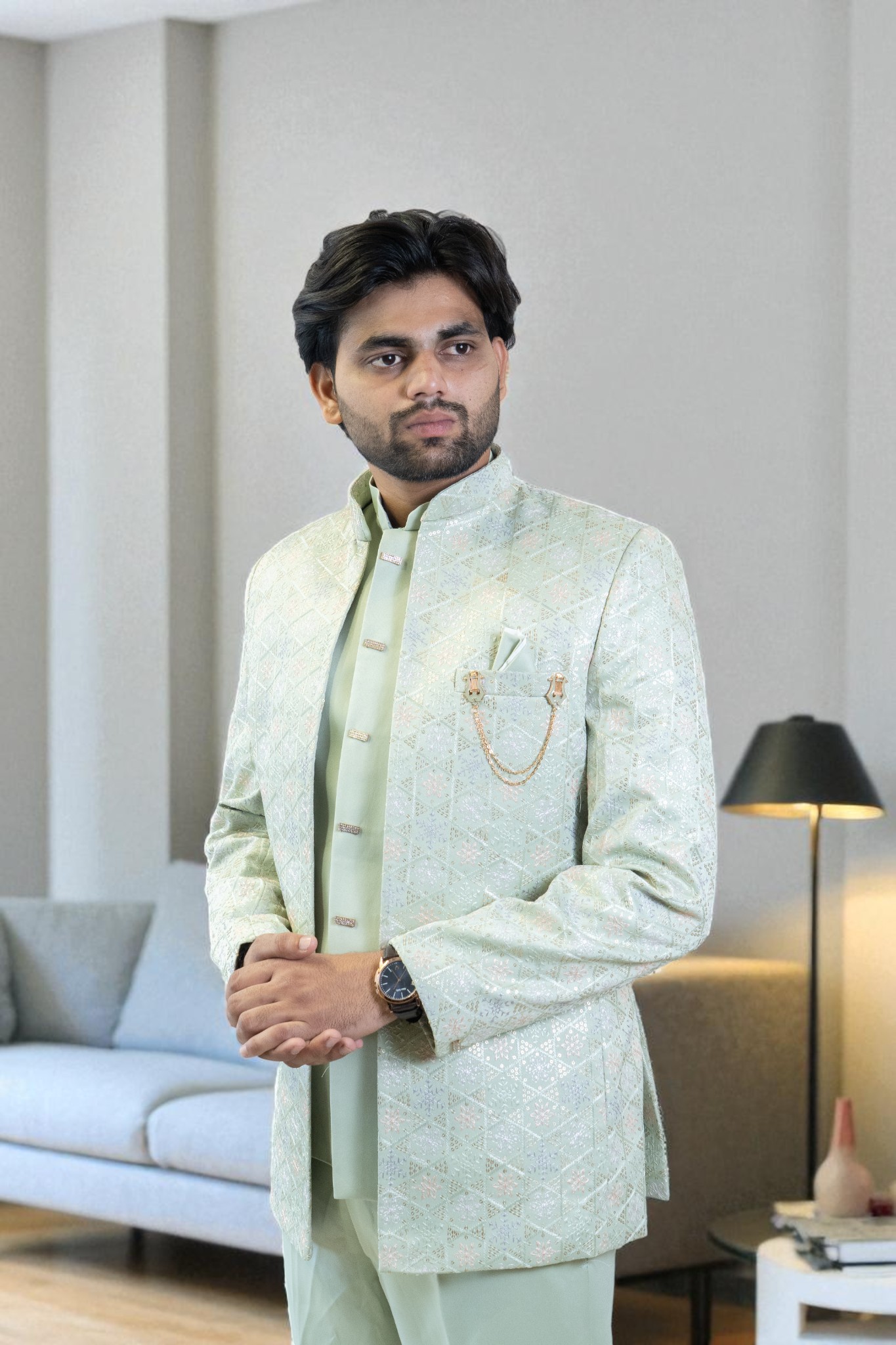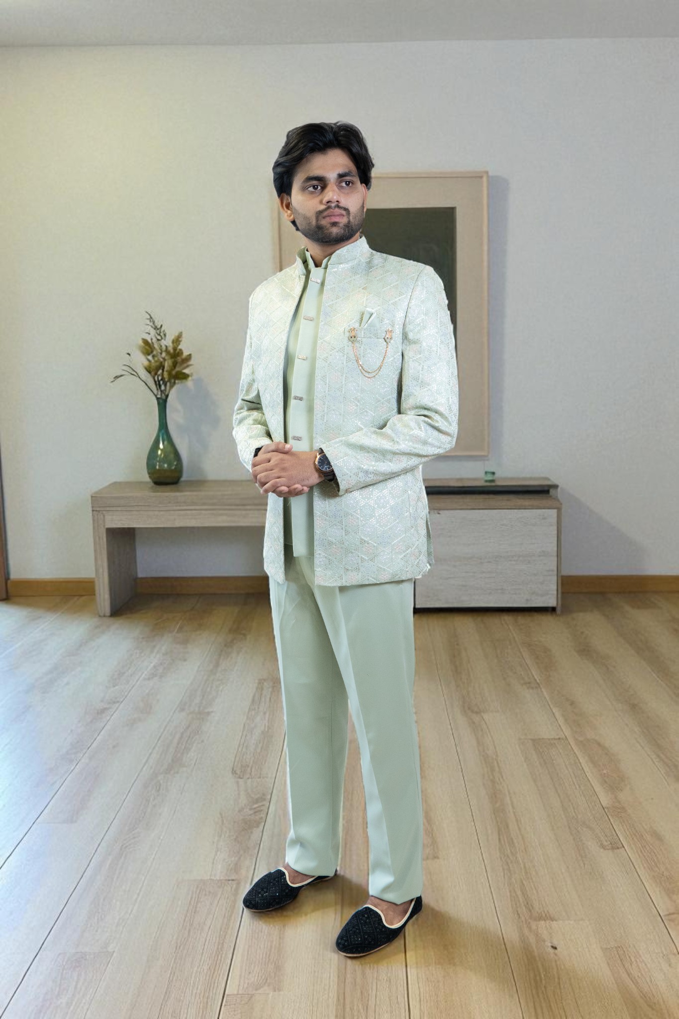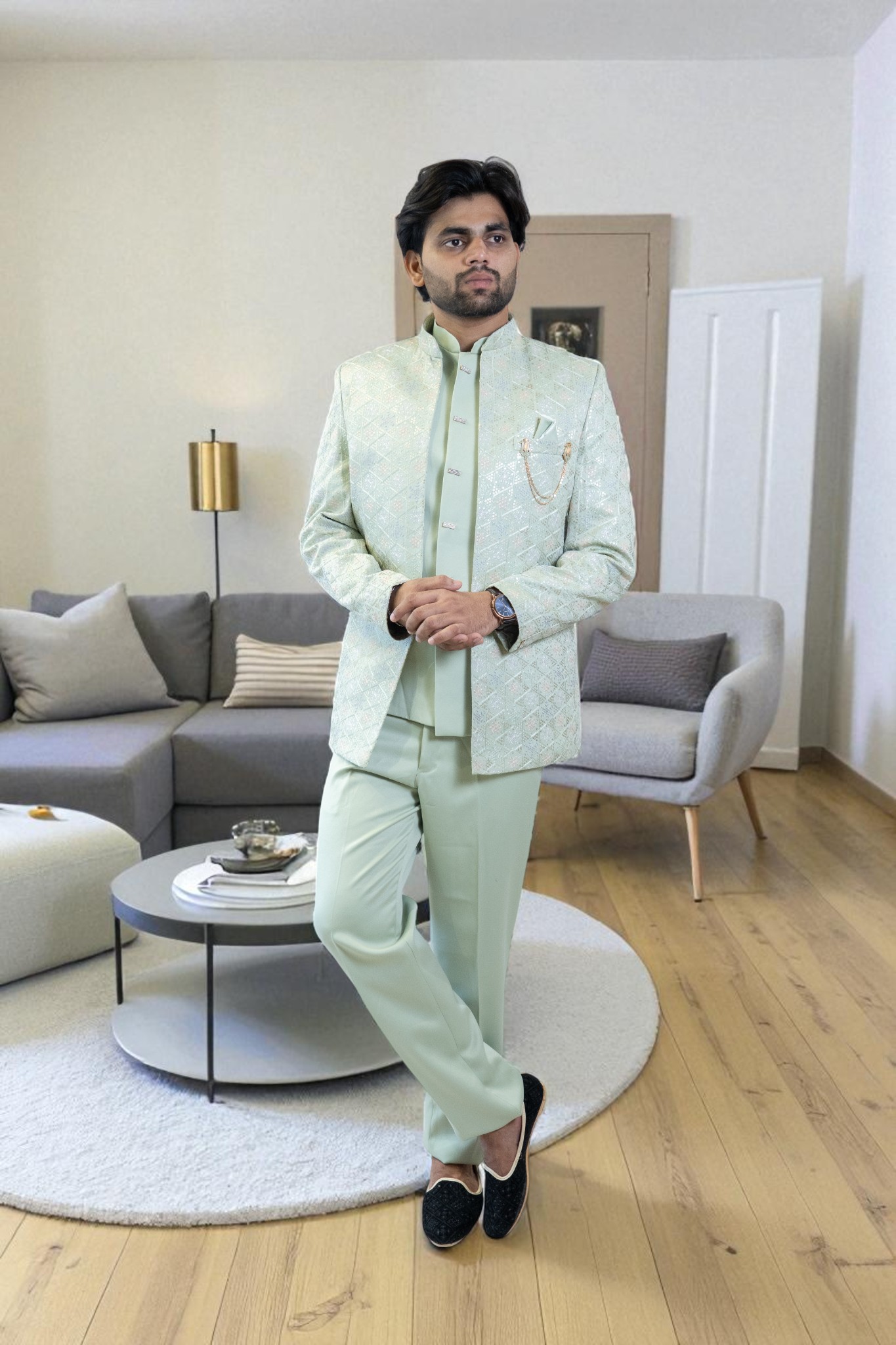 Pista Green Jodhpuri Suit, crafted from premium suiting fabric for a soft and comfortable feel. The elegant sequin design adds a royal and classy touch, perfect for weddings, parties, and festive occasions. Comes with a same-color pant for a complete, stylish look.