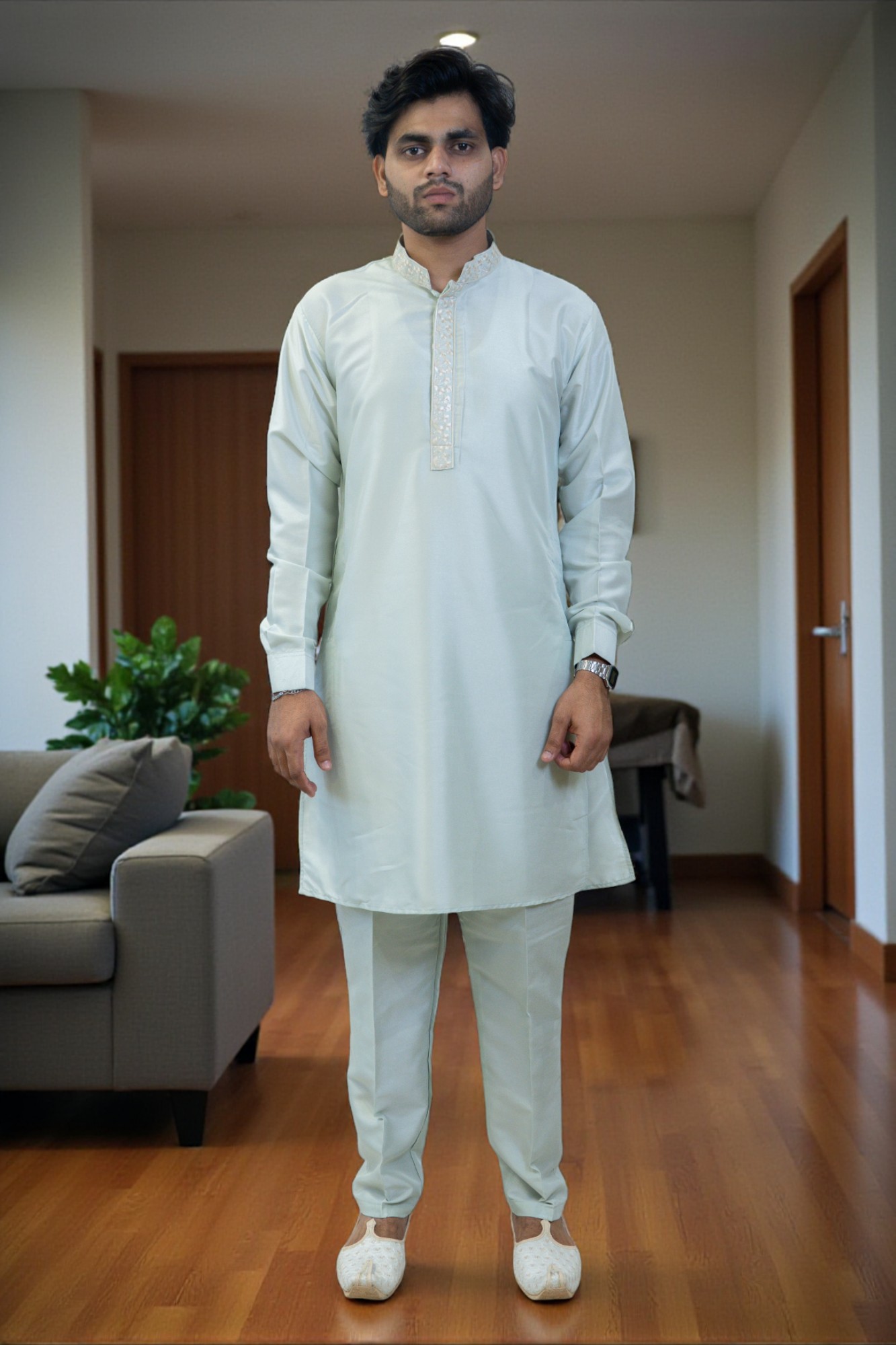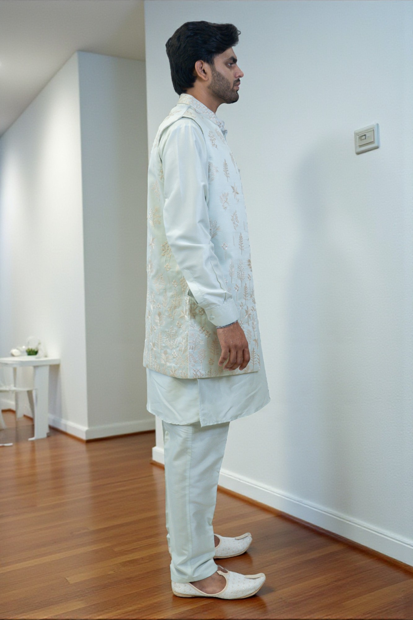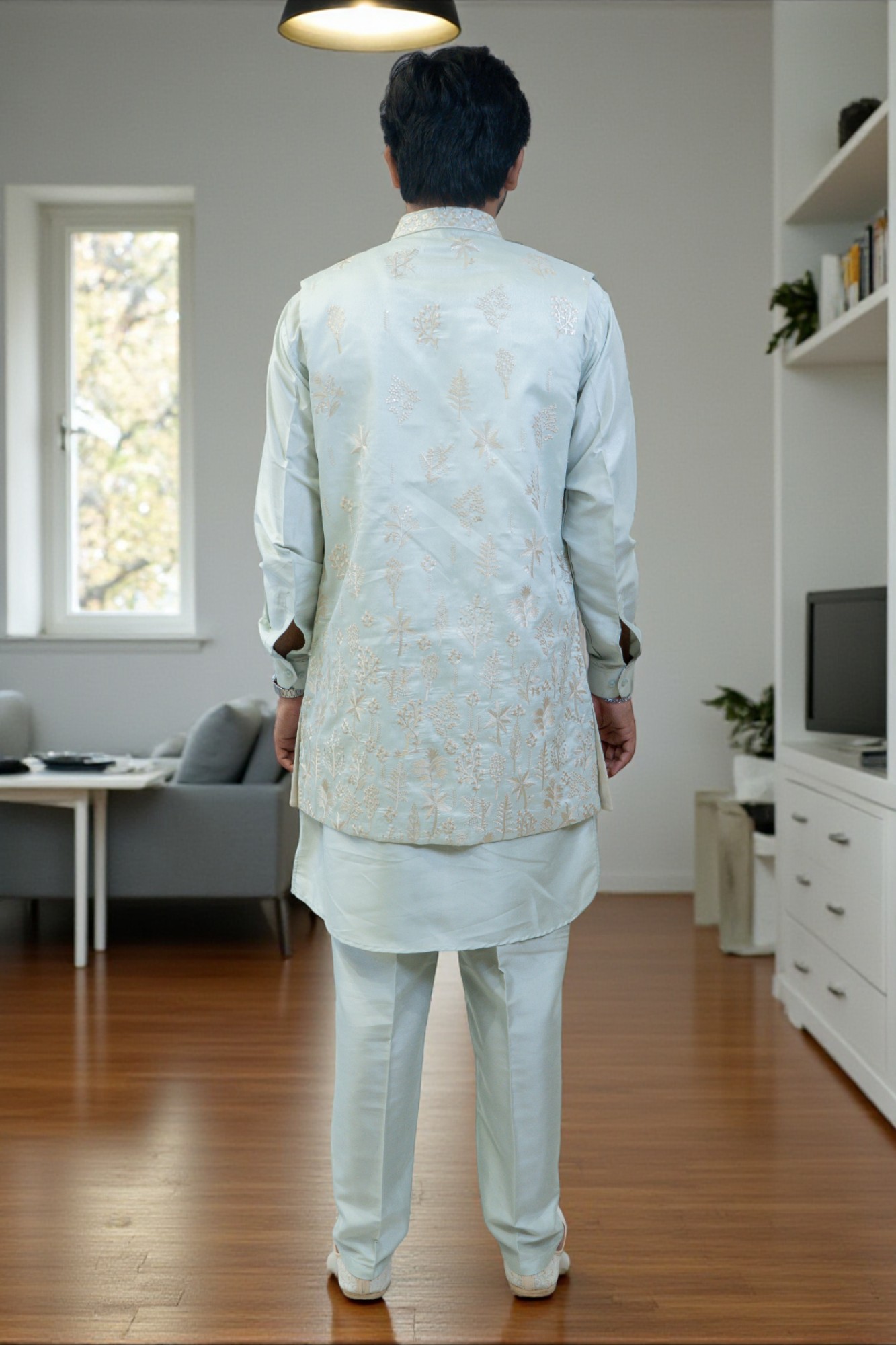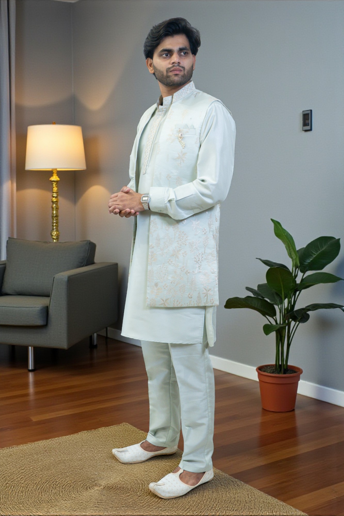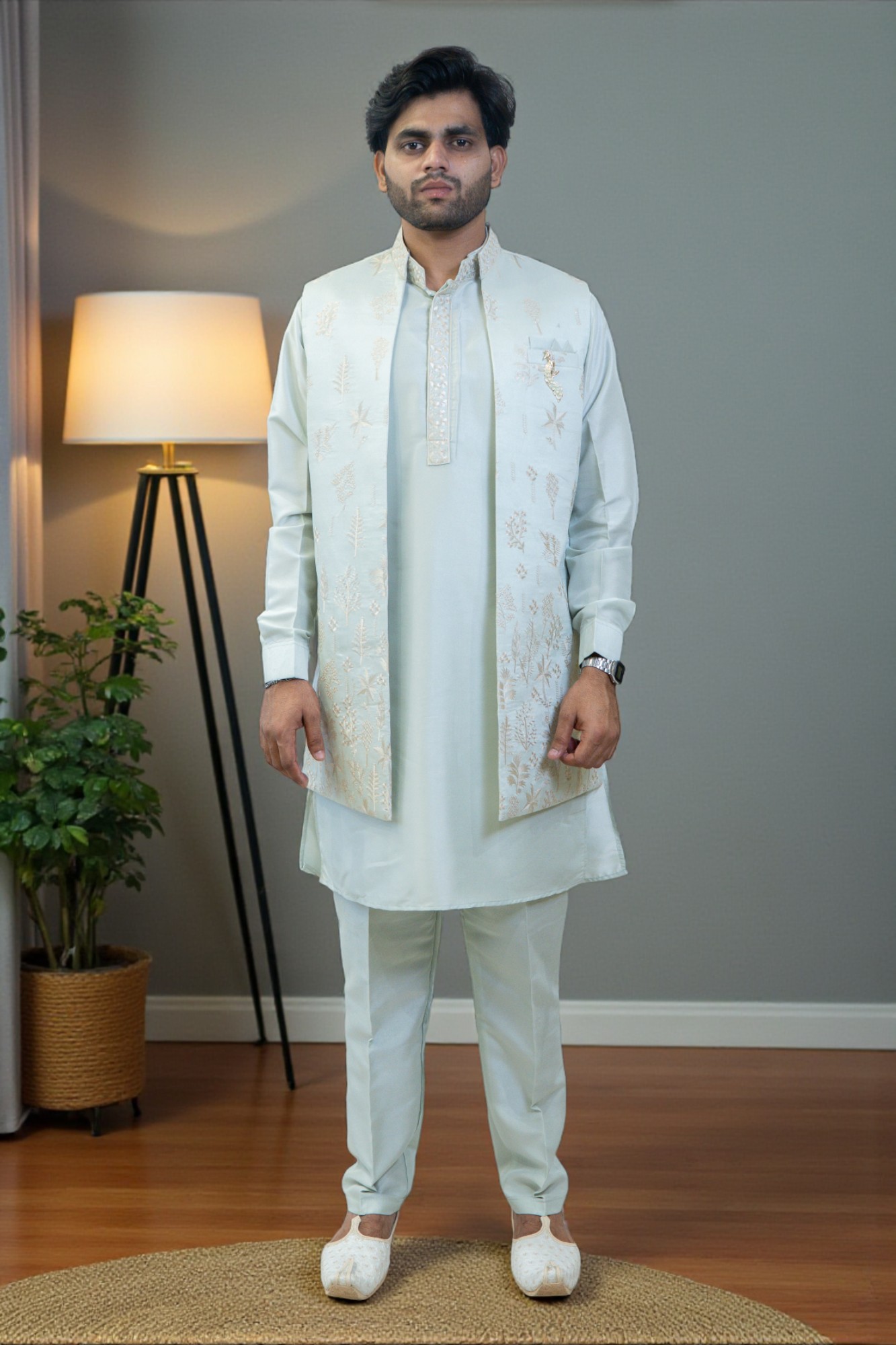 Sea Green Kurta Jacket Set. Made from soft, comfortable fabric, the kurta ensures all-day ease. The jacket adds a modern touch with a smart, elegant design and fine finishing. Its slight shine gives a rich, festive look, perfect for weddings, parties, and traditional occasions. The set combines style, comfort, and classic appeal in one outfit. Pair it with churidar or pajama for a complete ethnic appearance. Lightweight, breathable, and stylish, this set is perfect for men who want to look elegant without compromising comfort. Make your celebrations more special with this attractive kurta jacket set.