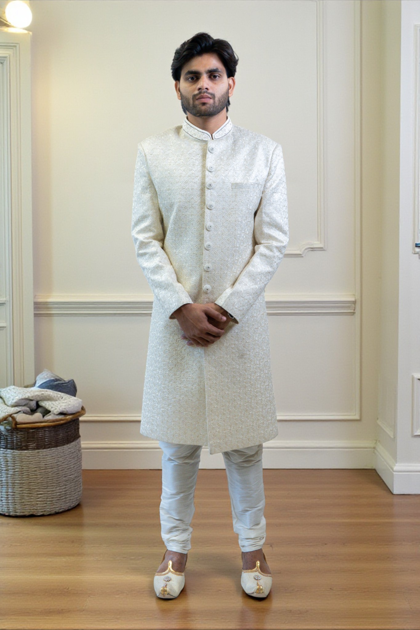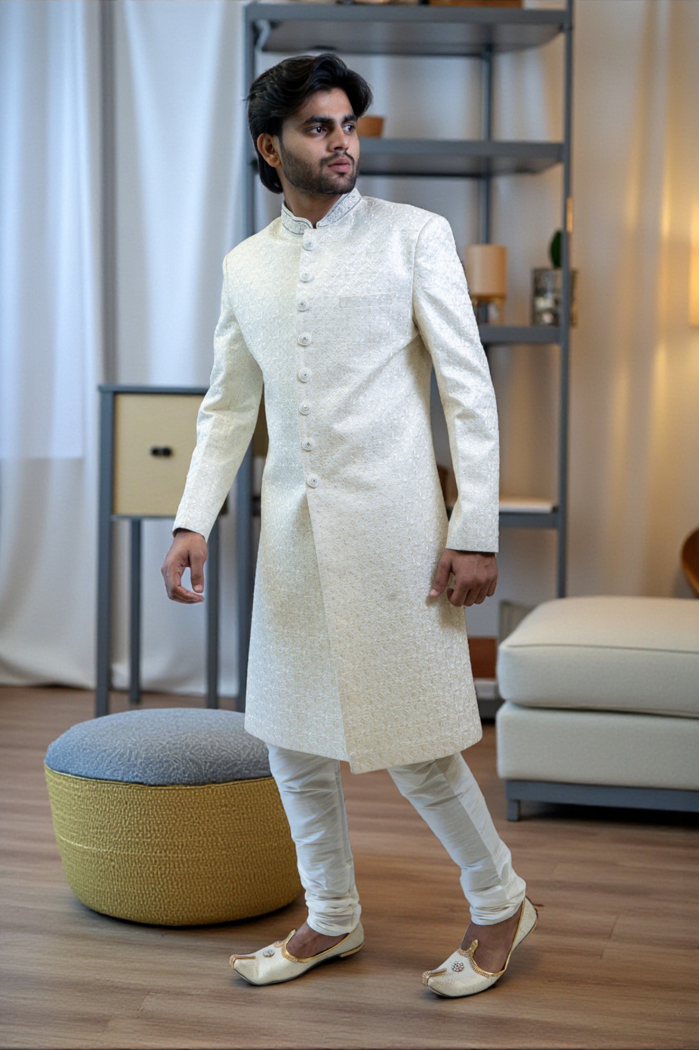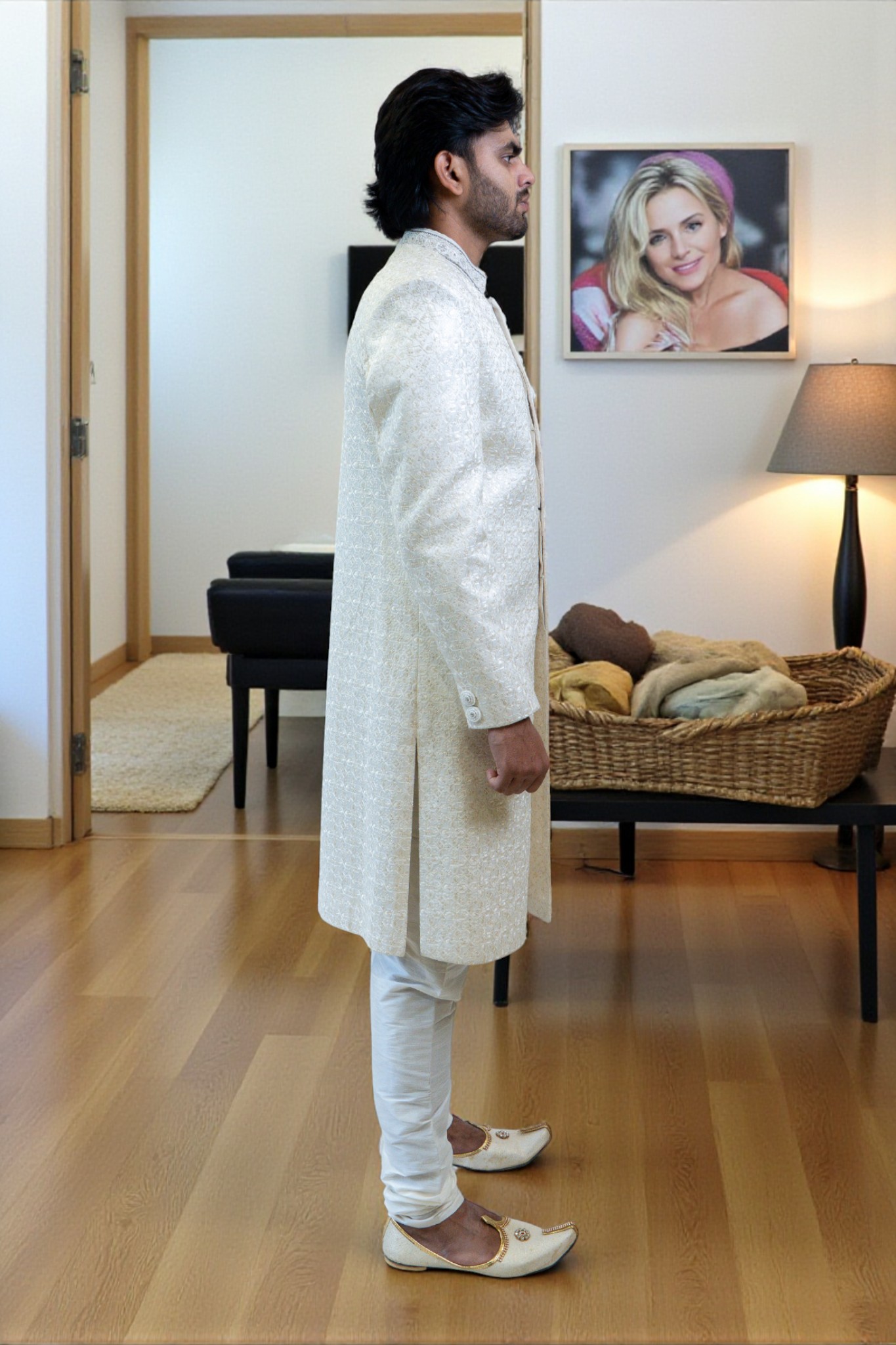 Off-White Floral Sherwani Set for Men – Stylish Sequins Design & Comfortable Fit
