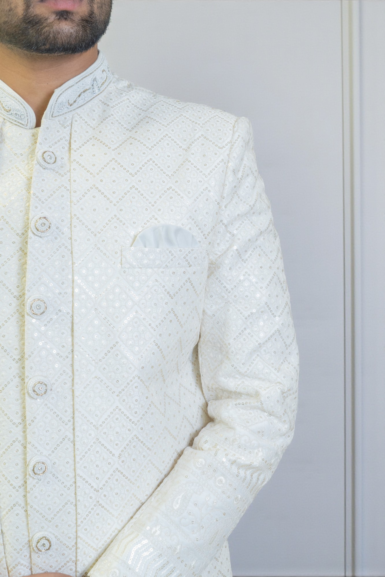 This Sherwani for men with classic thread design is made with premium suiting fabric, which is soft, smooth, and comfortable to wear all day. The thread embroidery adds a rich and elegant look, perfect for weddings, receptions, festive events, and special occasions.