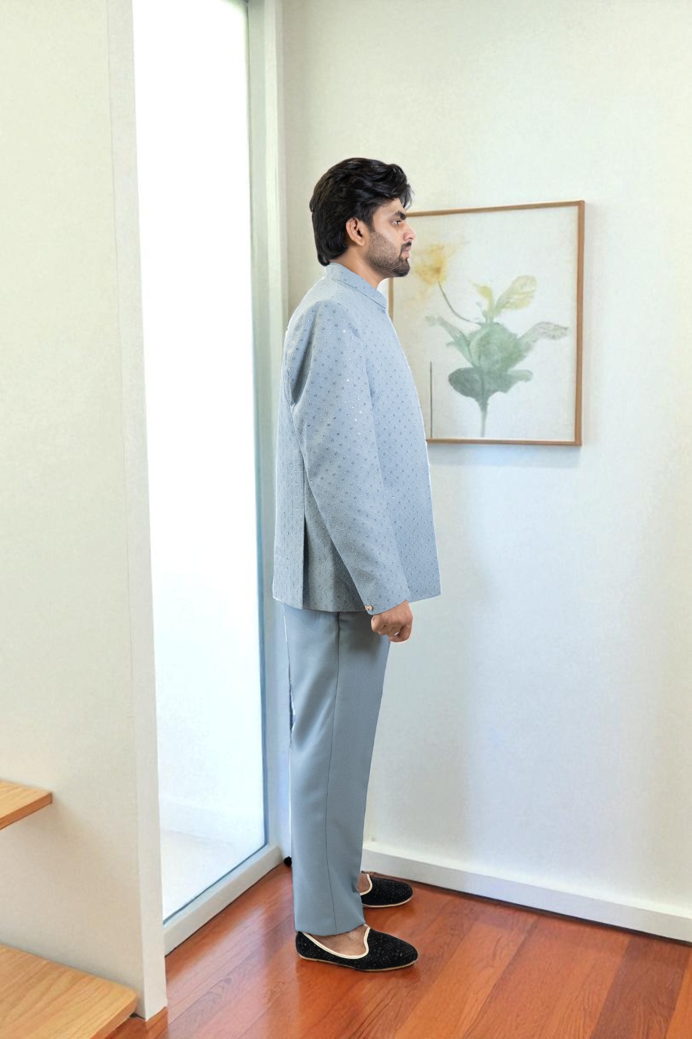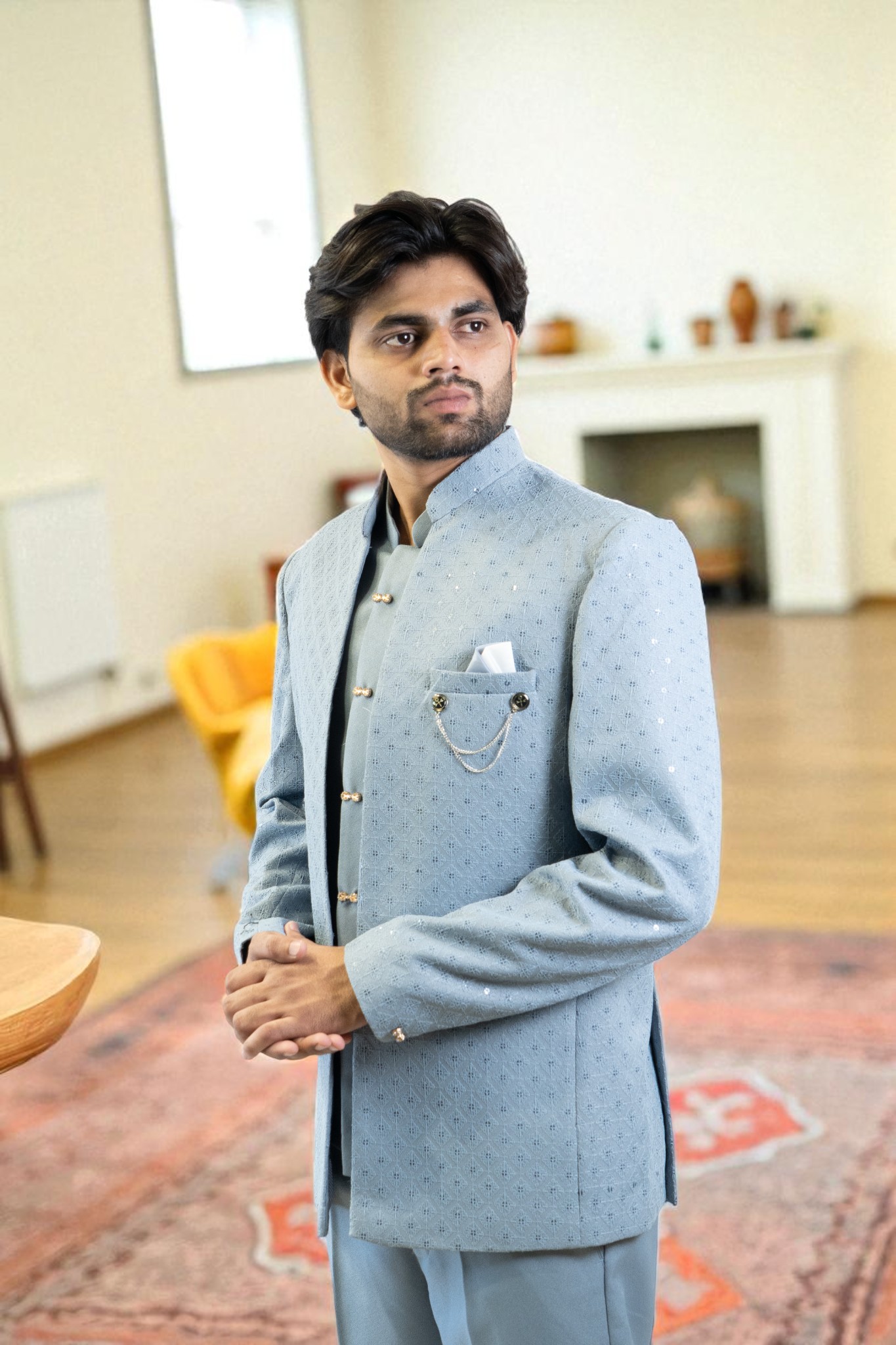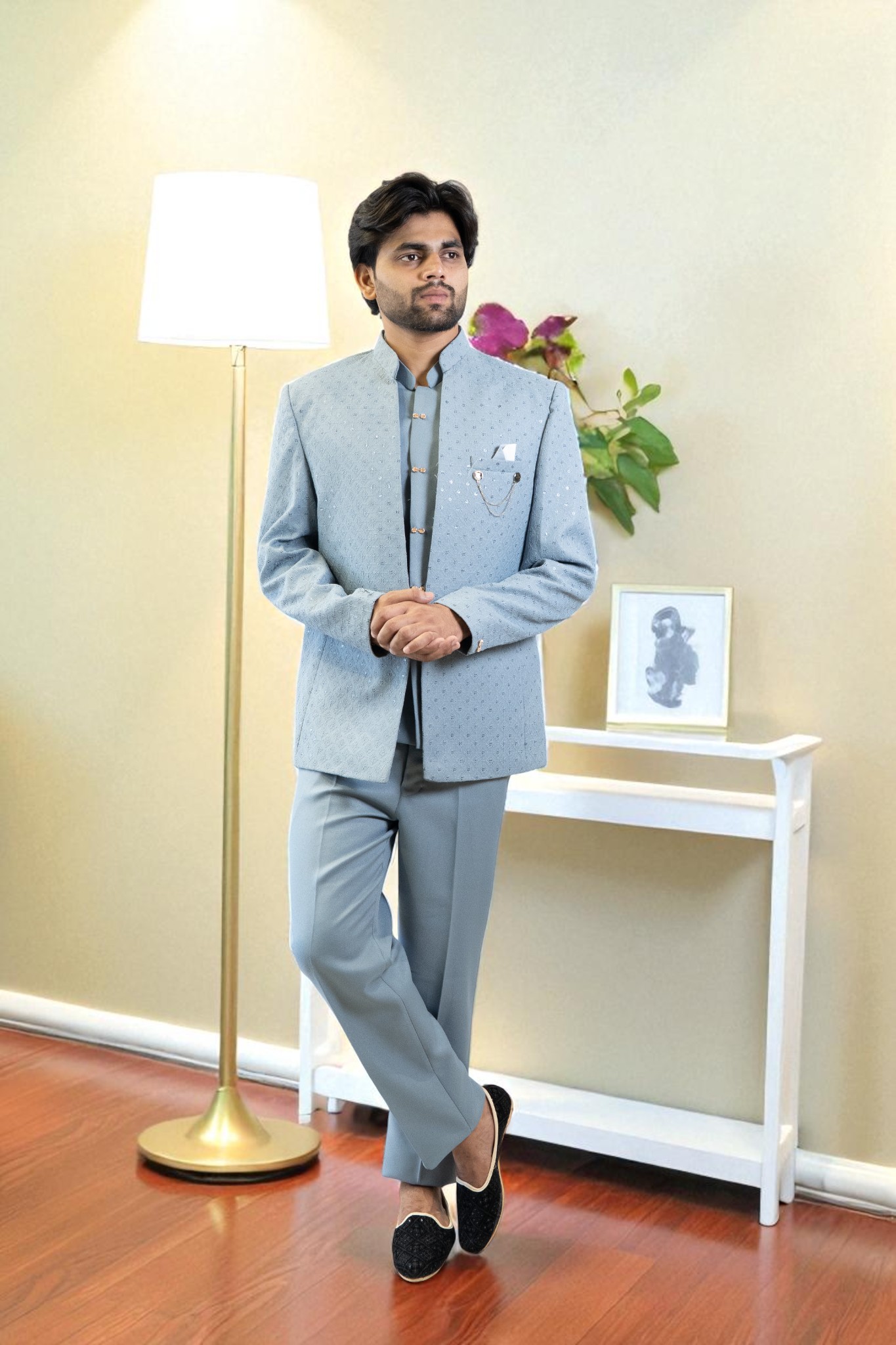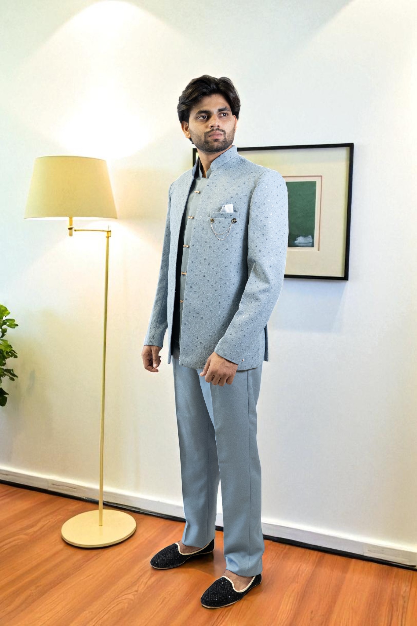 Sky Blue Jodhpuri Suit, crafted from premium suiting fabric for a soft and comfortable feel. The beautiful sequin design adds a royal and stylish touch, making it perfect for weddings, receptions, parties, and festive events.
