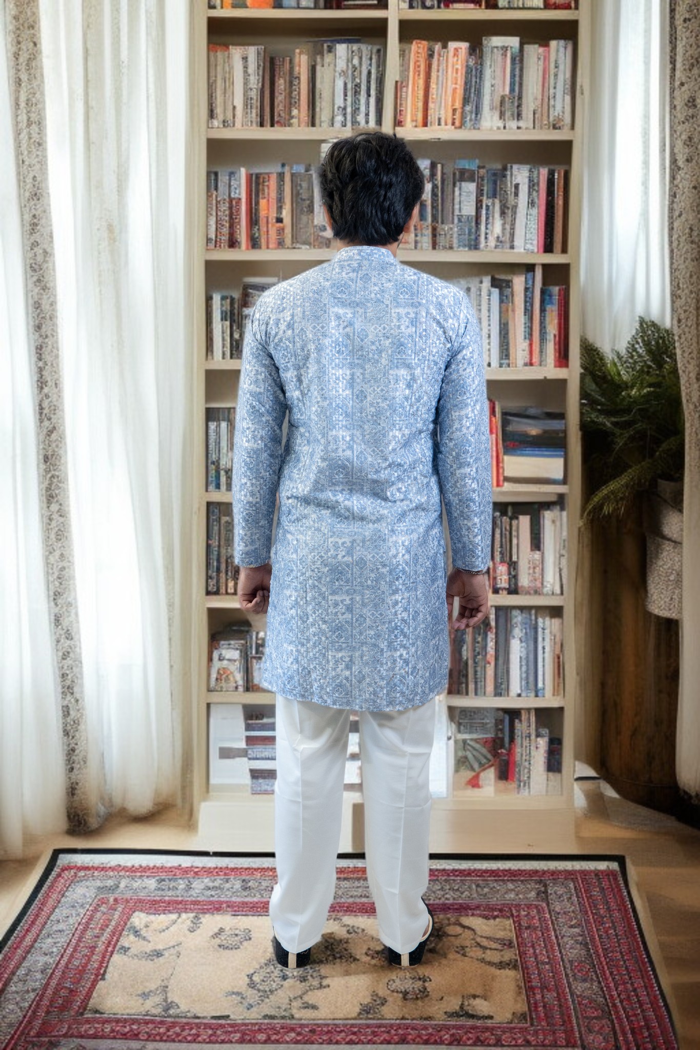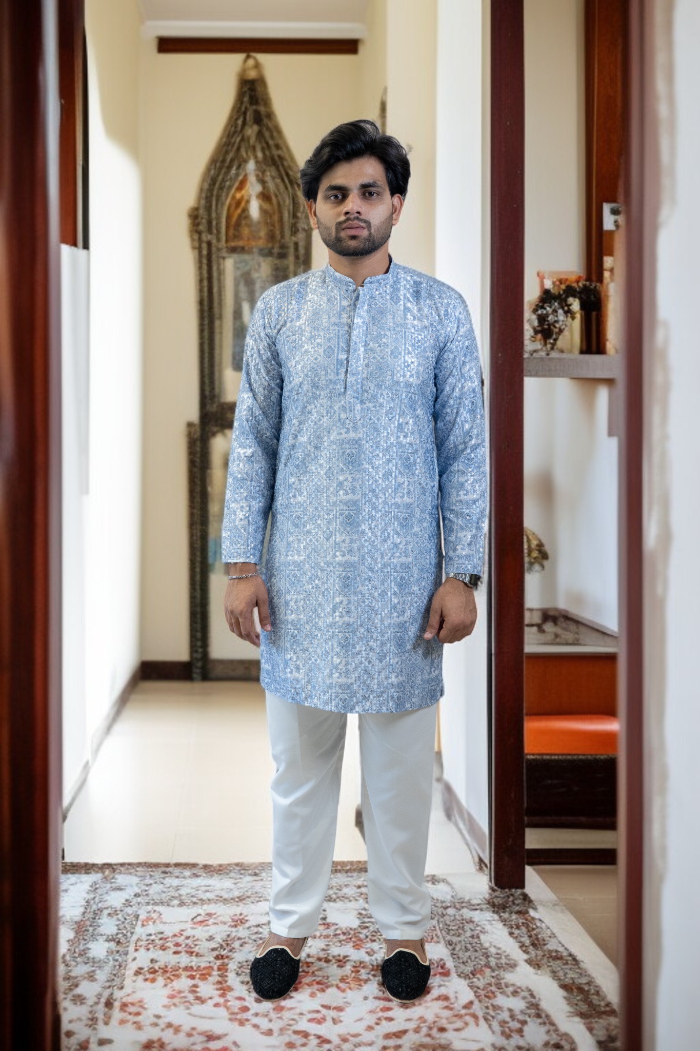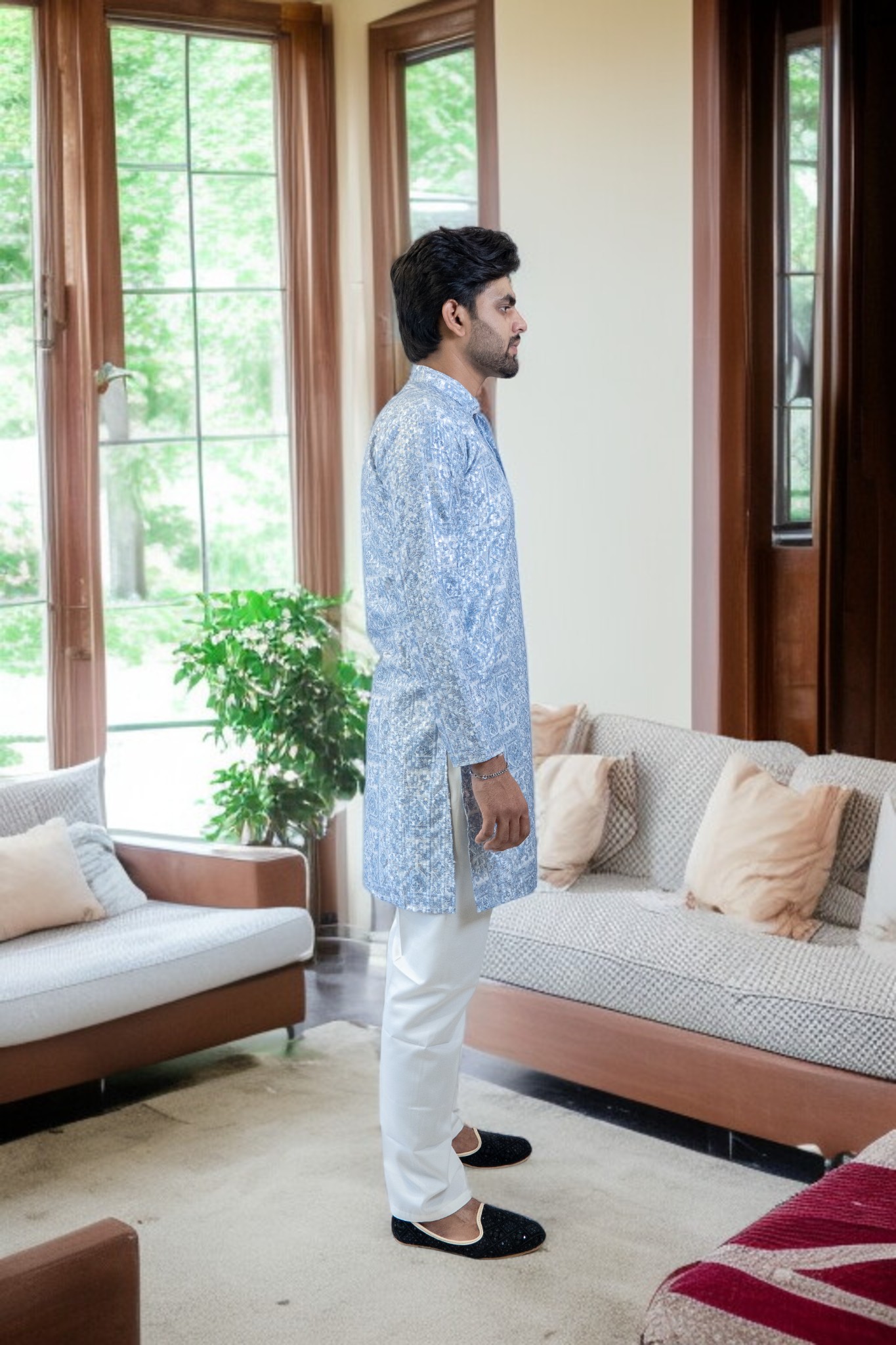Sky Blue Pajama with Kurta Print. With its stunning sky blue background and contemporary printed patterns, the kurta gives you a stylish yet classic appearance. Because of its soft cotton-silk construction, it is light, breathable, and easy to wear for extended periods of time.