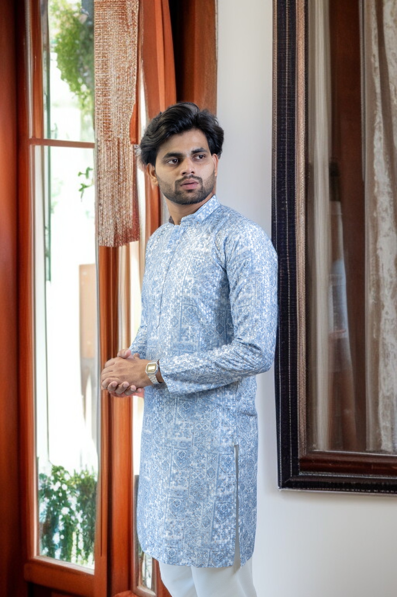 Look fresh and stylish in this Sky Blue Printed Kurta with Pajama Set. Soft fabric and trendy prints make it perfect for festivals, parties, and family events.
