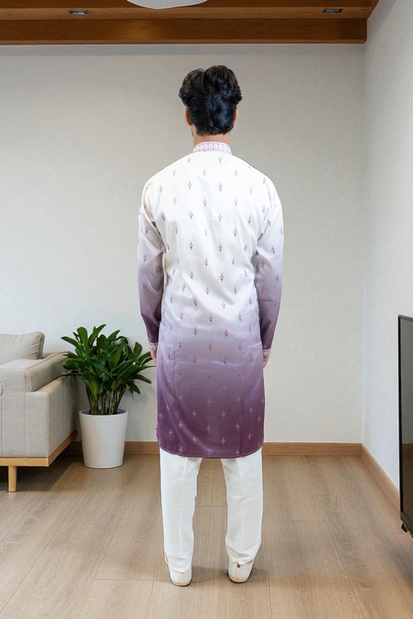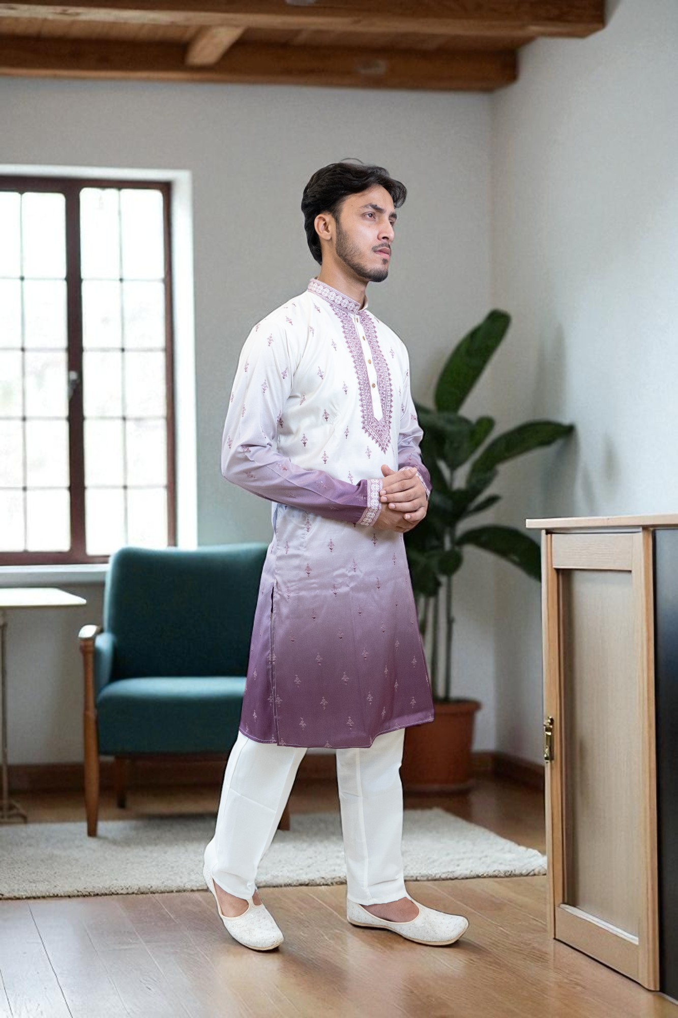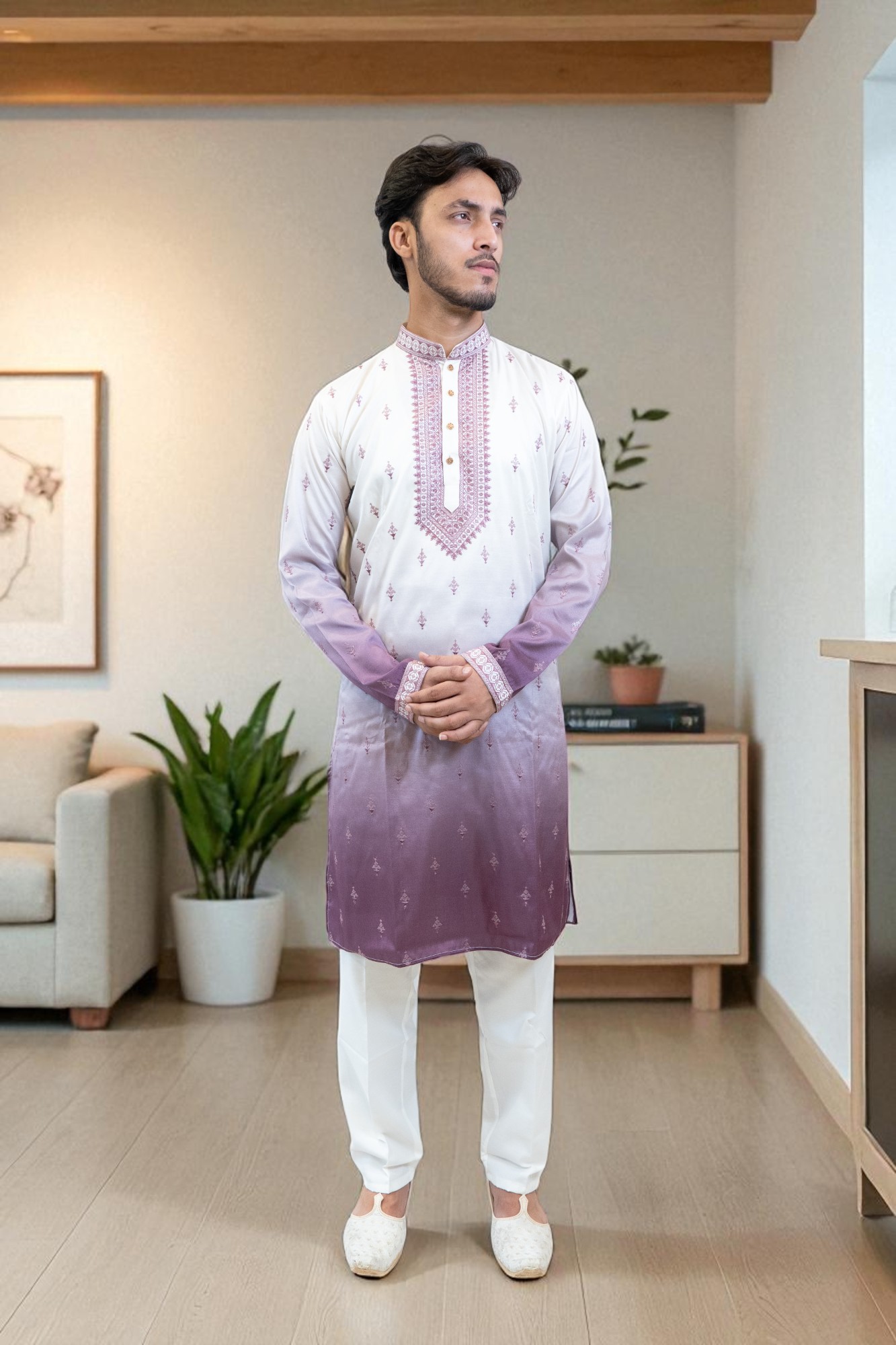 Add a vibrant touch to your festive wardrobe with the Spring Lilac Ombre Kurta Set. Featuring a stunning lilac gradient, an embroidered bandhgala neckline, and jewelled buttons, this kurta set blends traditional ethnic wear with modern elegance. Perfect for weddings, festive occasions, parties, and spring or summer events, it offers comfort and style all day. Pair with off-white jutis and a silver bracelet for a complete, polished look. A must-have men’s ethnic wear for style and sophistication.