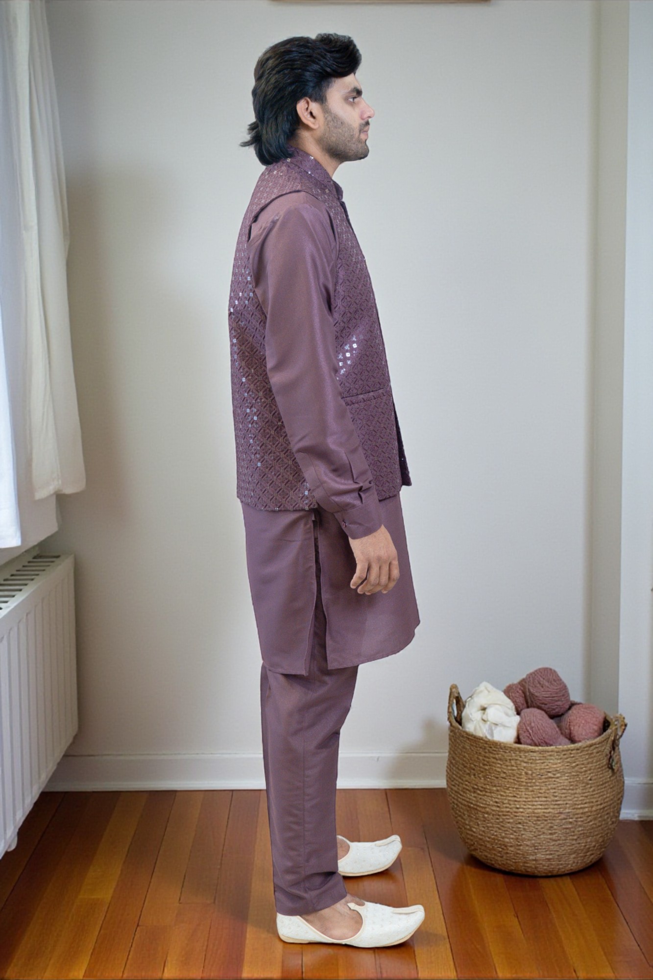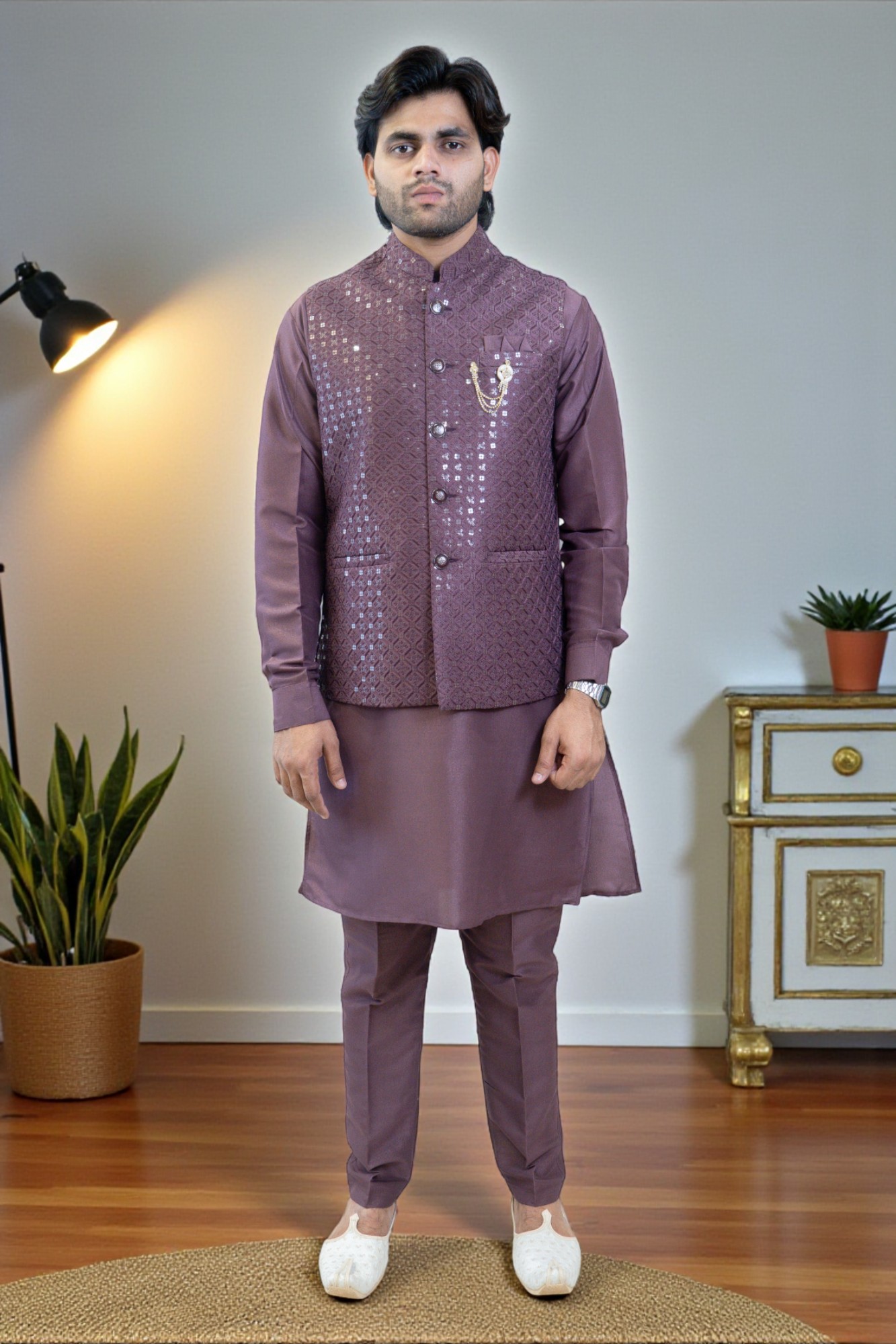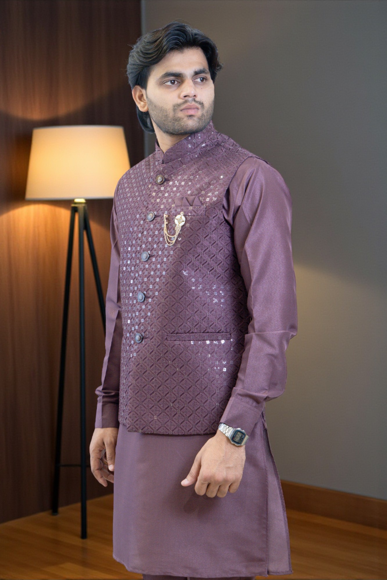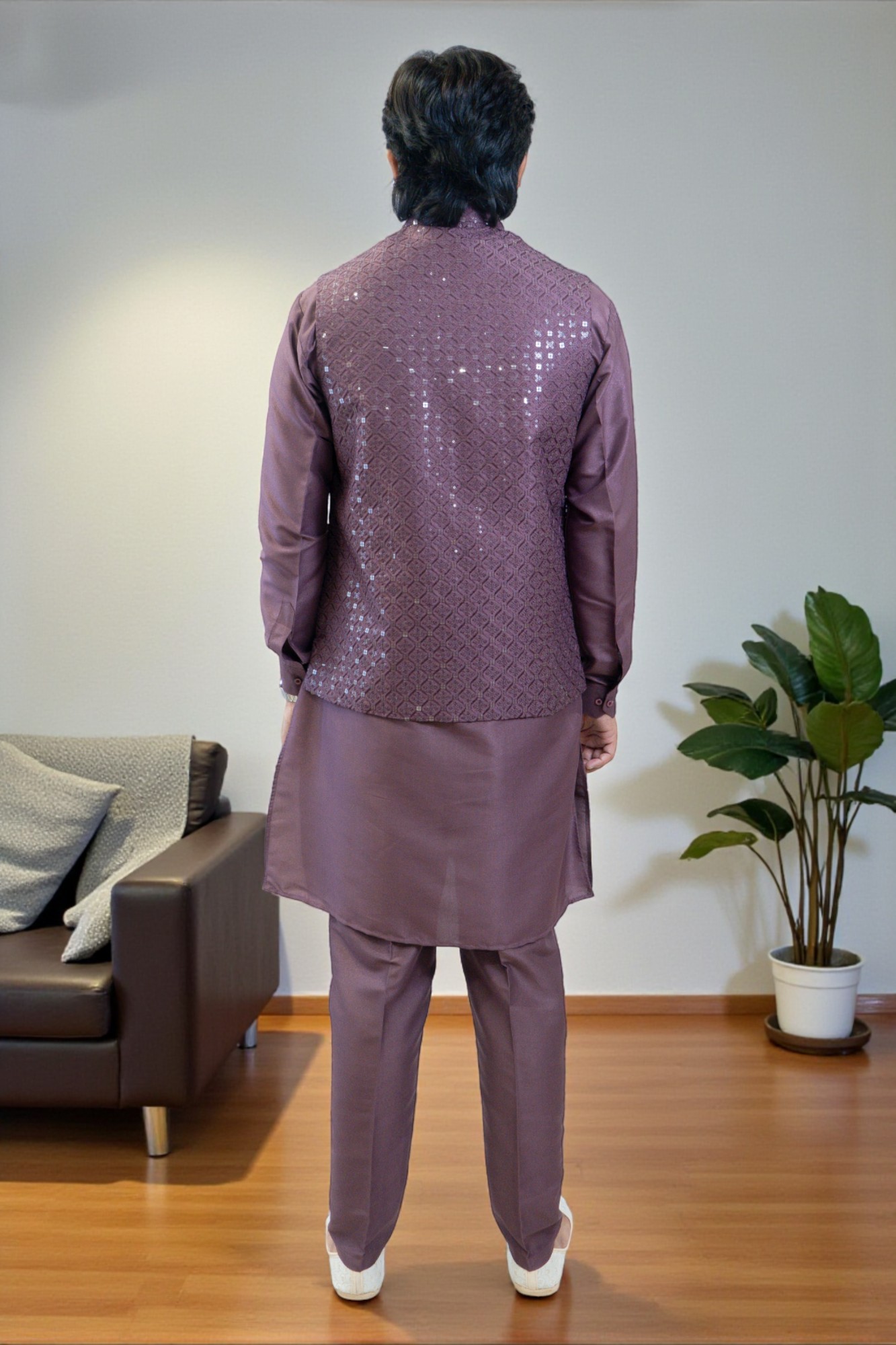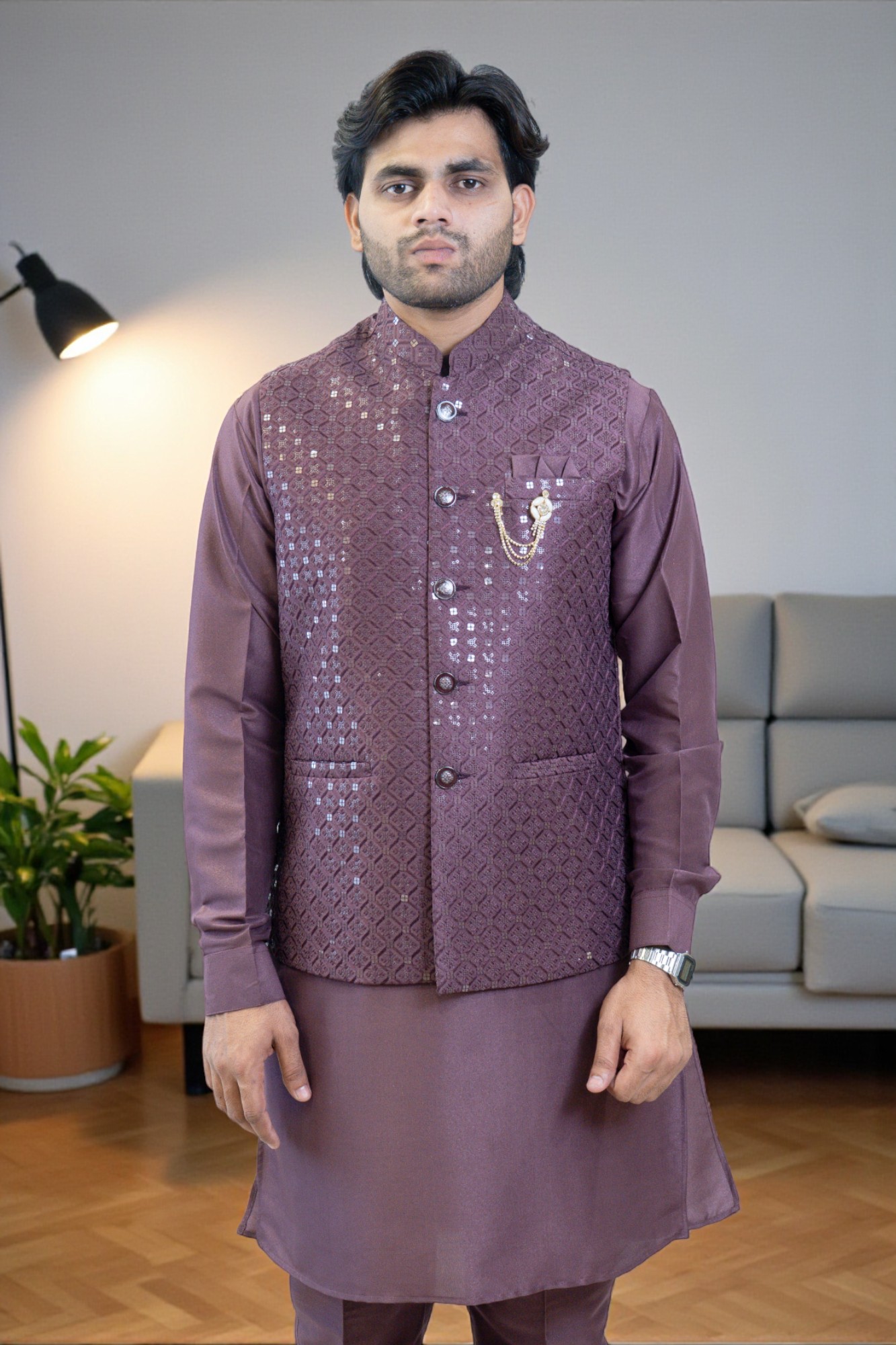 Wine Kurta Jacket Set for Men – Rayon Silk Kurta with Sequin Design Jacket